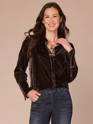Shiny, chic, and sure to go with everything in your wardrobe. This velvet woven shirt features long sleeves with French cuffs, a collared neck, and a button front.
