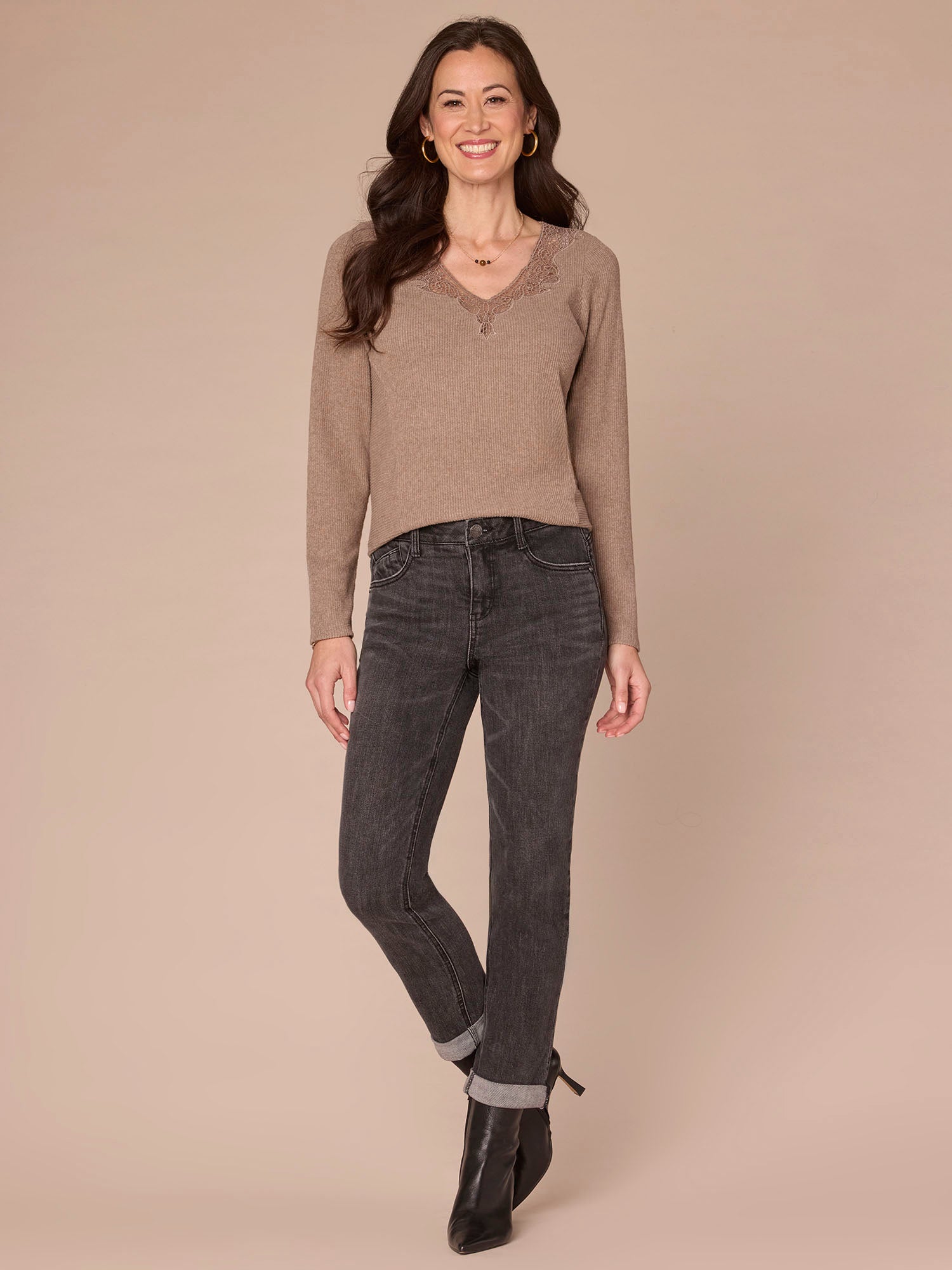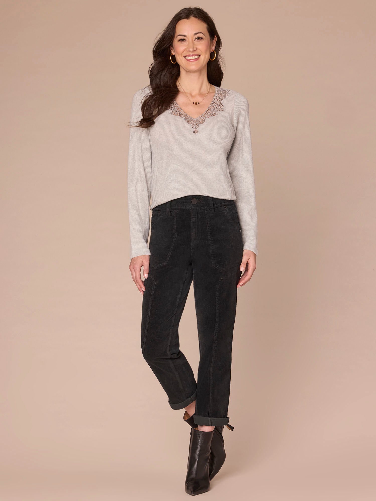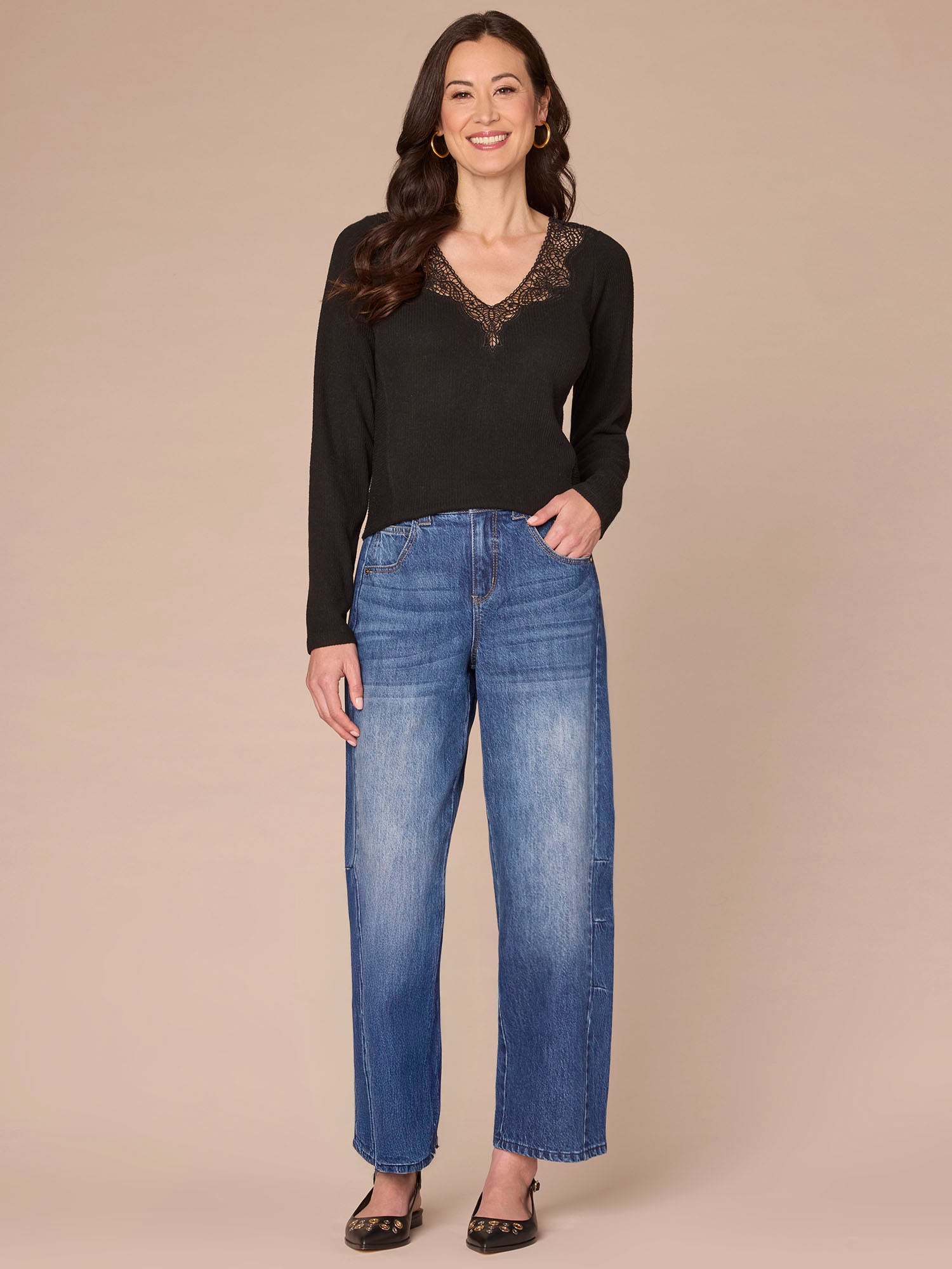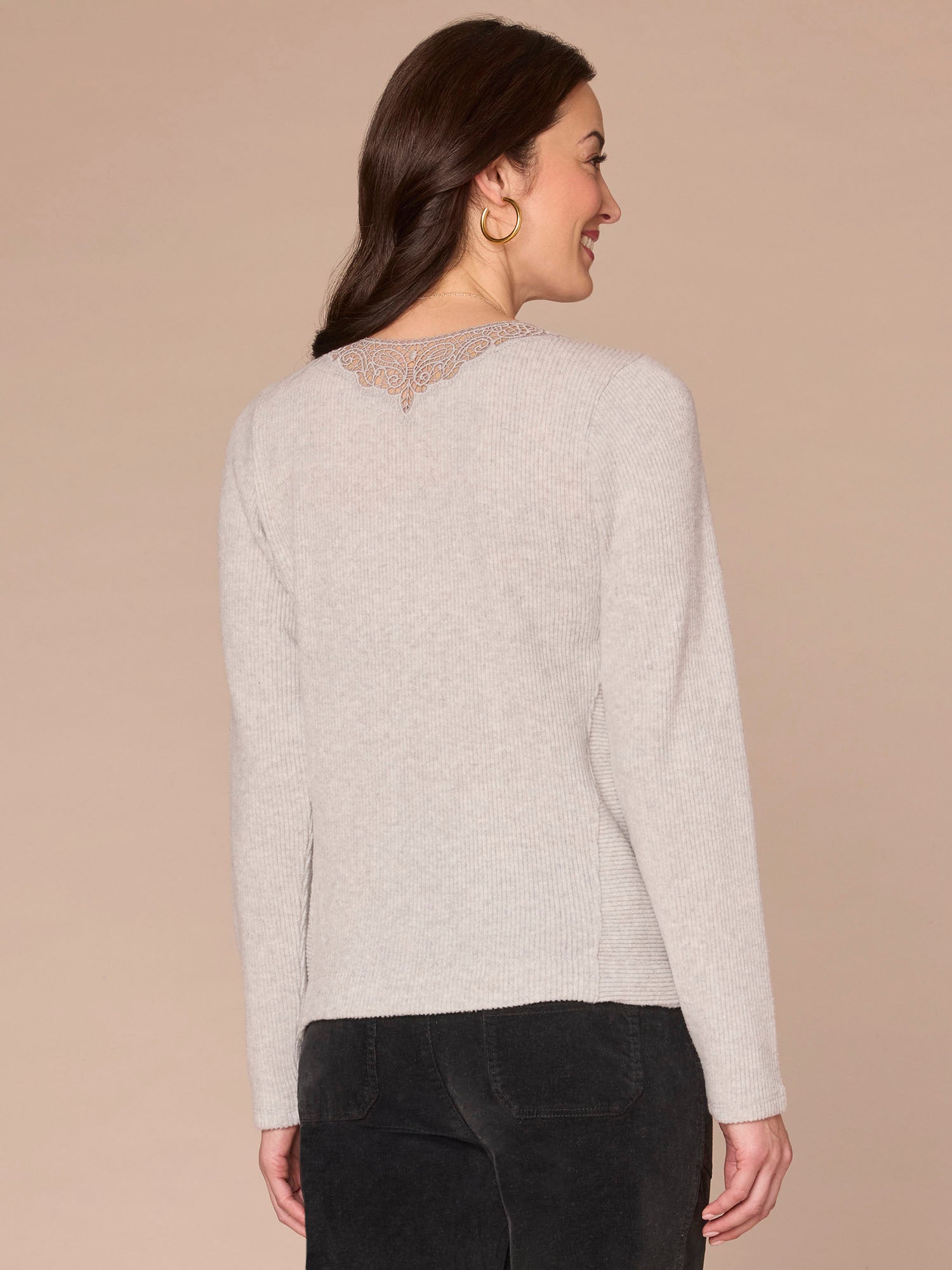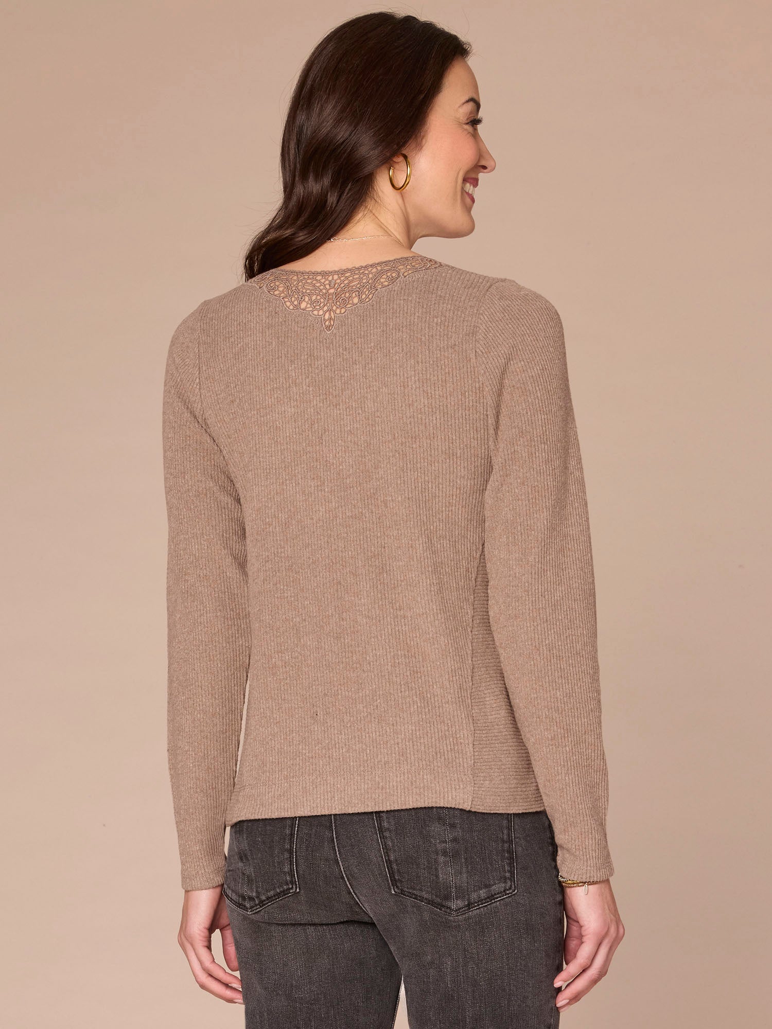 Dress things up a bit while keeping comfy in this knit top. Its long sleeves and straight hem are basic, but the crochet V-neck and seaming details kick it up a notch.