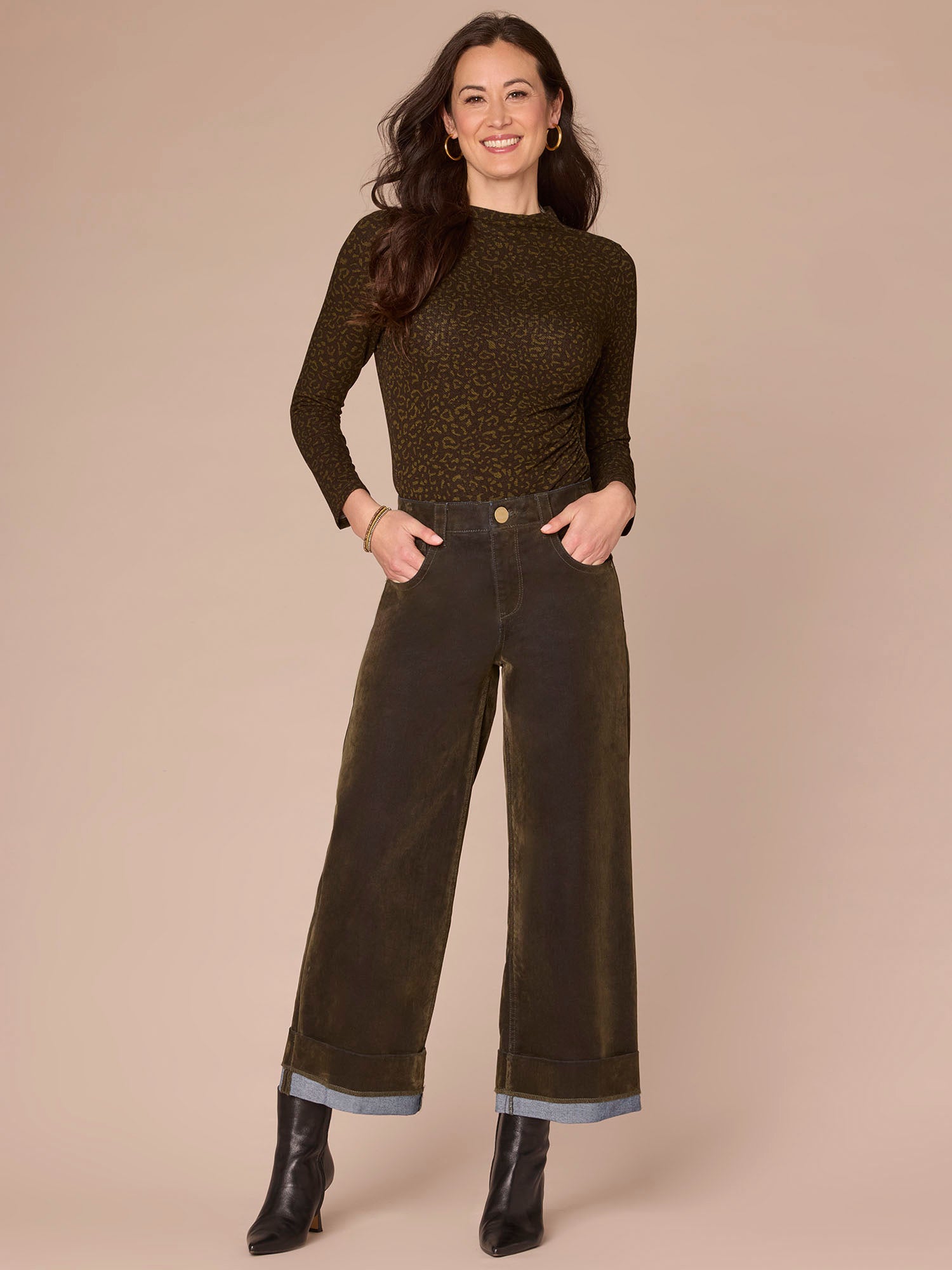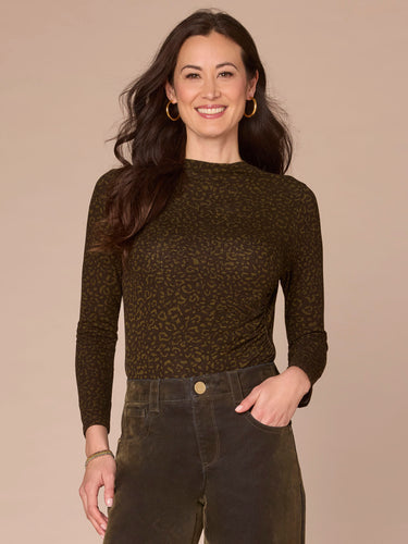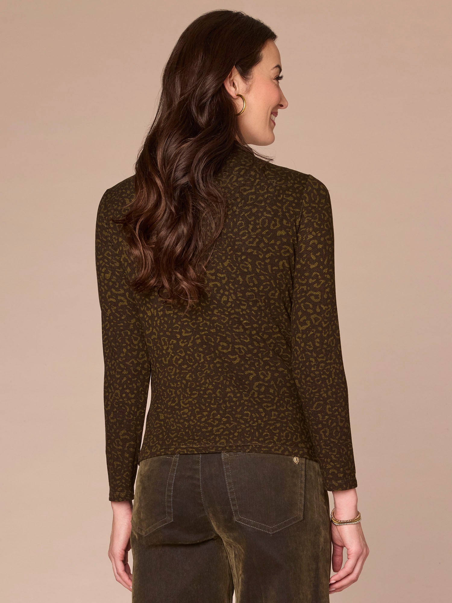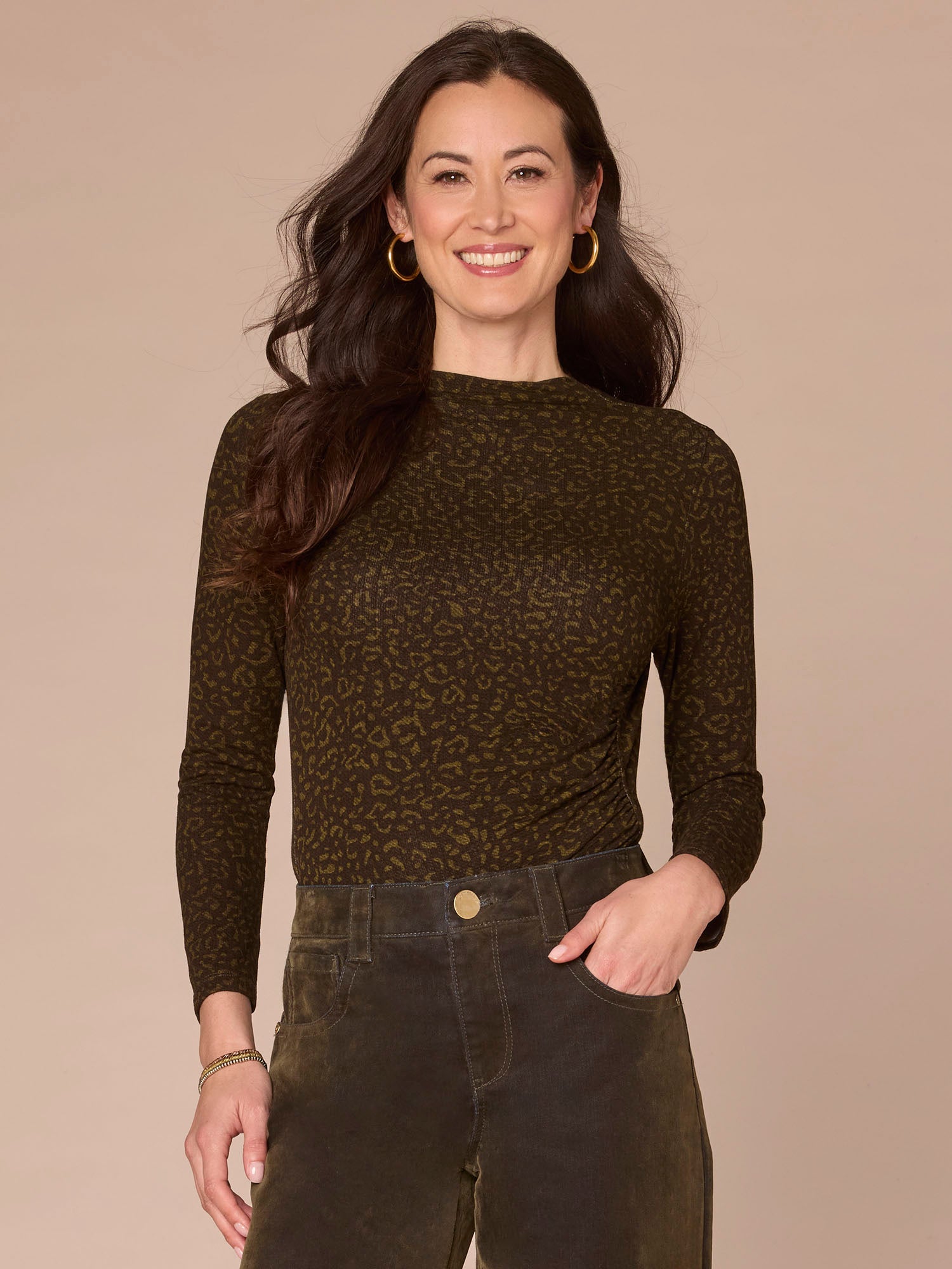 Sleek and easy to style, this knit top is an eye-catching must-have. It features long sleeves, a mock neck, asymmetrical side ruching details, and a subtle animal print.