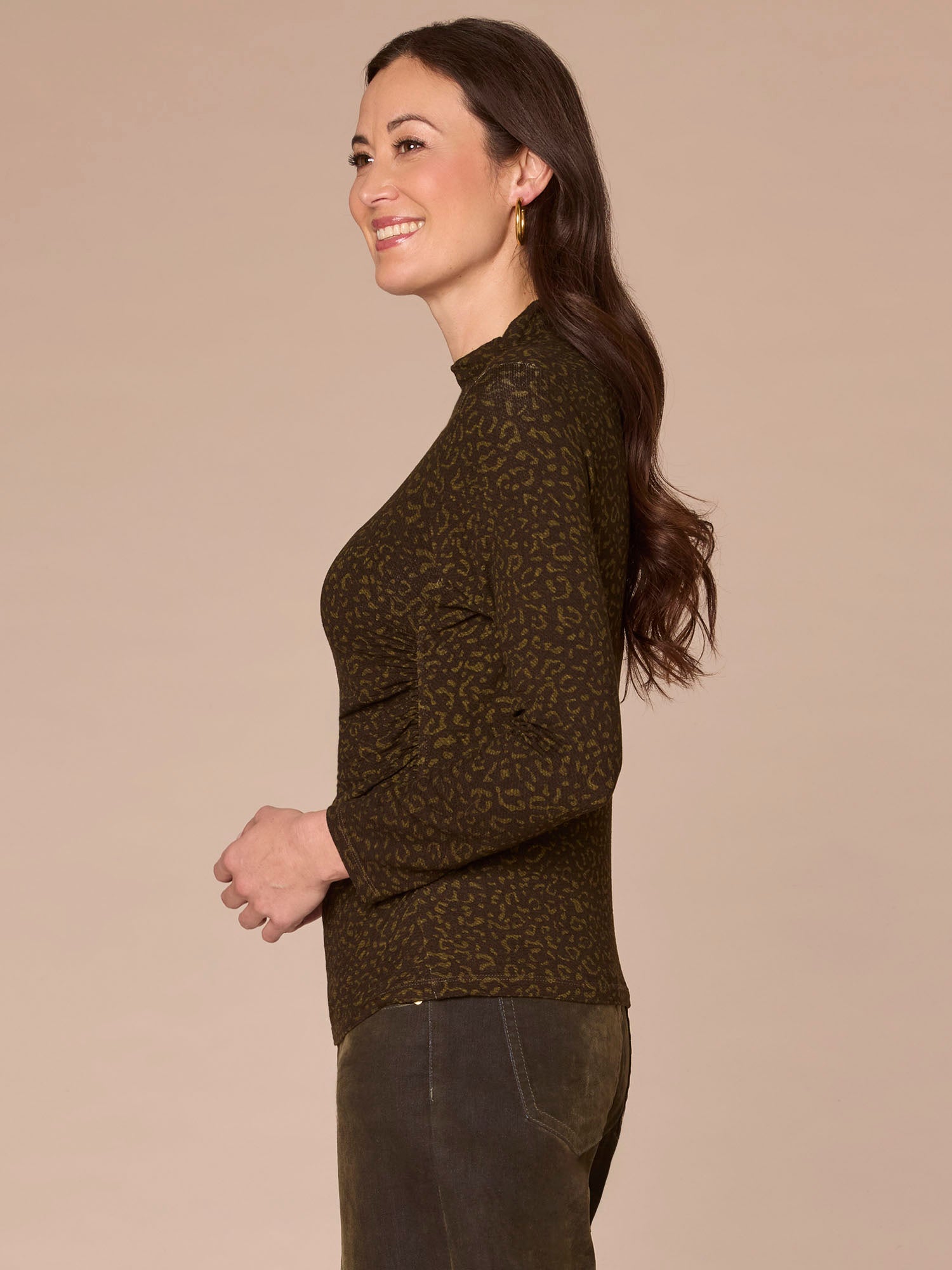 Long Sleeve Mock Neck Asymmetrical Side Ruching Animal Print Knit Top