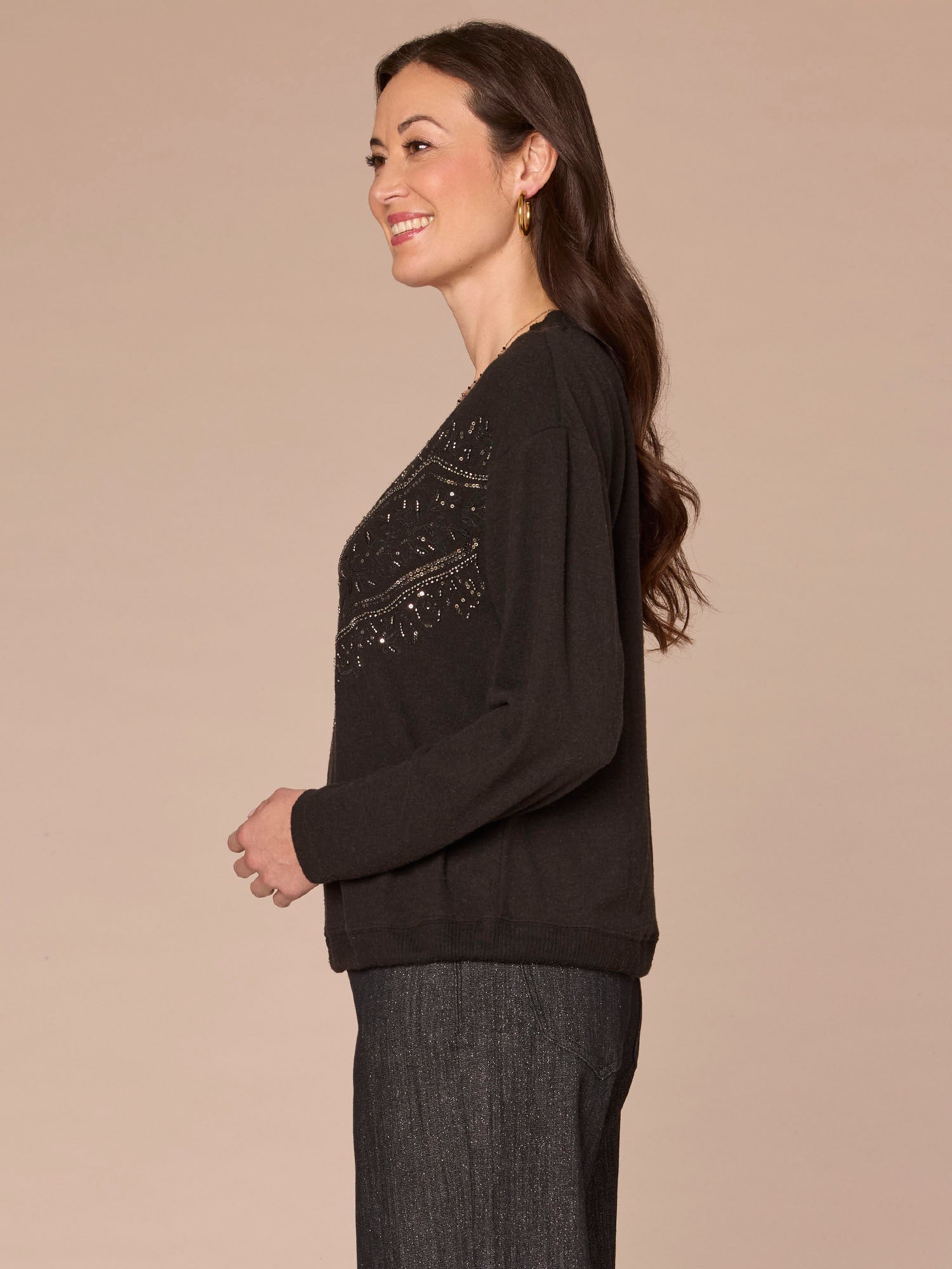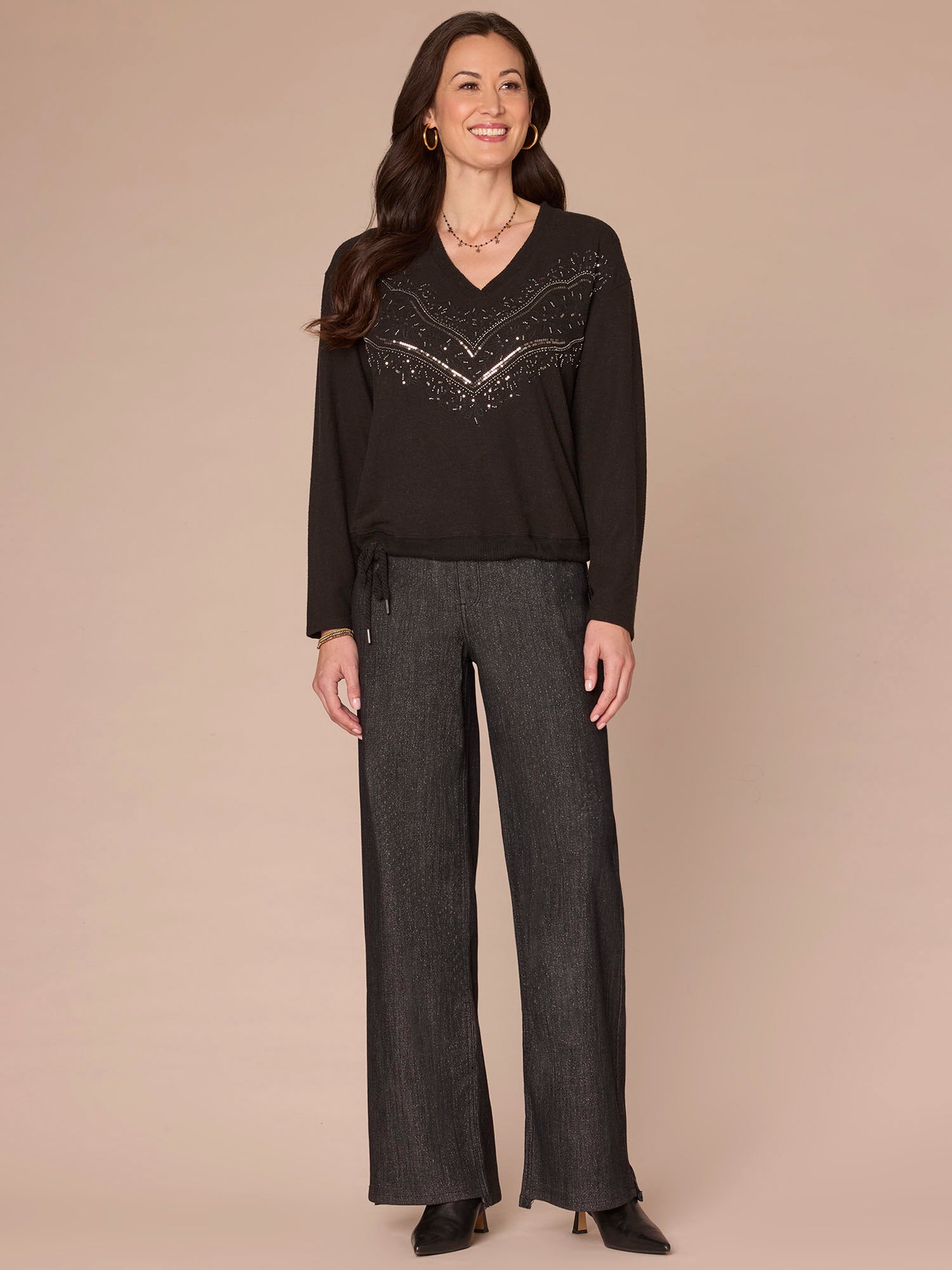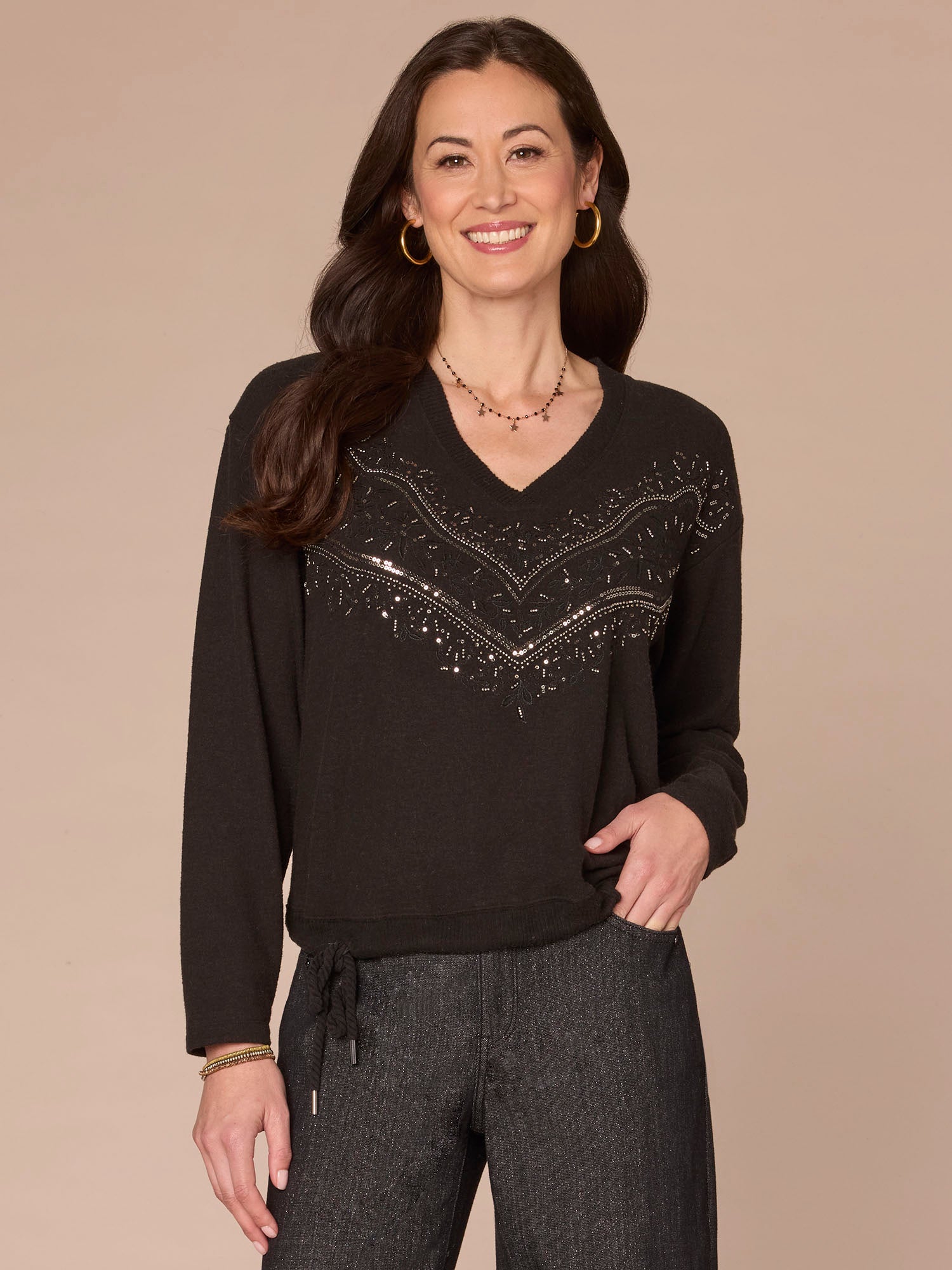 Long Sleeve V-Neck Cased Hem Top with Embroidered Sequins