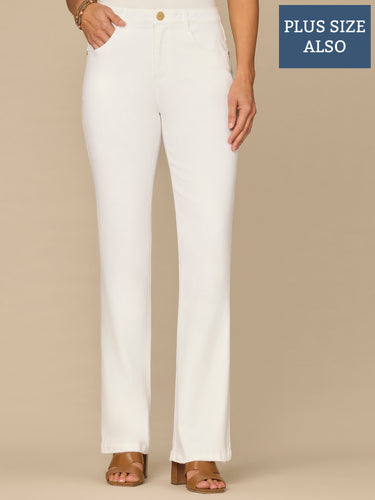 The plus-size Itty Bitty Bootcut jean in optic white is fitted from the hips to calves, with a baby bootcut leg opening that creates a lengthening effect. Engineered with "Ab"solution® fit technology to smooth, support, and enhance your shape—giving you everything from a flatter tummy to a perkier rear view.