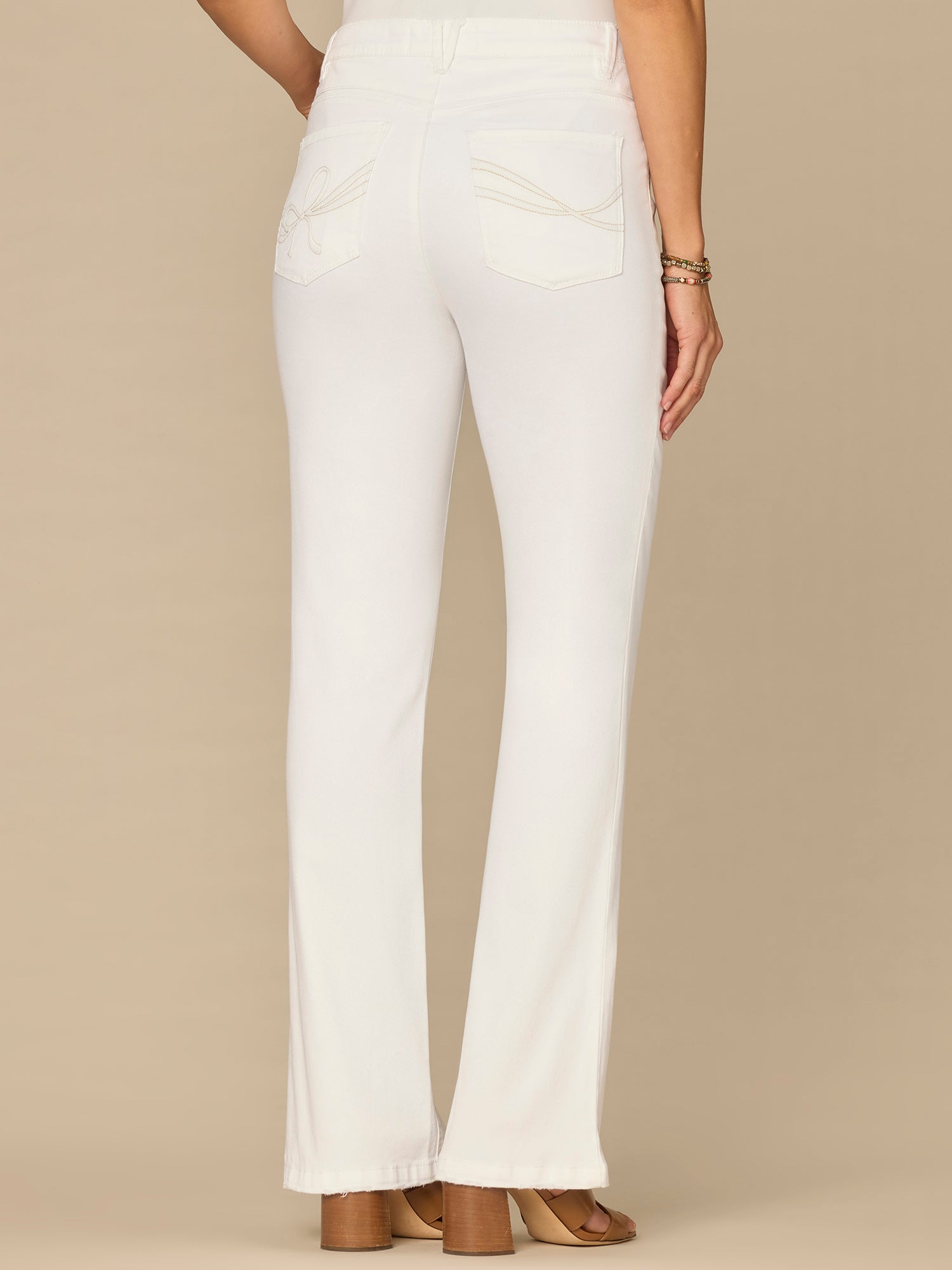 • Five-pocket styling with embroidered bow back pockets