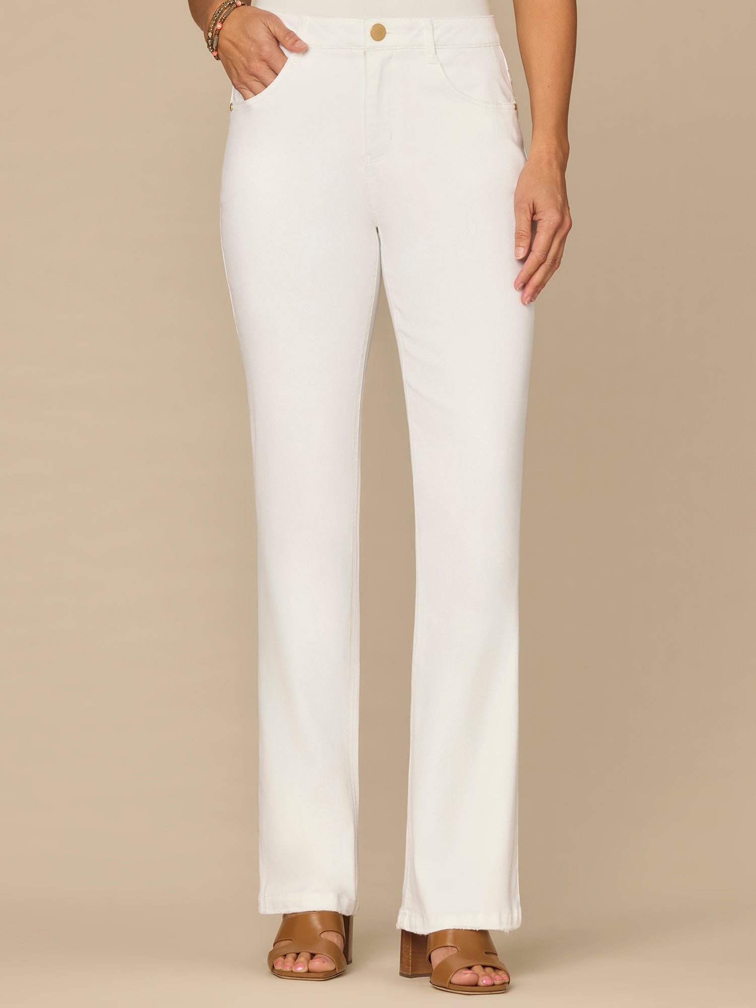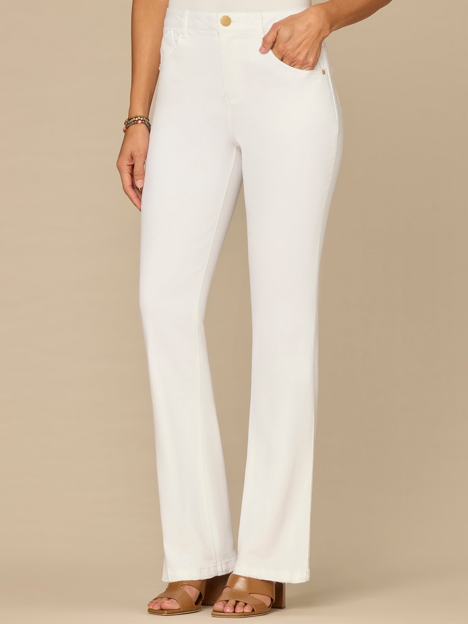 The Itty Bitty Bootcut jean in optic white is fitted from the hips to calves, with a baby bootcut leg opening that creates a lengthening effect. Engineered with "Ab"solution® fit technology to smooth, support, and enhance your shape—giving you everything from a flatter tummy to a perkier rear view.