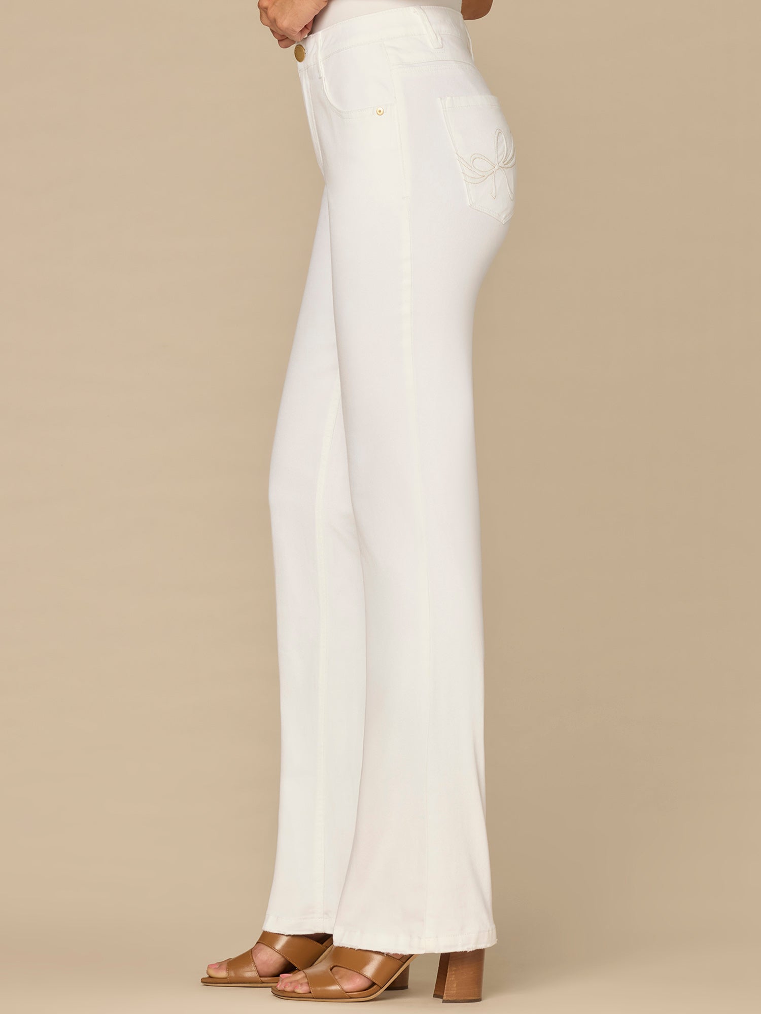 • Five-pocket styling with embroidered bow back pockets