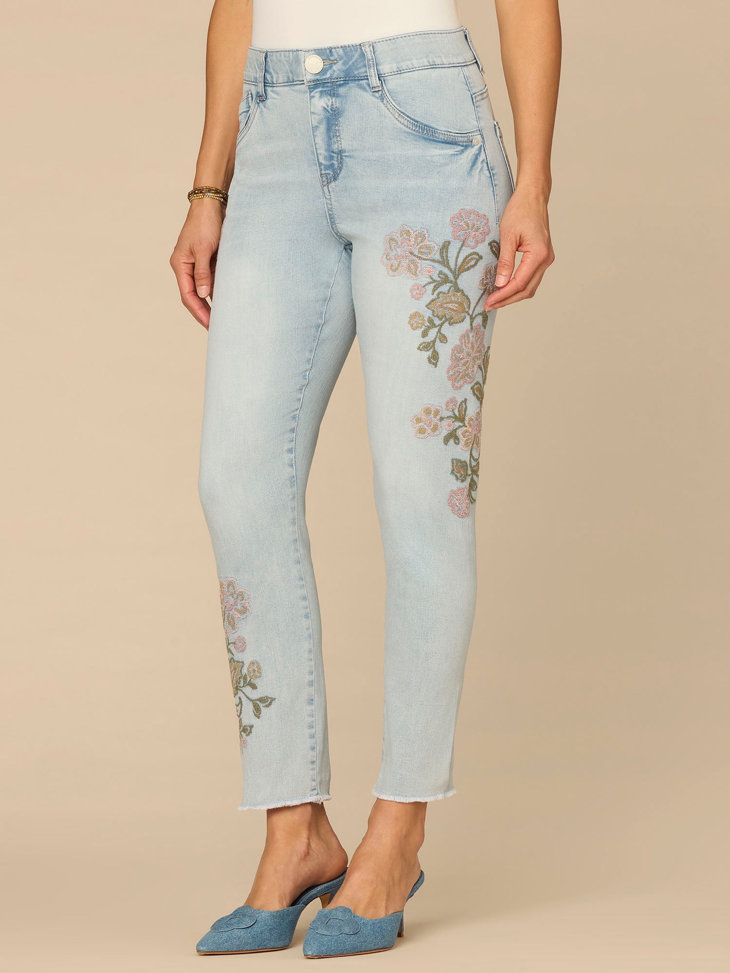 Our petite Ankle Skimmer is an incredibly versatile skinny with a curve-hugging fit from hips to hem. Wear it cropped or release the cuff for an ankle-skimming length. Featuring a seamless design, multi color floral embroidery, and "Ab"solution® fit technology to smooth, support, and enhance your shape—giving you everything from a flatter tummy to a perkier rear view.