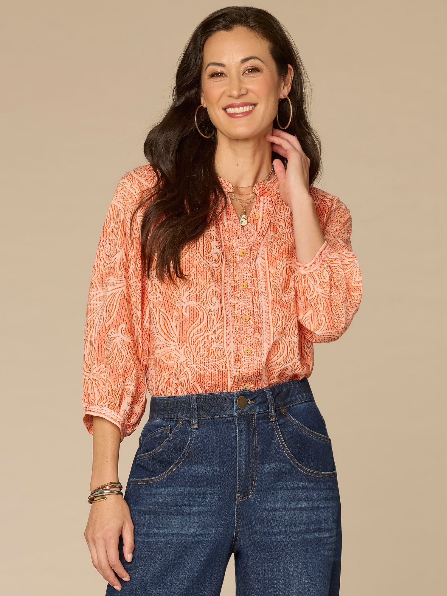Quick viewBlouson Sleeve Stand Collar Button Down Printed Petite Woven Top $78.00 USD /Vintage Coral PapayaAvailable in 1 color