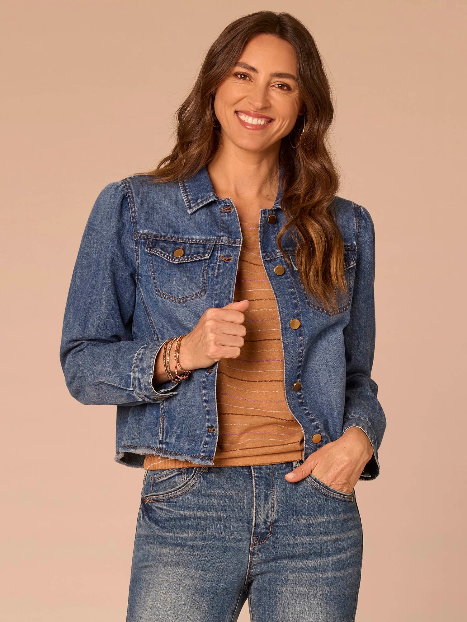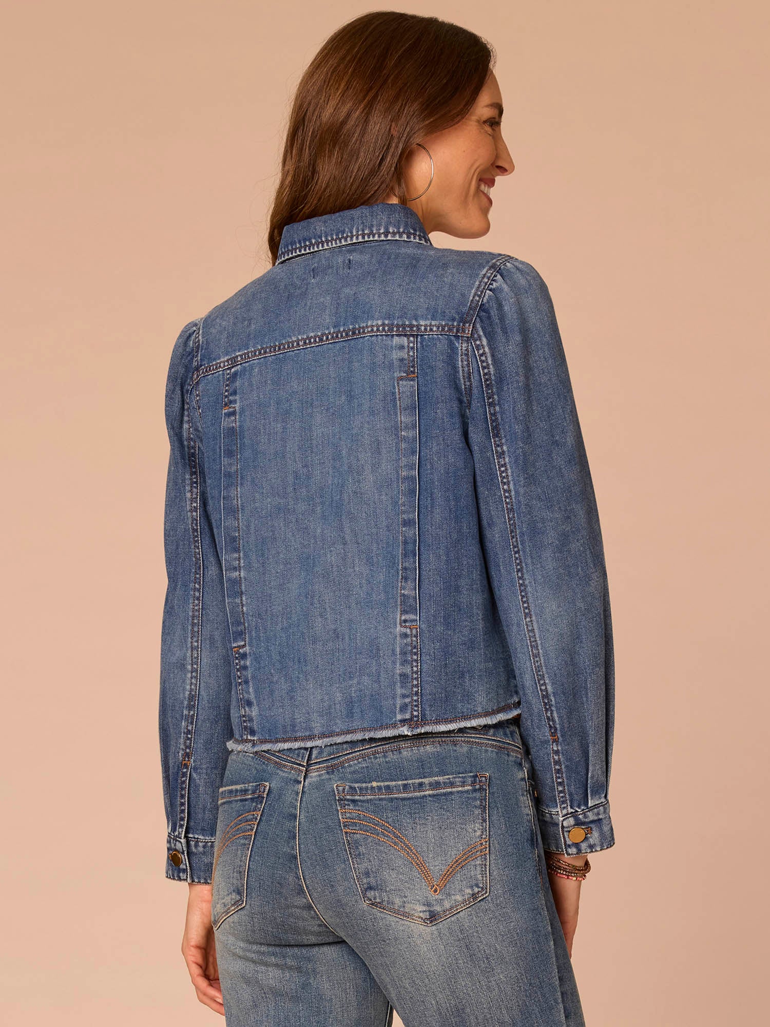 With long puff sleeves, a button up front, angled seaming, and a curved fray hem, this denim jacket is made for effortless layering. Style it with mid blue jeans for a denim on denim moment.