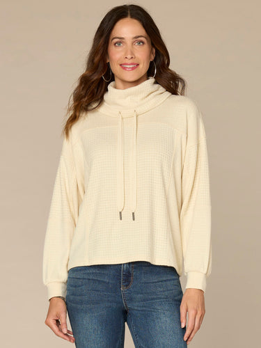 Long blouson sleeves, a cowl neck with ties, and seaming details ensure this mixed media knit top is as on-trend as it is comfortable. Slip into this style during breezy outdoor gatherings and days spent lounging at home.