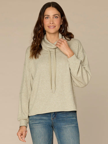 Long blouson sleeves, a cowl neck with ties, and seaming details ensure this mixed media knit top in petite sizing is as on-trend as it is comfortable. Slip into this style during breezy outdoor gatherings and days spent lounging at home.