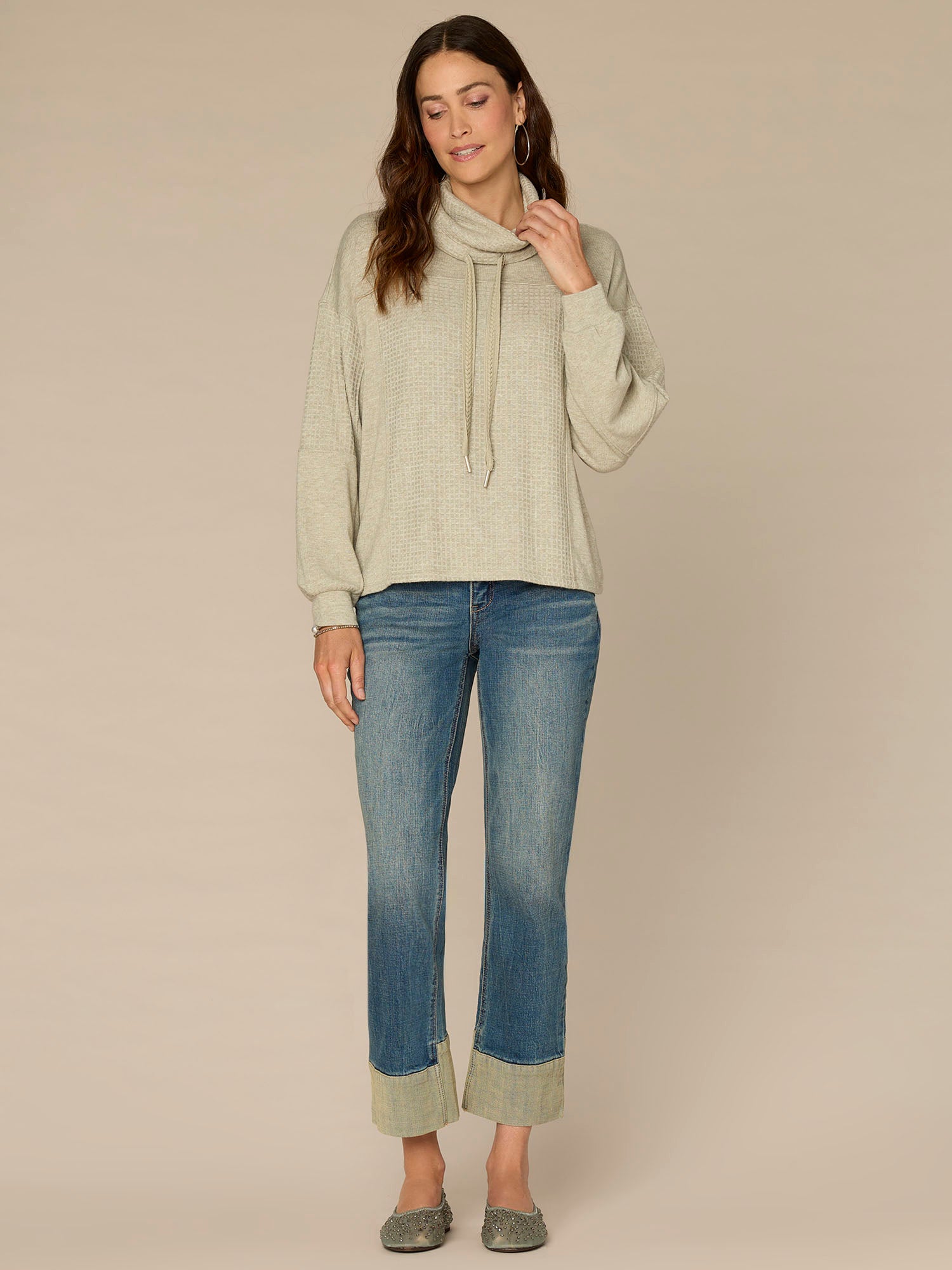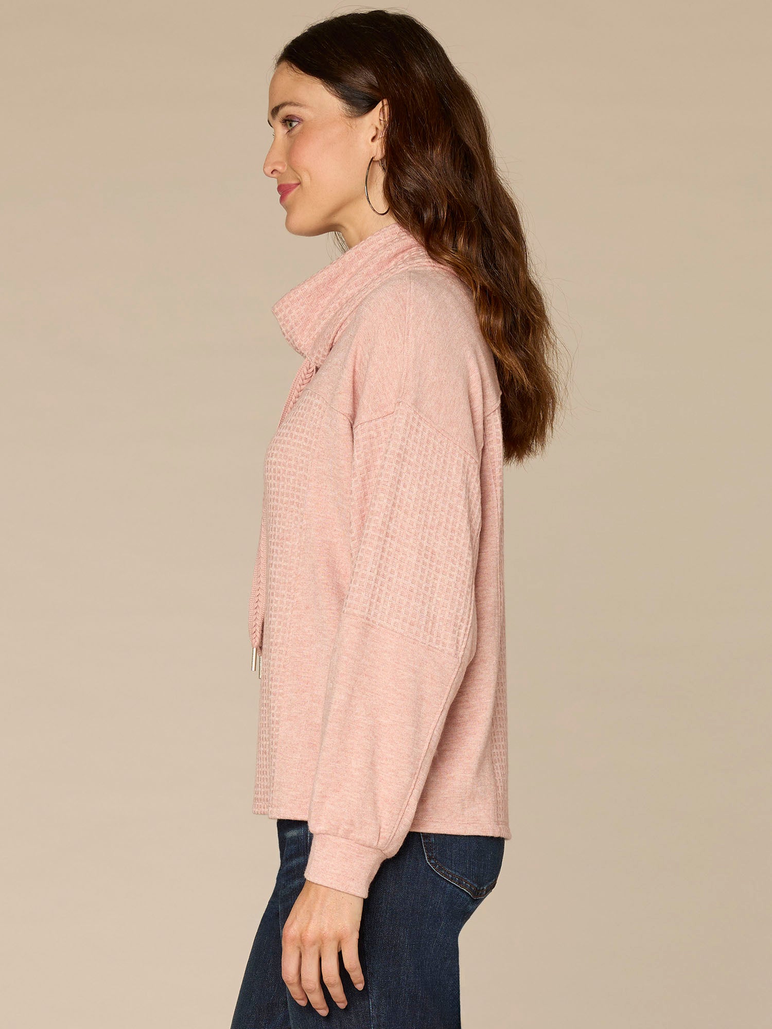 Long blouson sleeves, a cowl neck with ties, and seaming details ensure this mixed media knit top in petite sizing is as on-trend as it is comfortable. Slip into this style during breezy outdoor gatherings and days spent lounging at home.