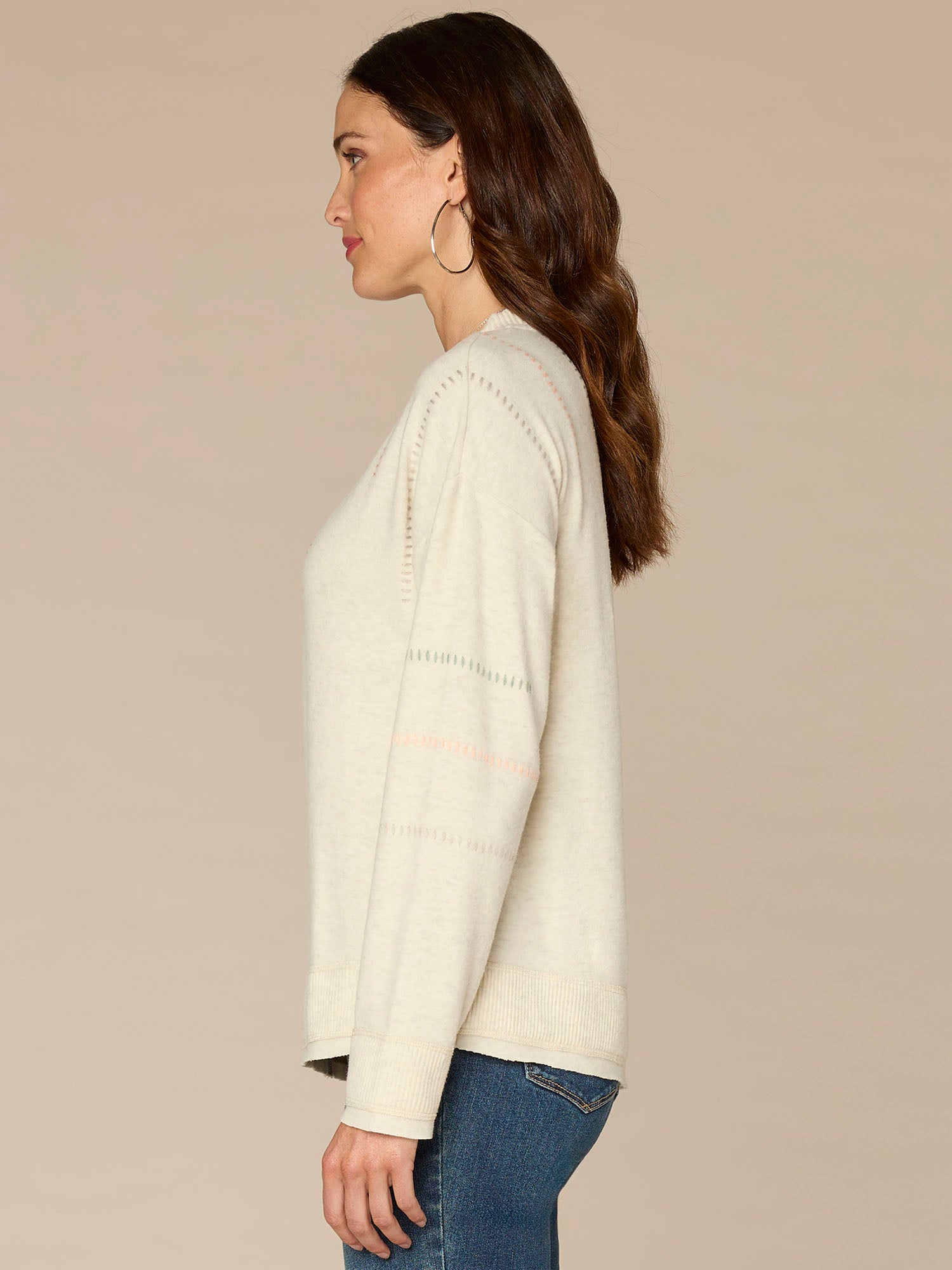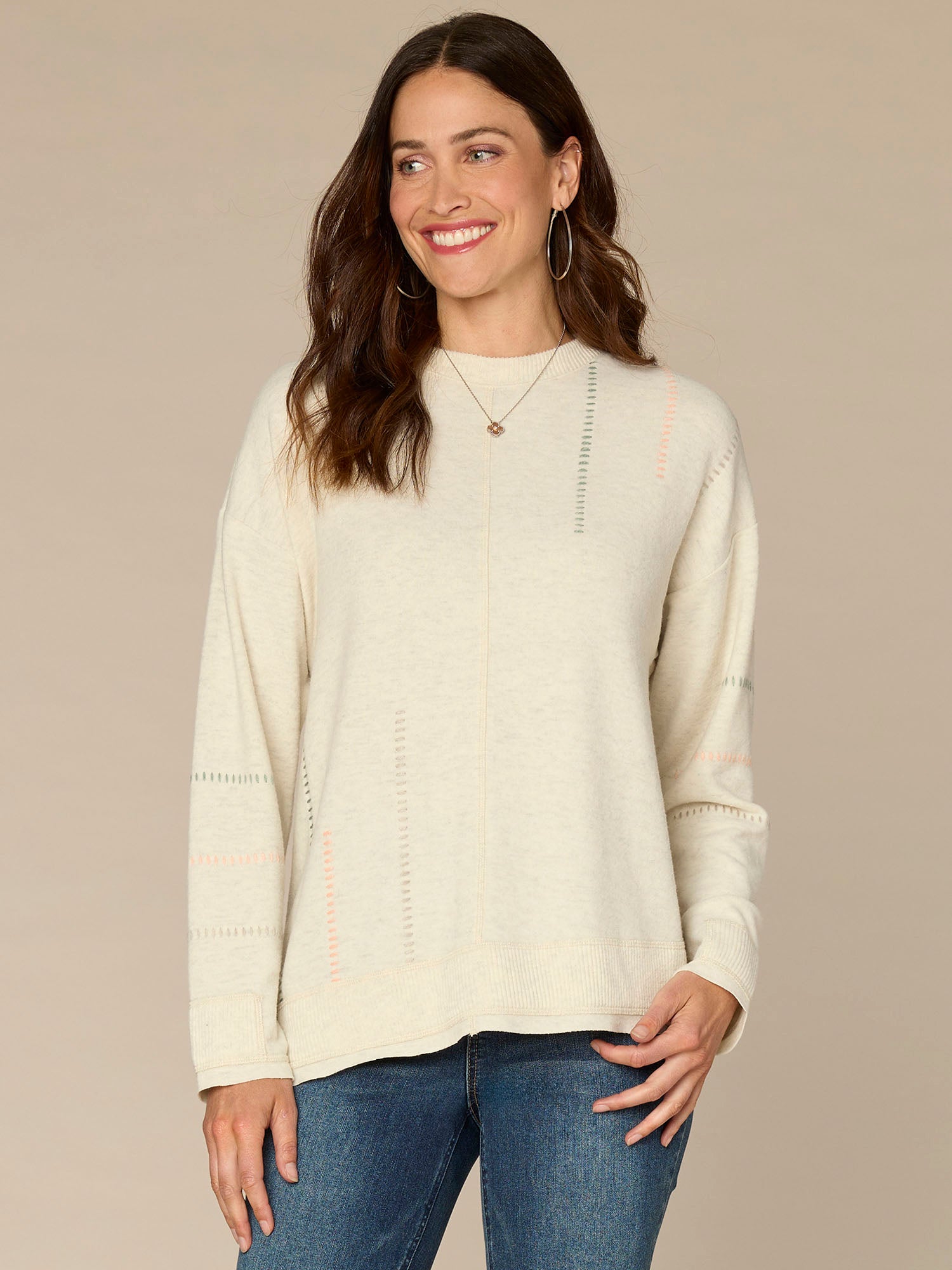 Long Sleeve Scoop Neck Asymetrical Hem Embroidered Petite Knit Top