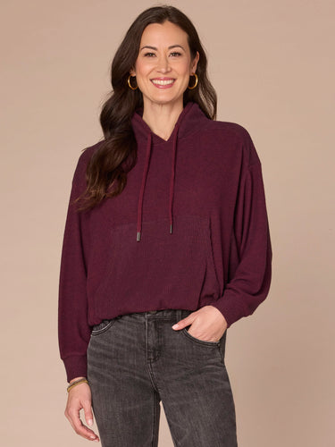 Like a hoodie but with more intentional details, this mixed media knit top is an easy style to reach for when you want to be cozy. It has long banded sleeves, a stand collar with a tie, kangaroo pocket front, and a bubble hem.