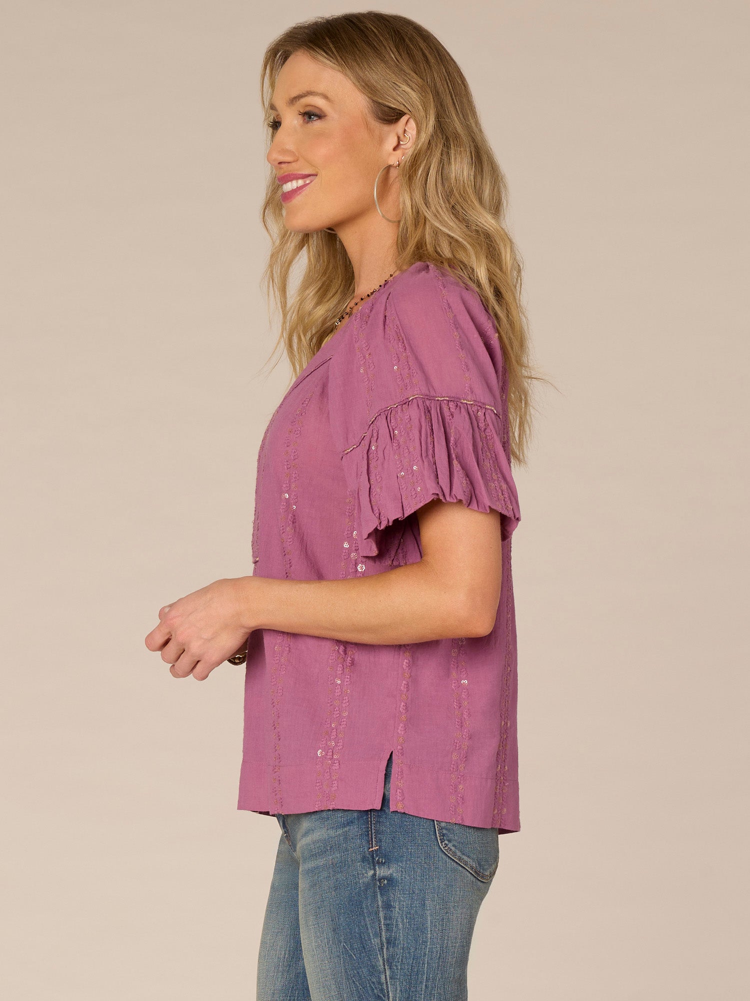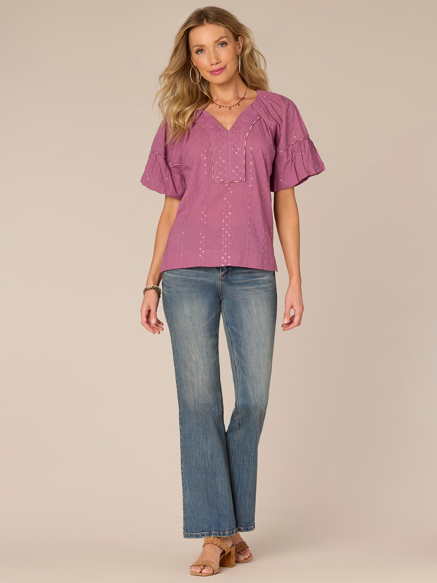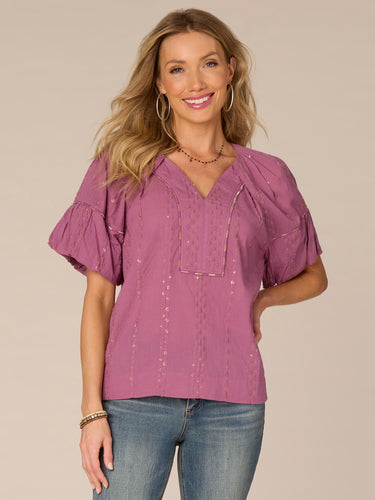 Comfortable meets classy in this elevated short bubble sleeve woven top. It features a spliced V-neck, sequins, an embroidered placket, and a sheer fabric that’s perfect for layering.