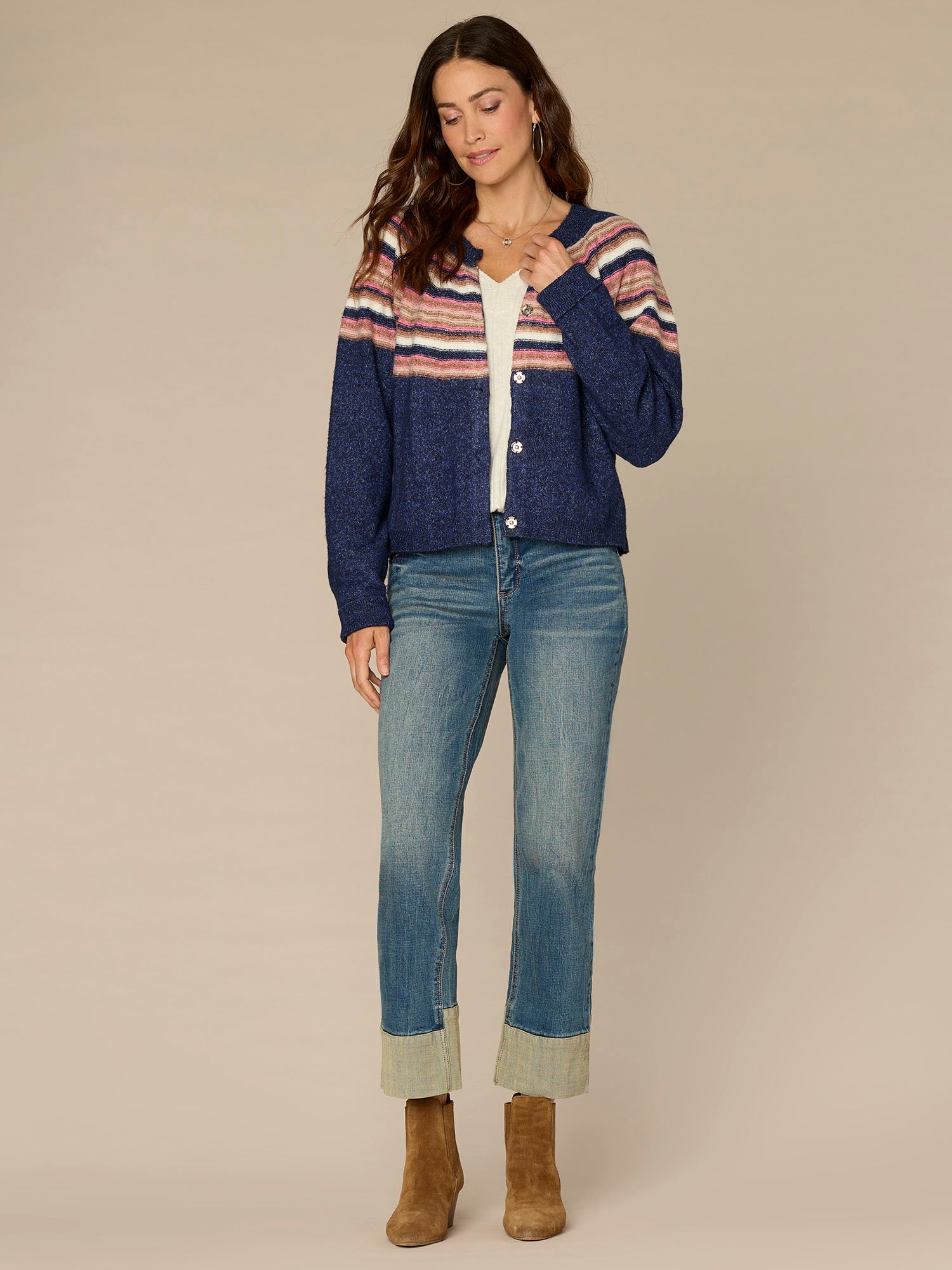 Long Sleeve Round Neck Snap Front Striped Petite Sweater Cardigan