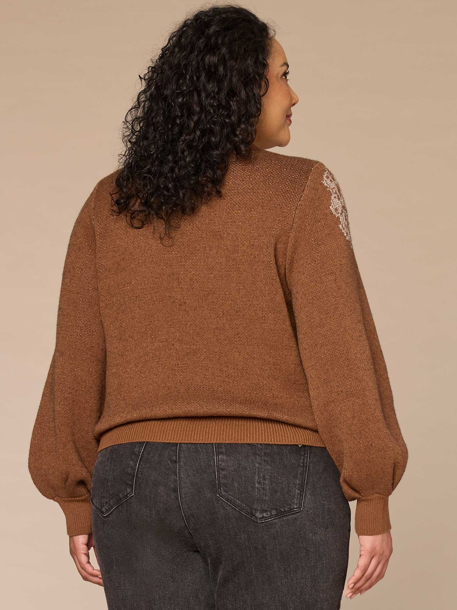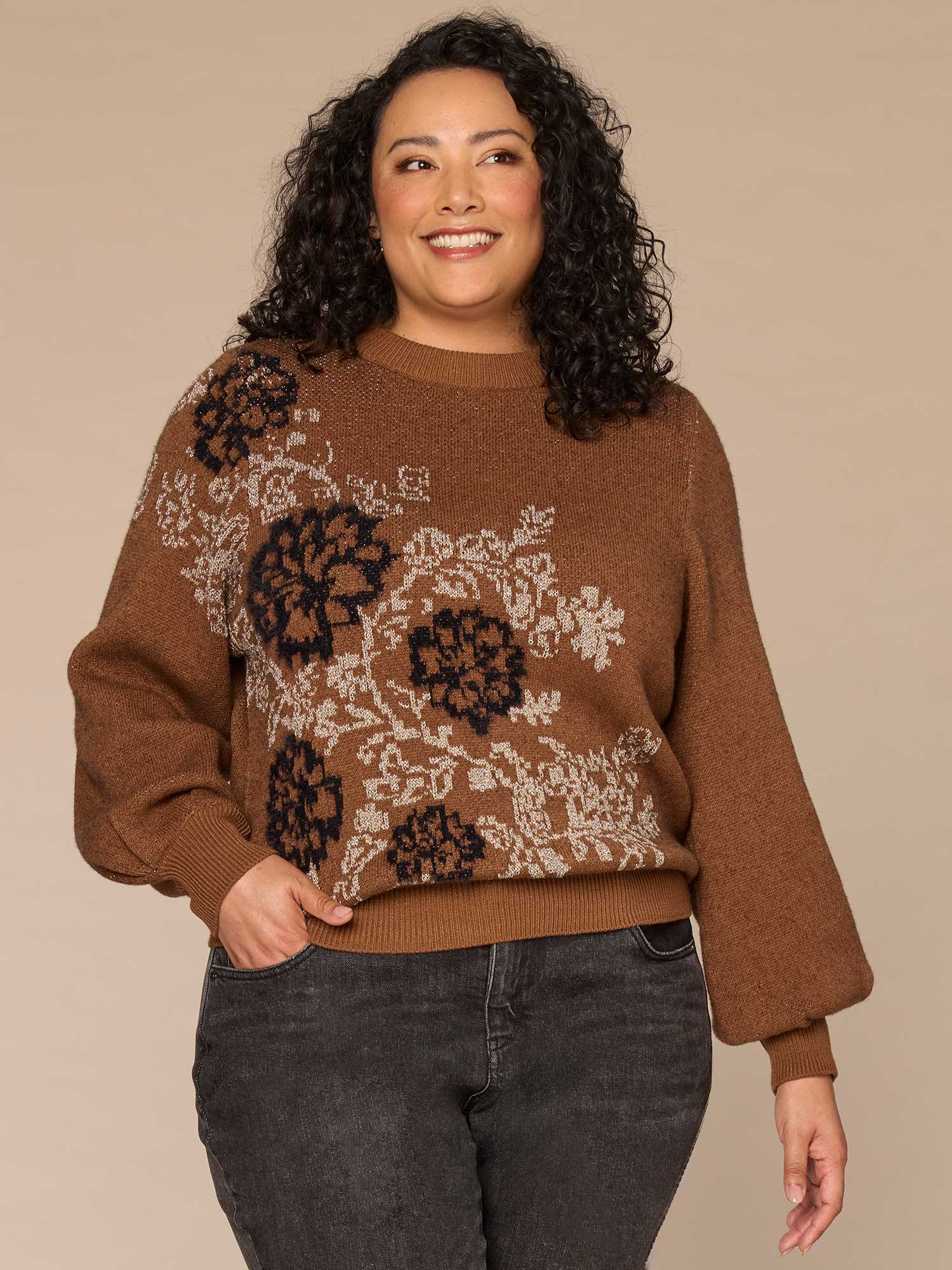 This is the jacquard sweater in plus sizing you’ll be glad to have for chilly days. It features long pleated blouson sleeves, a round banded neck, and a pretty, shiny placement floral design on the front.