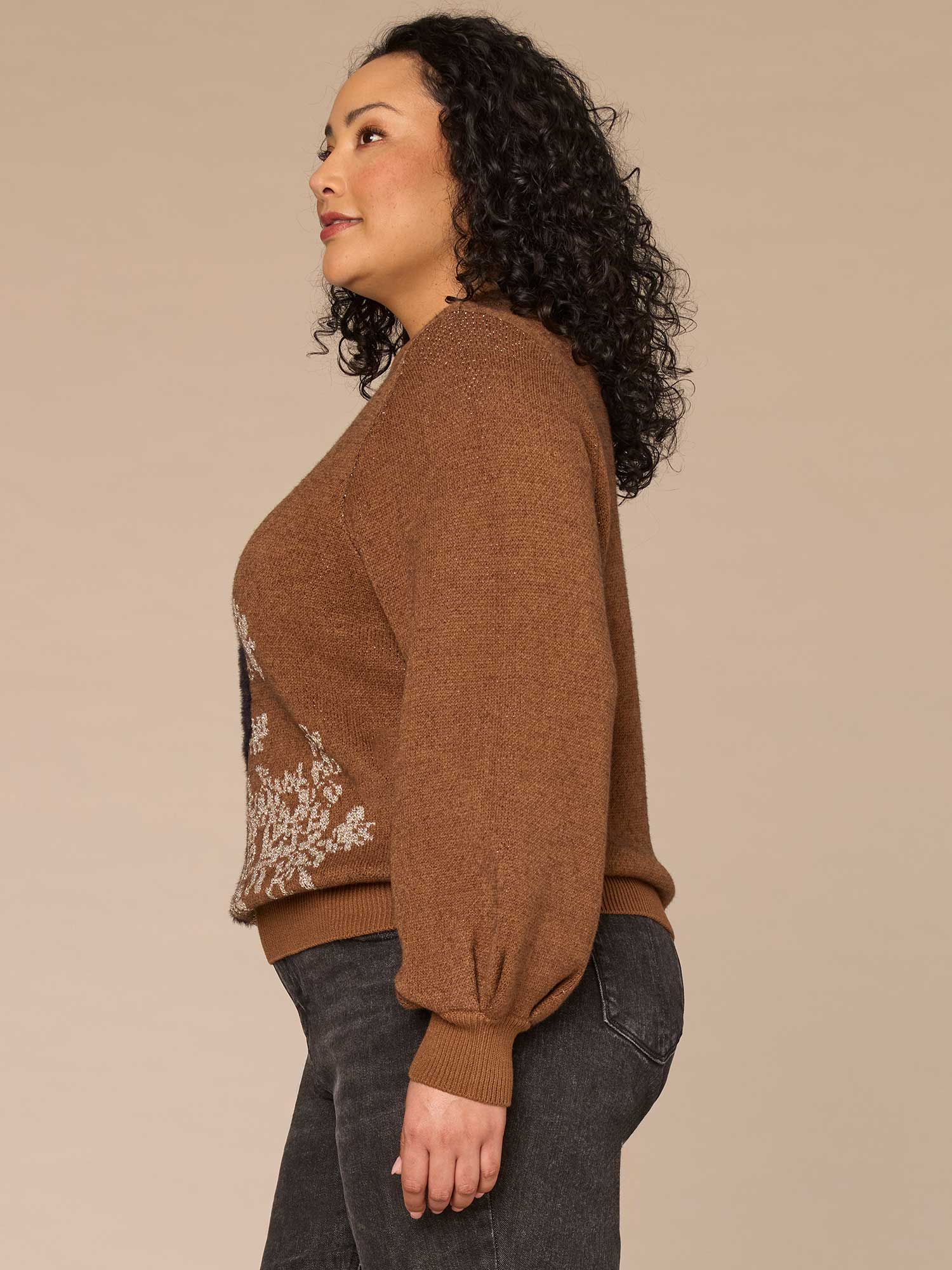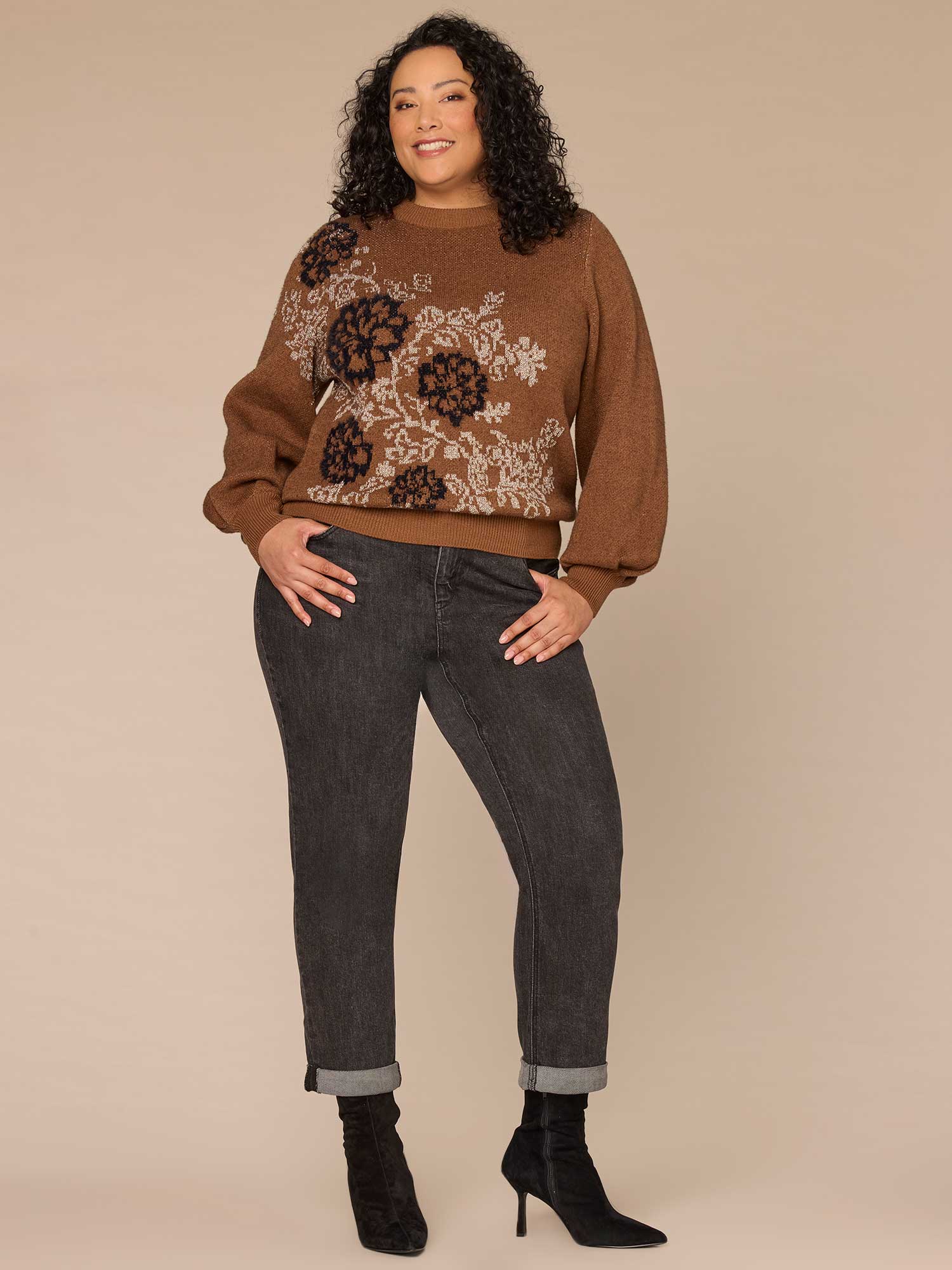 Long Blouson Sleeve Mock Neck Floral Plus Size Jacquard Sweater