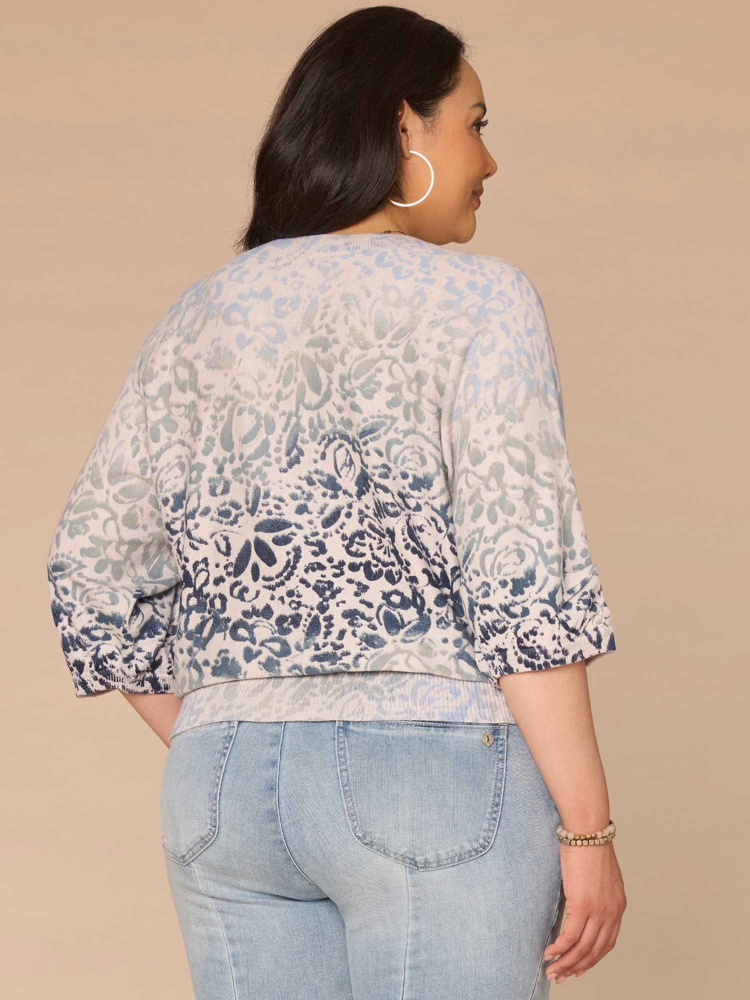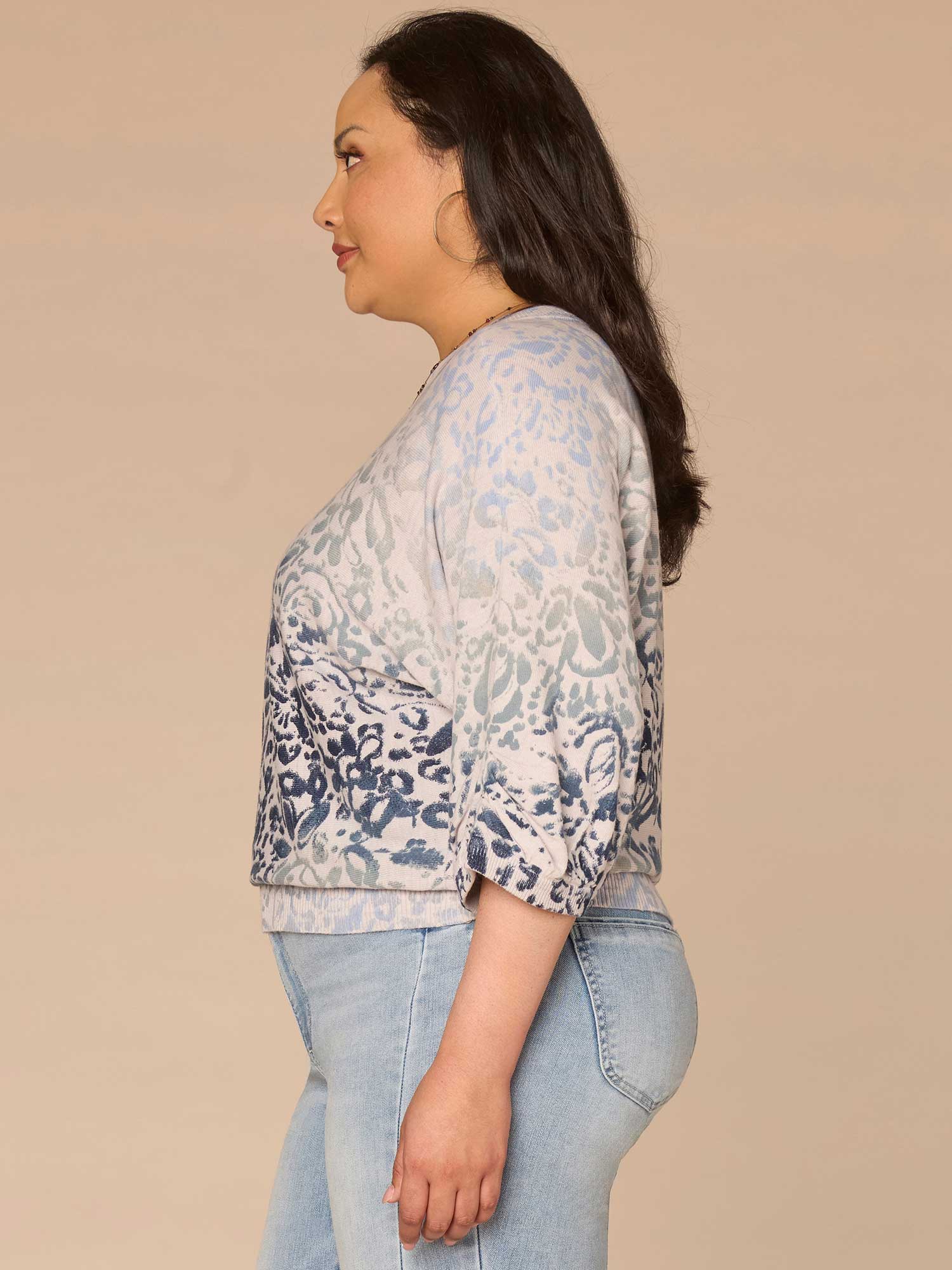Whether you’re going out or staying in, this plus-size sweater top is an easy wardrobe go-to. Its three quarter dolman sleeves with pleats, round neck, and ombre abstract placement print give it all the details your look needs.