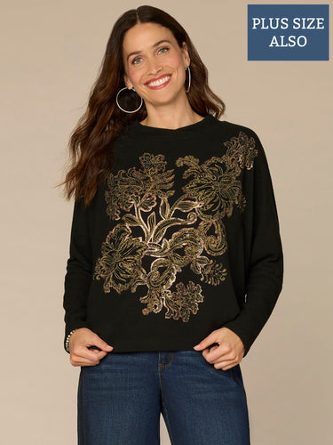 Look and feel your best from Sunday lounging to mid-week plans in this plus-size fog foil screen printed knit top. It has long batwing sleeves, a surplus round neck, and a back center seam.