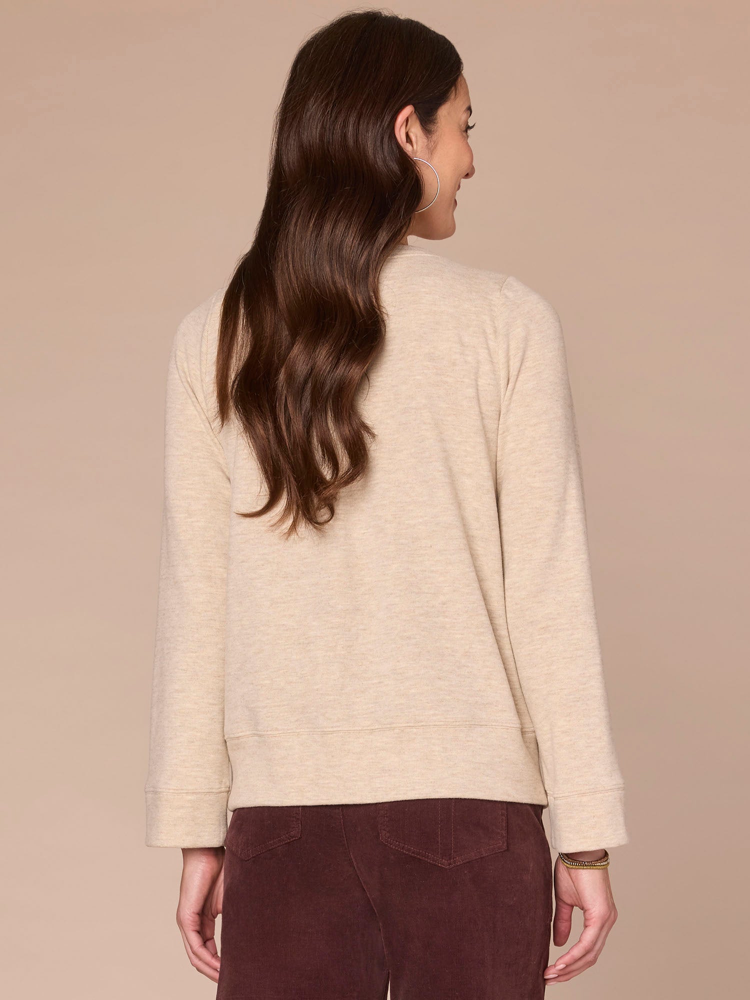 This may be the softest knit top of the season. It features long bell sleeves, an overlap boat neck, and a subtle floral embroidery detail in a neutral heather oatmeal hue that goes with everything.
