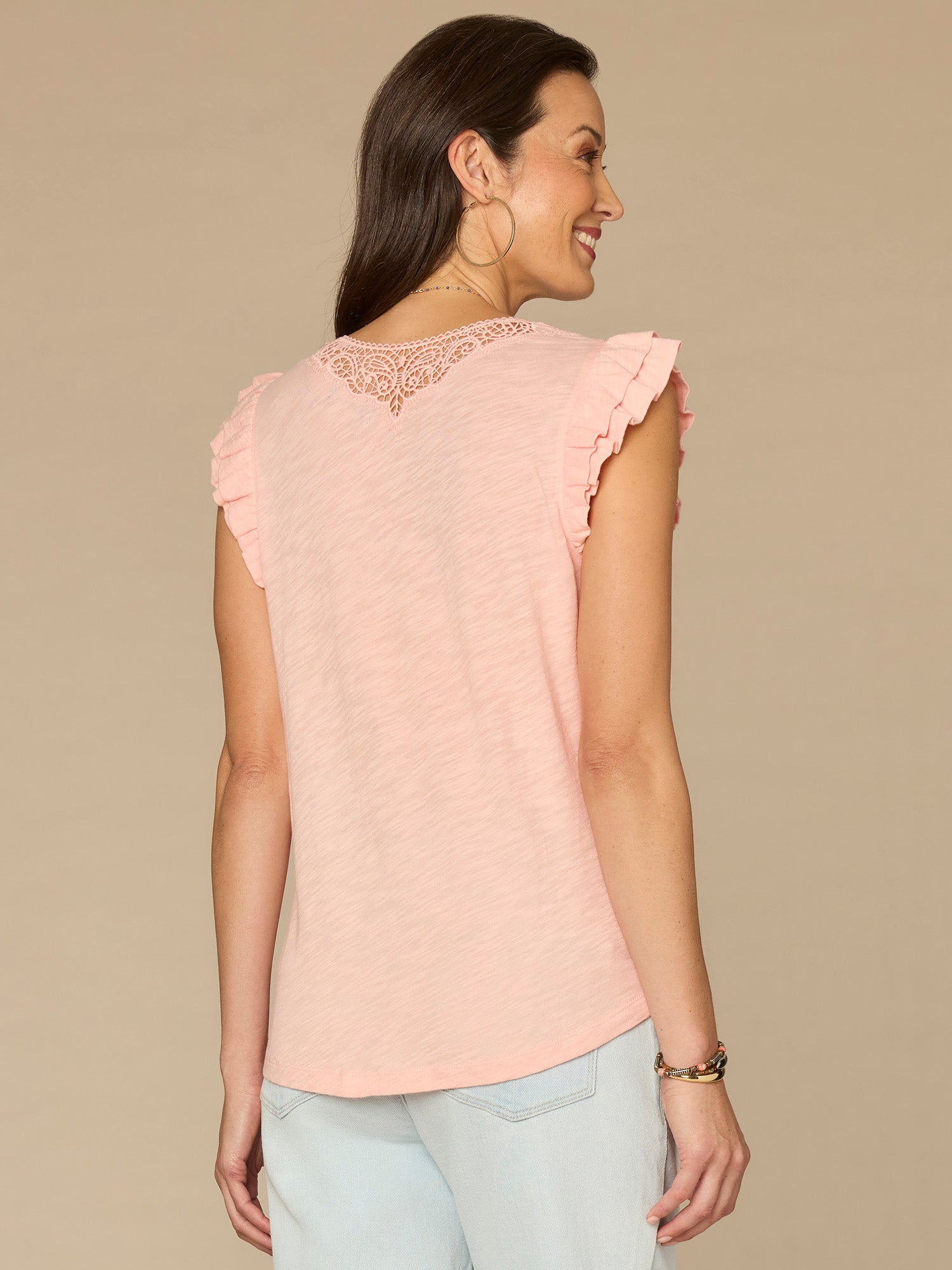 Add a light, feminine touch to your wardrobe with this detailed knit top. It has double ruffle cap sleeves, a crochet V-neck, and a surplus shirttail hem, all in a delicate and versatile hue.