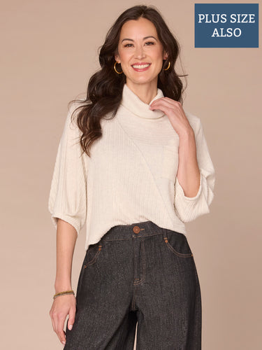 Soft, stylish, and perfect for every type of outfit, this plus-size knit top has pleated elbow sleeves, a mock neck, lurex seaming, and a double pocket. It has all the style—just add your favorite “Ab”solution® bottoms to the mix.