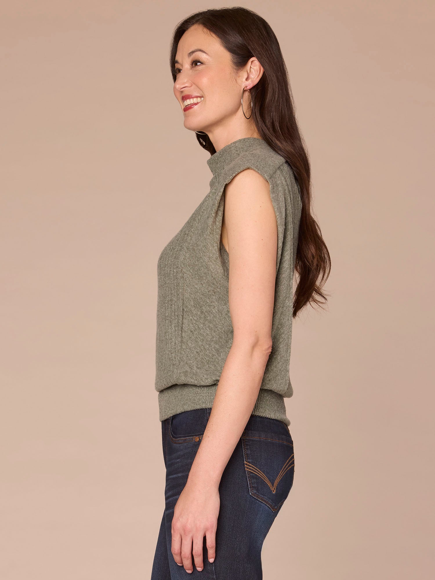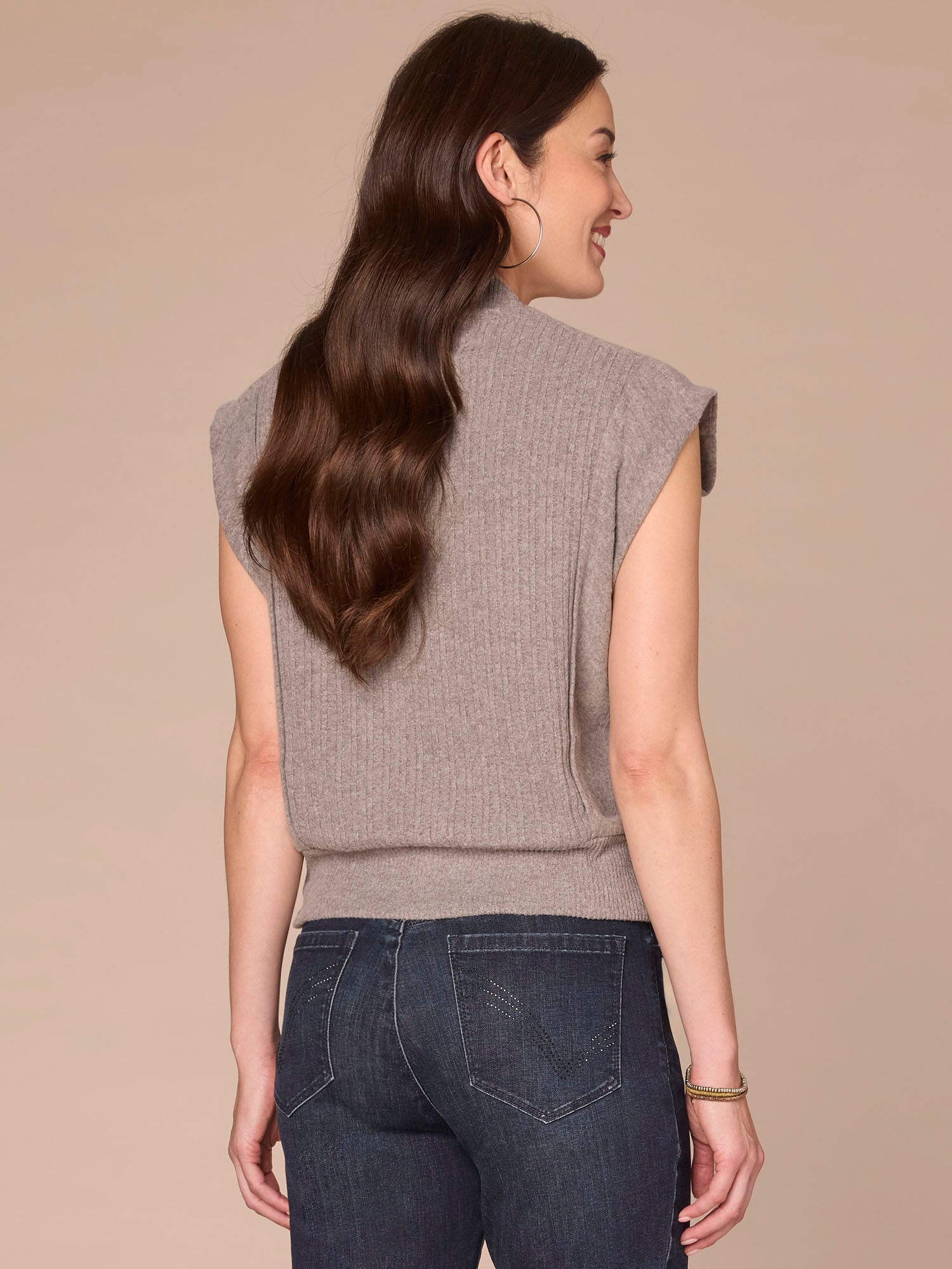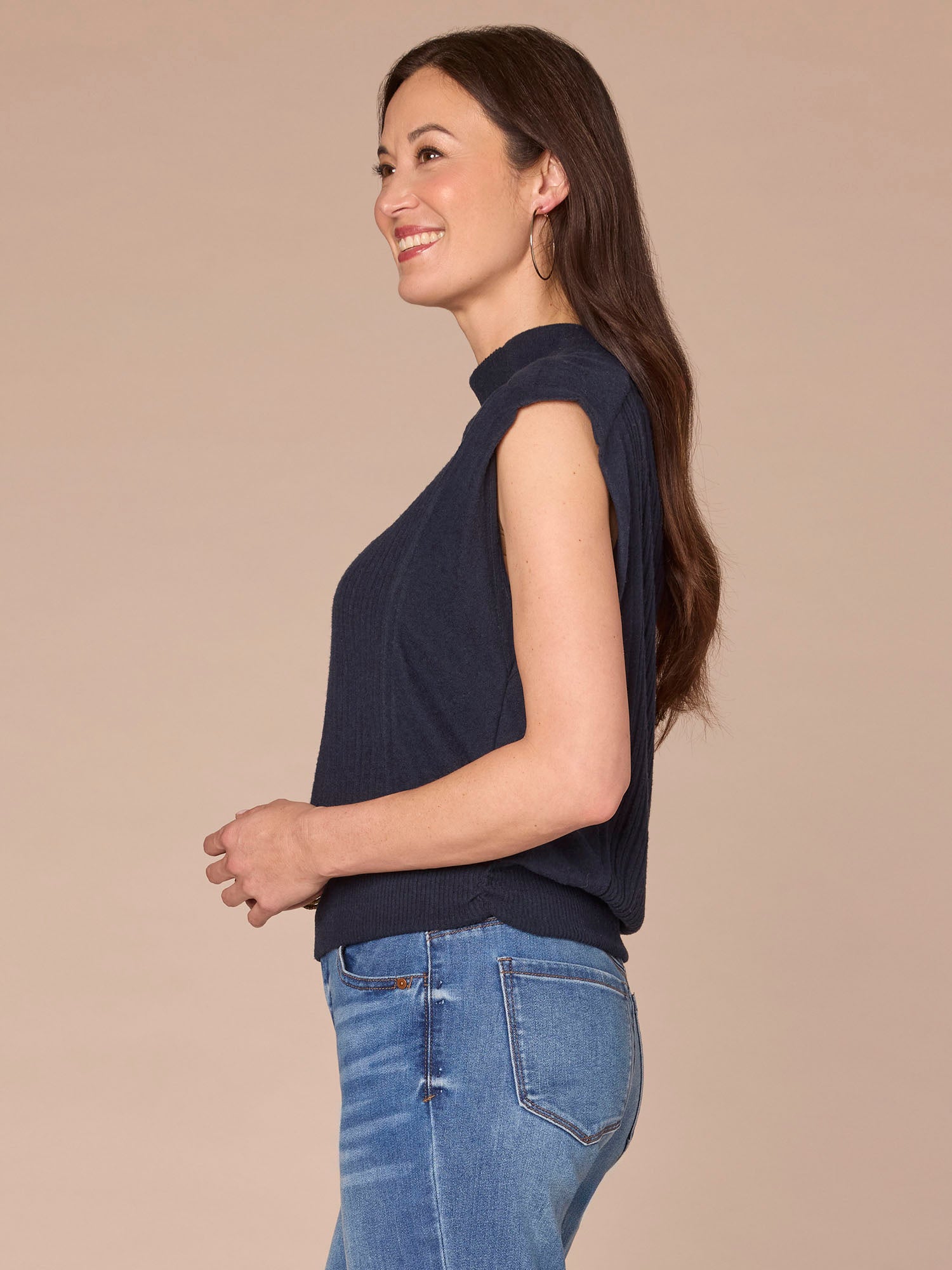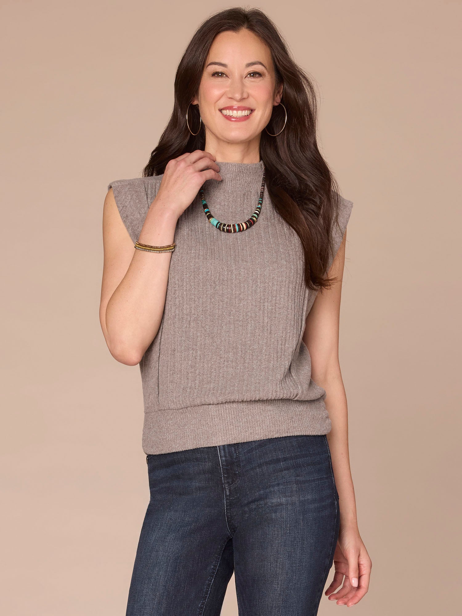 Featuring extended cap sleeves, a funnel neck, and a banded hem with flattering side ruching, this mixed media knit top blends comfort with function seamlessly. It’s a go-to base for the days you just don’t know what to wear.