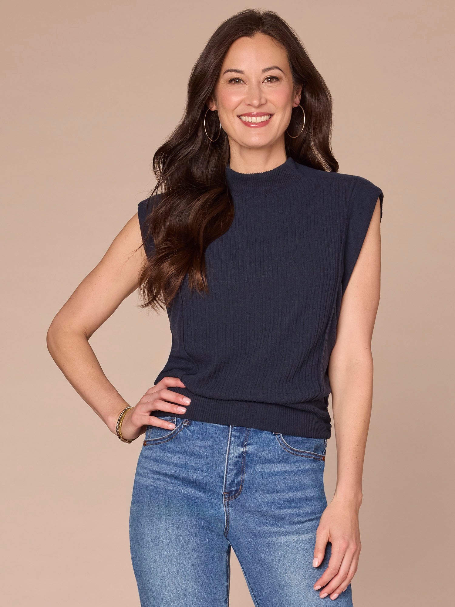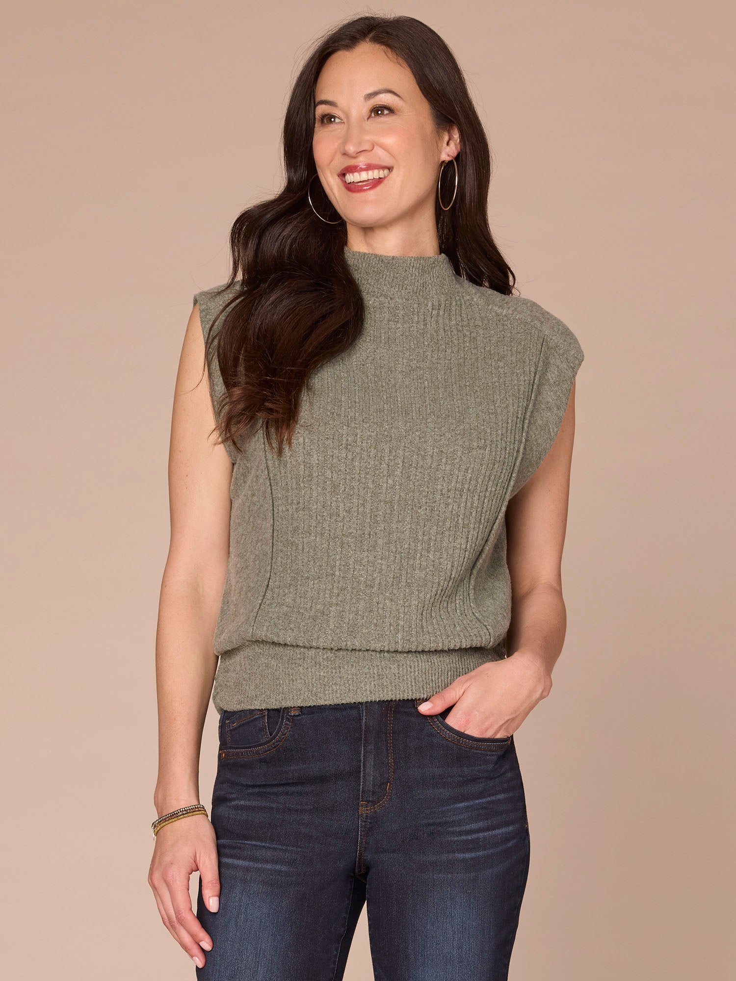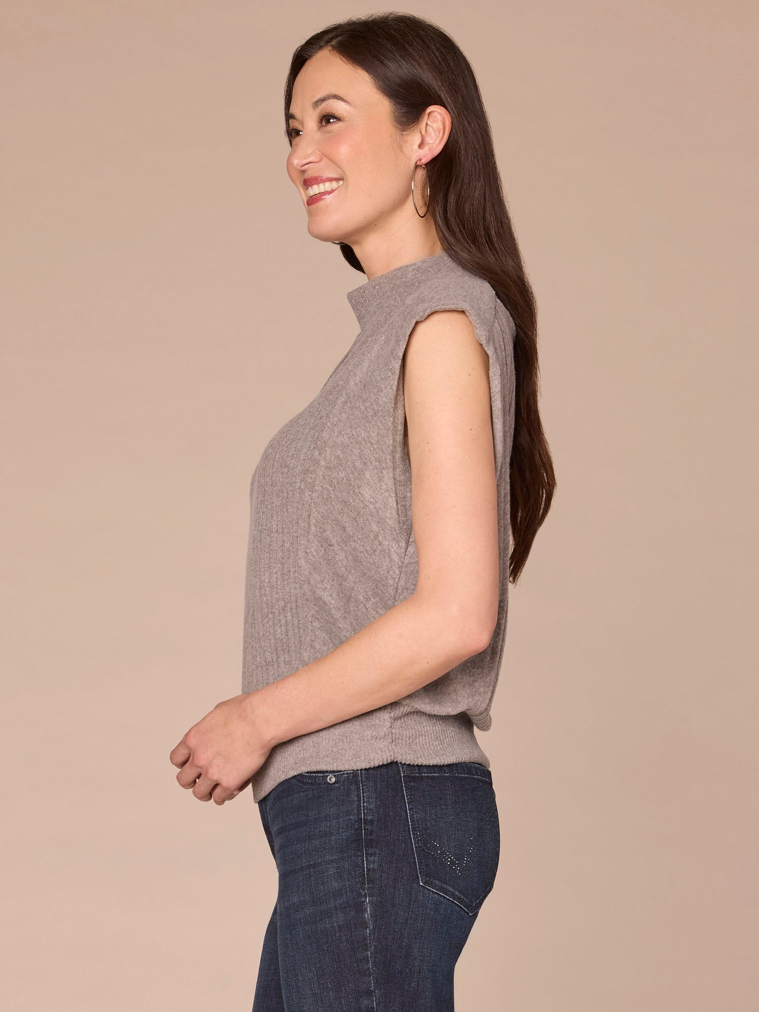Featuring extended cap sleeves, a funnel neck, and a banded hem with flattering side ruching, this mixed media knit top blends comfort with function seamlessly. It’s a go-to base for the days you just don’t know what to wear.
