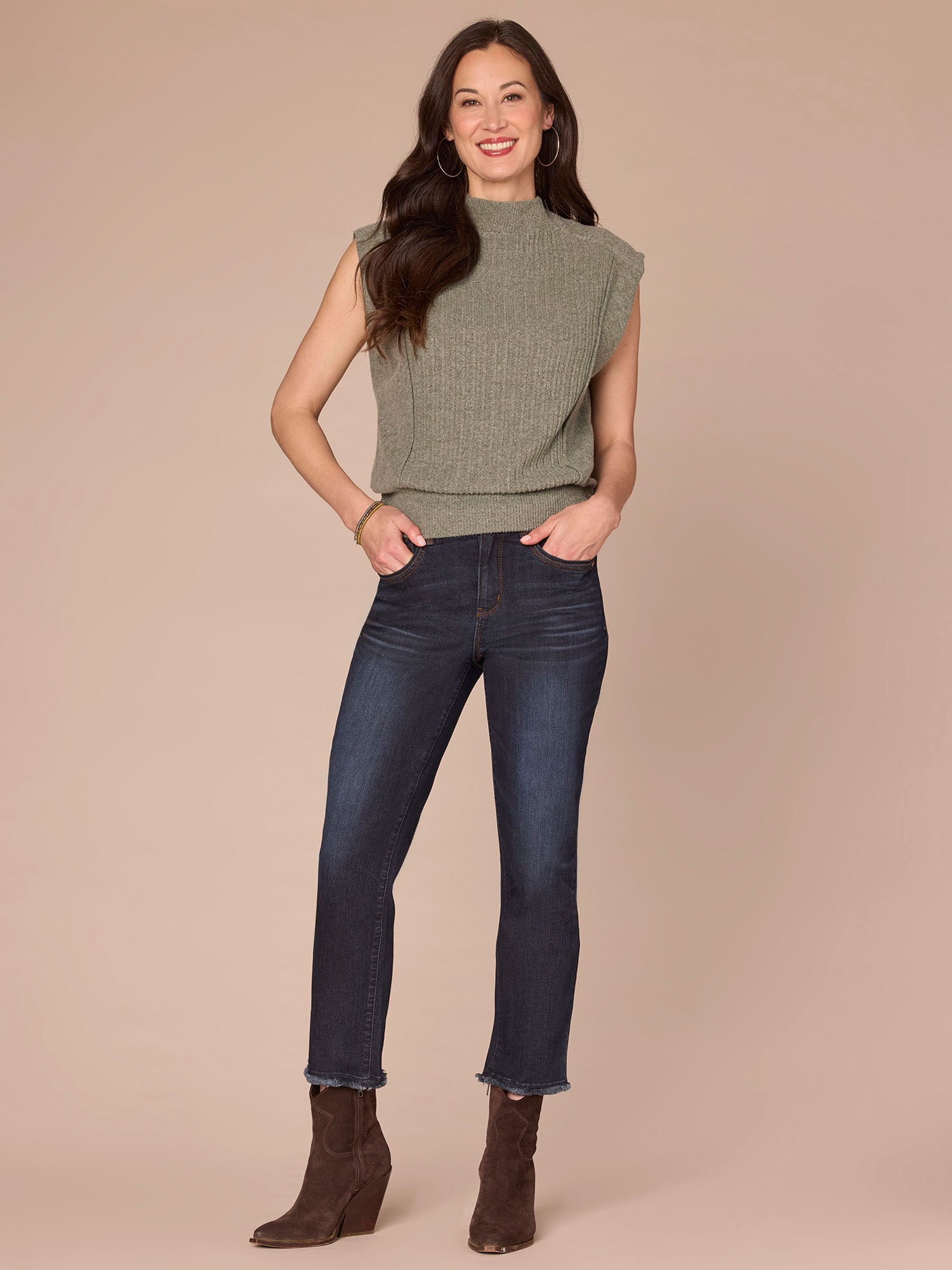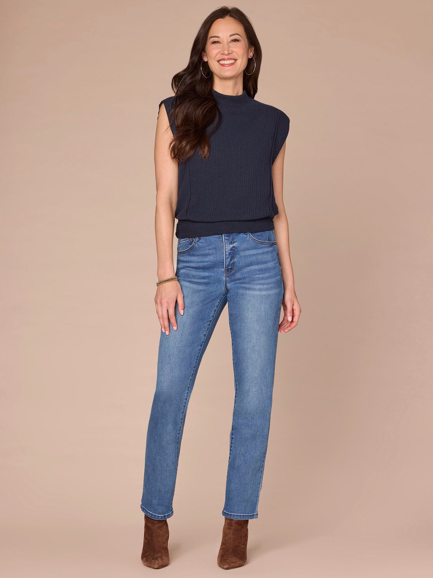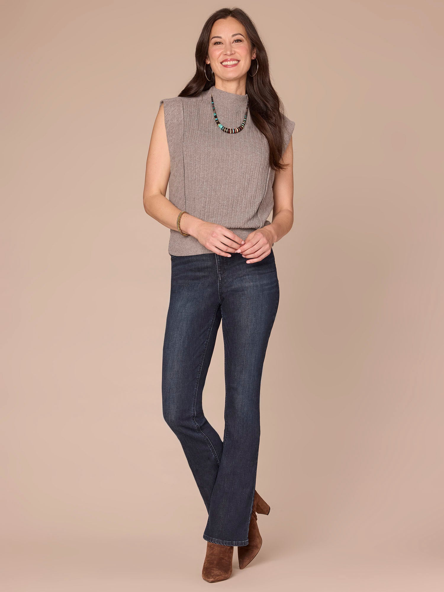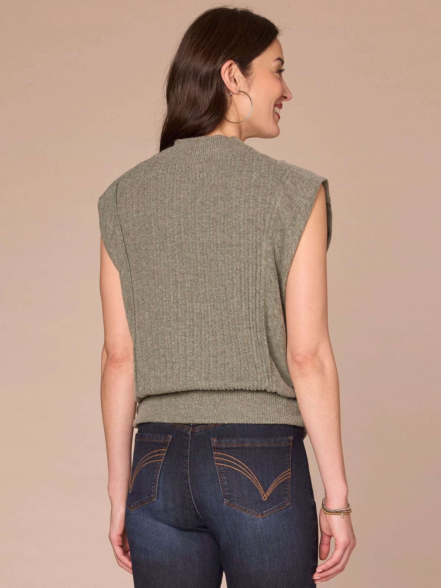 Featuring extended cap sleeves, a funnel neck, and a banded hem with flattering side ruching, this mixed media knit top blends comfort with function seamlessly. It’s a go-to base for the days you just don’t know what to wear.