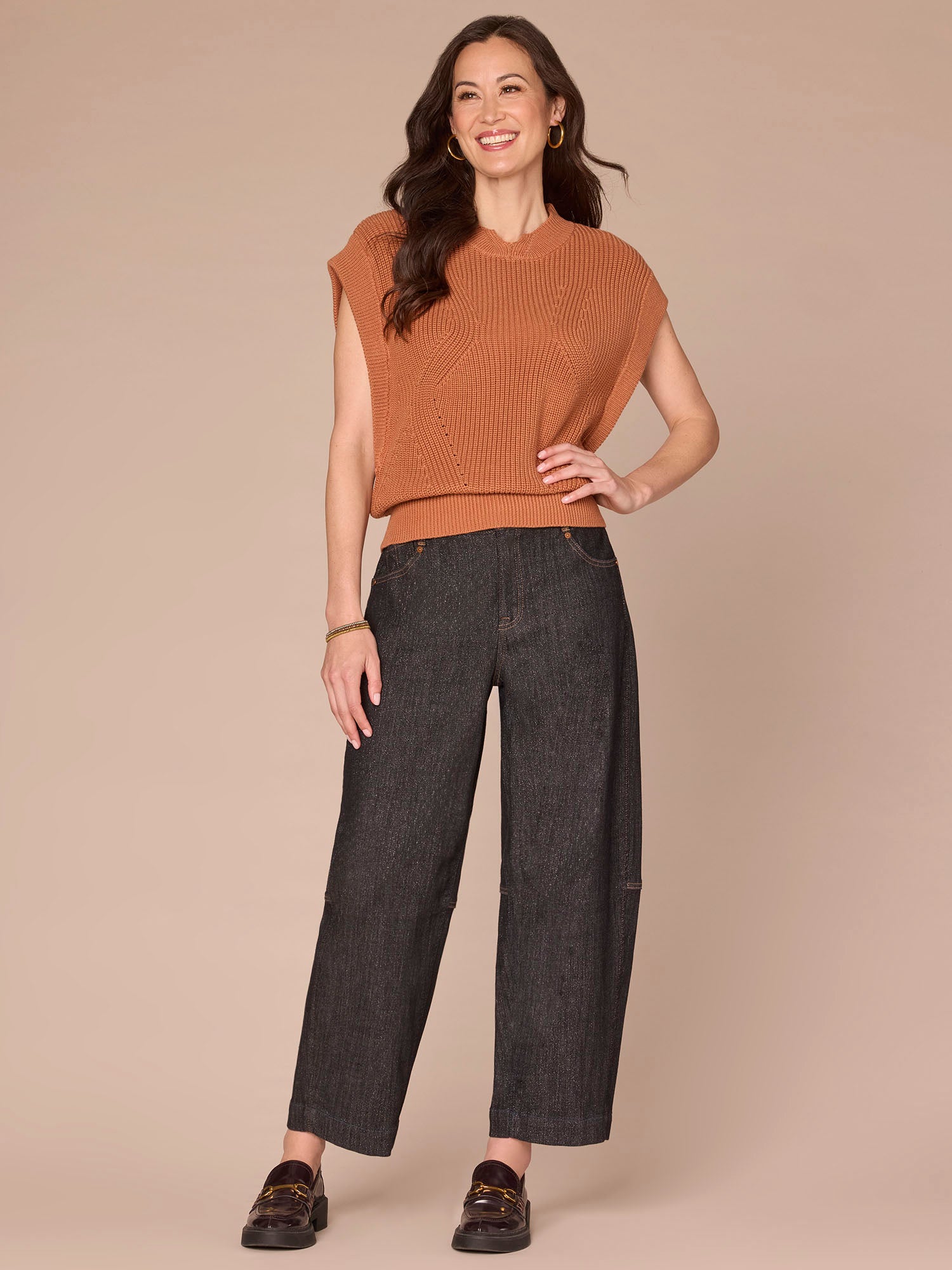 Get a flattering silhouette, comfortable fabric, and polished structure with this sweater vest. It’s designed with extended shoulder sleeves, a mock neck with a subtle cutout, and a banded hem.