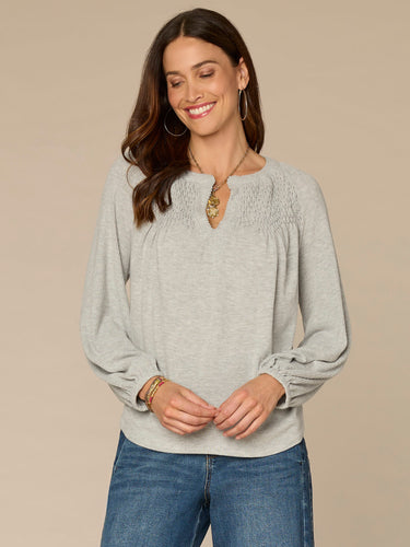 Meet your latest wear-anywhere style. This fresh knit top has long blouson sleeves, a split V-neck, half placket, and on-trend novelty smocking detailing.