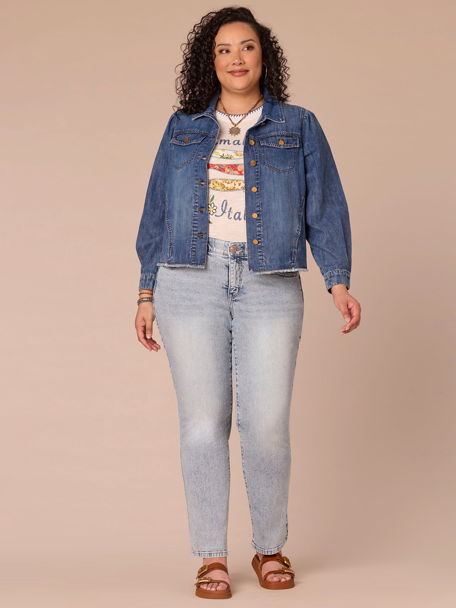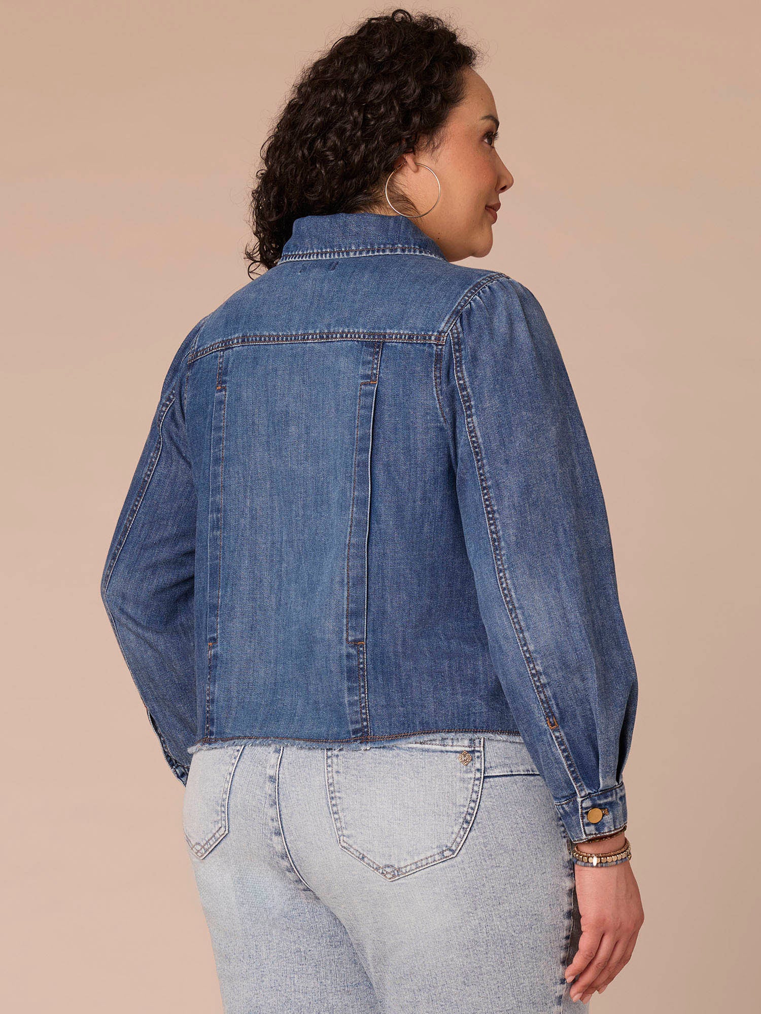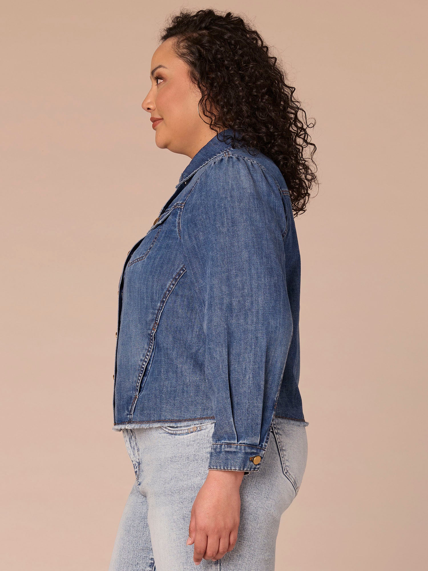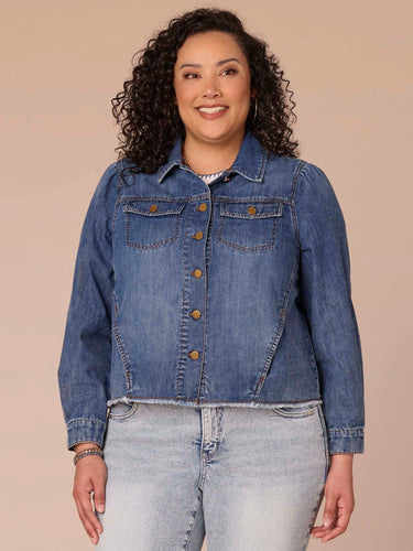 With long puff sleeves, a button up front, angled seaming, and a curved fray hem, this denim jacket in plus sizing is made for effortless layering. Style it with mid blue jeans for a denim on denim moment.