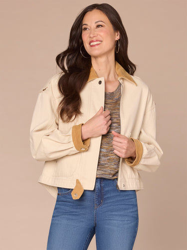Long Sleeve Corduroy Contrast Denim Jacket with Hidden Zip Front