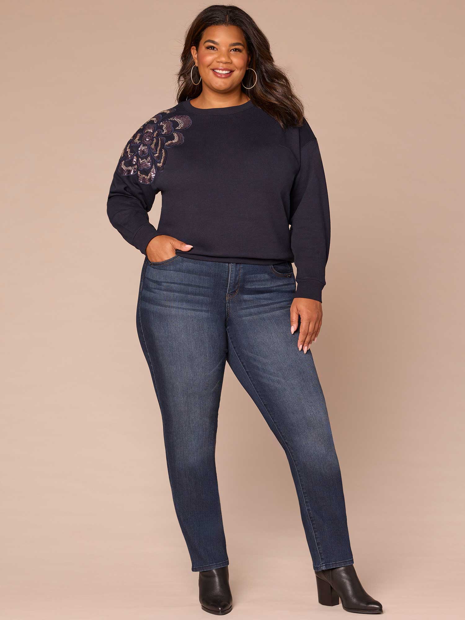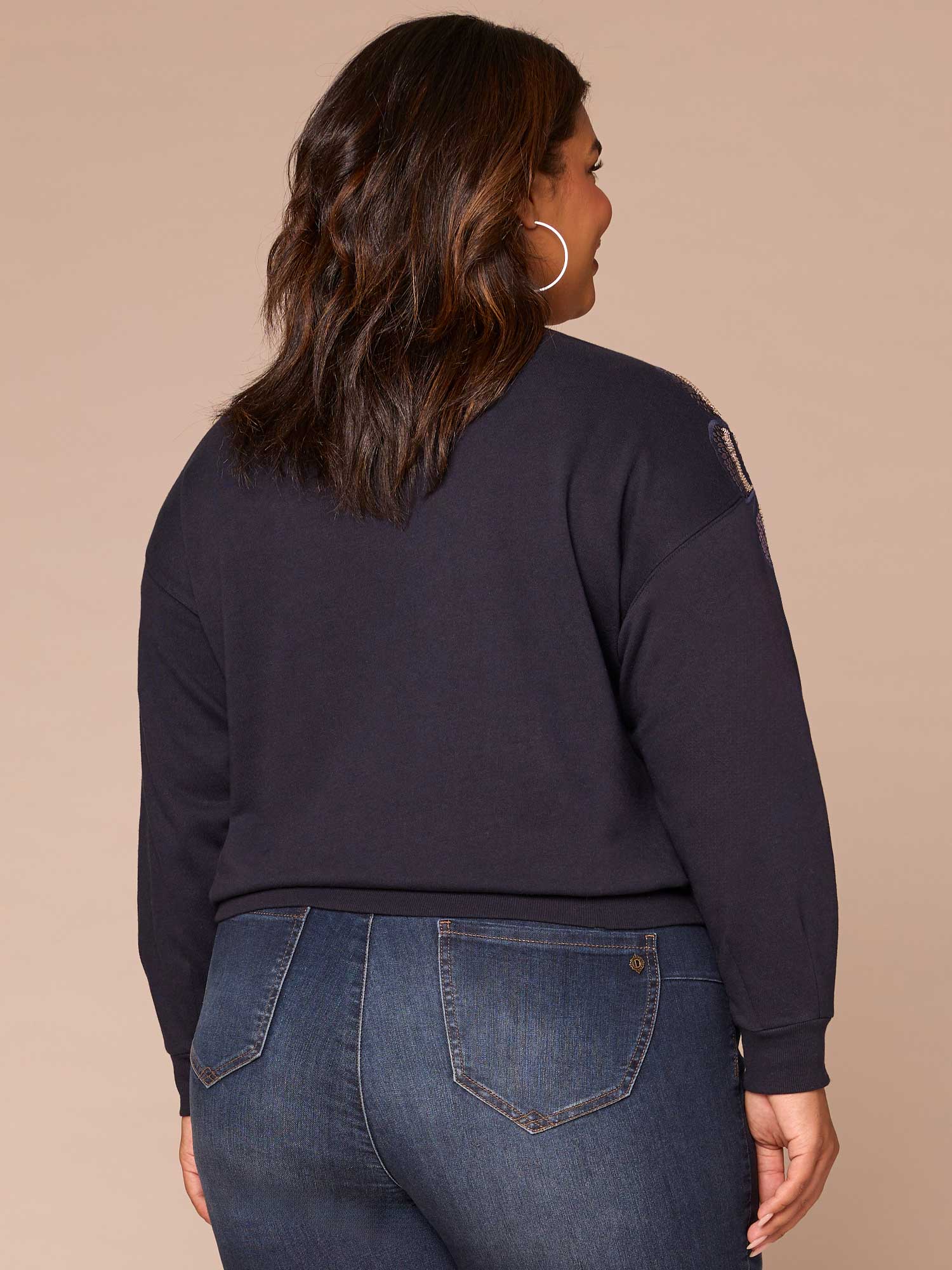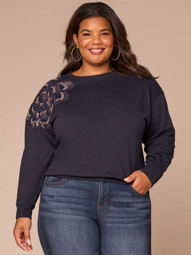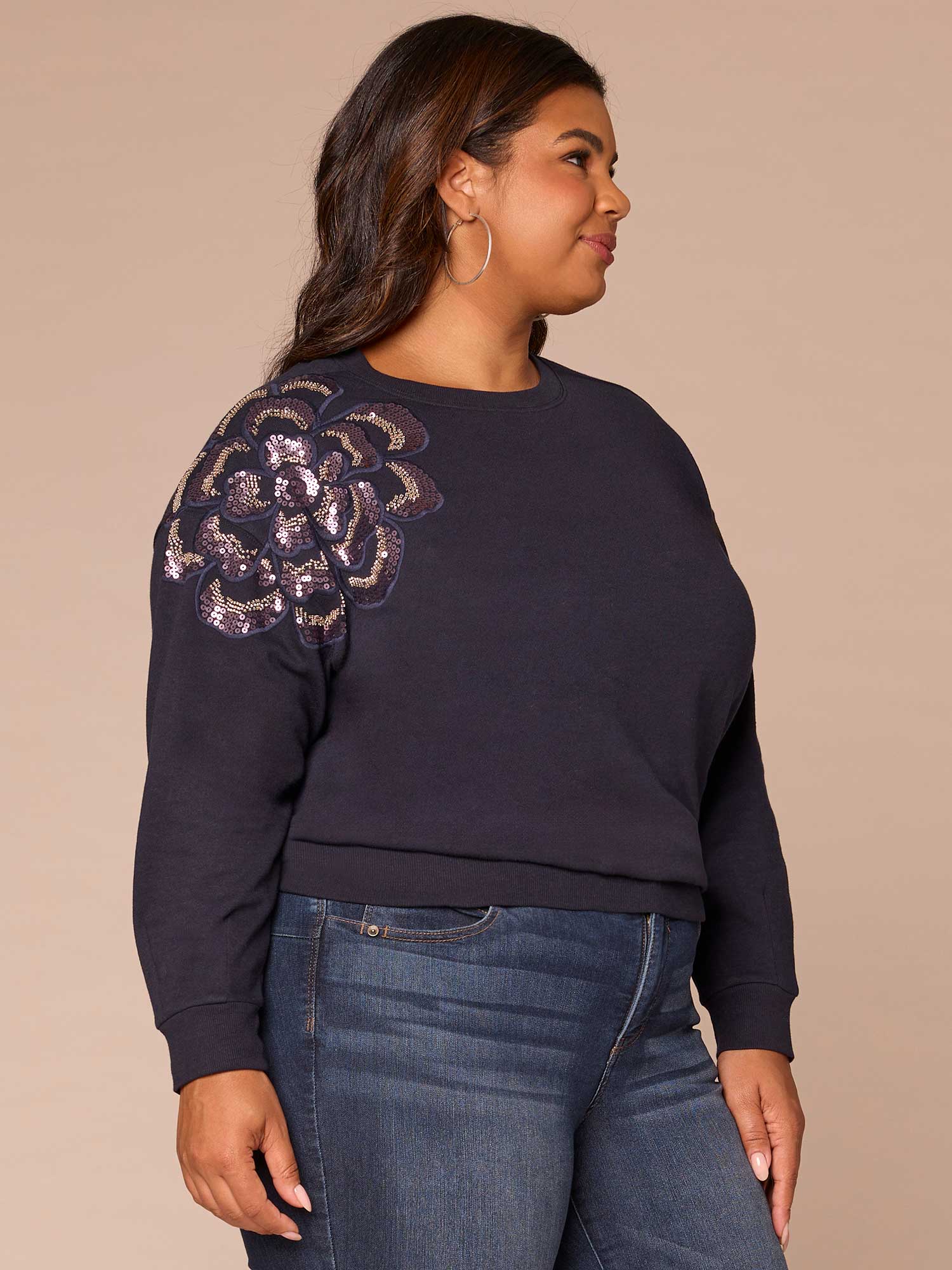This cozy and feminine sweatshirt in plus sizing blends on-trend design details with all day comfort. Its long banded sleeves, crew neck, and beaded floral applique give it the right amount of versatility and charm.