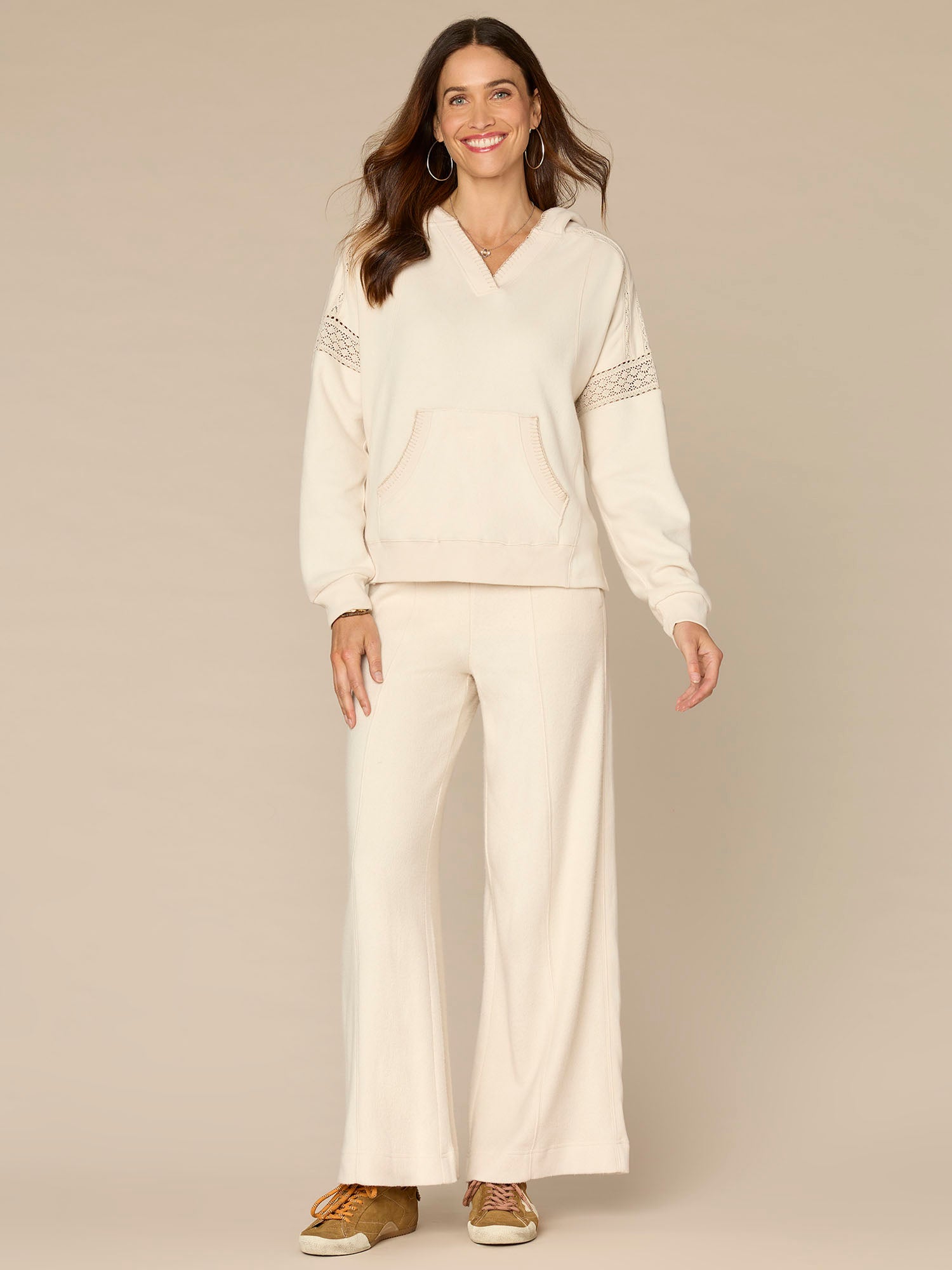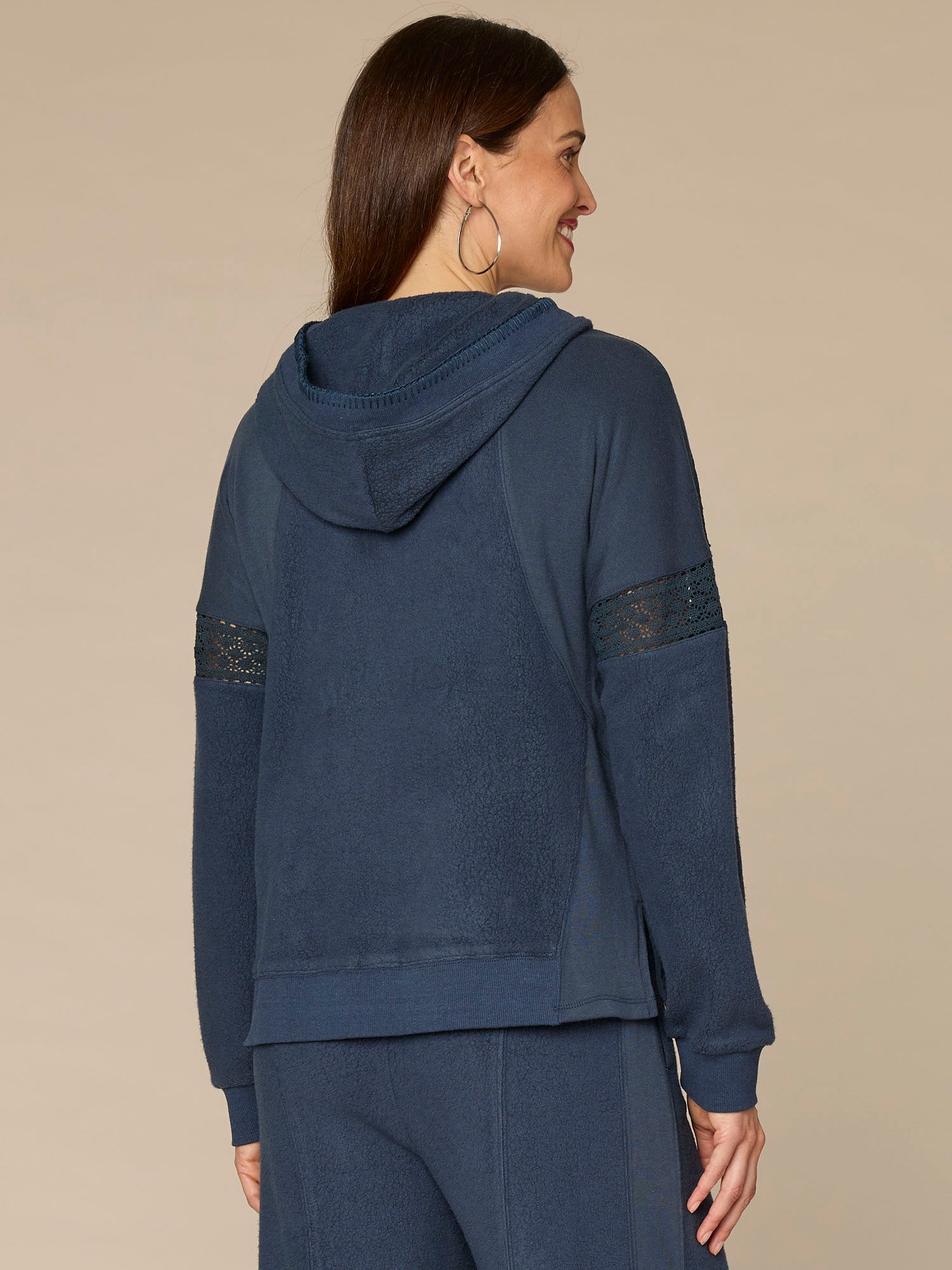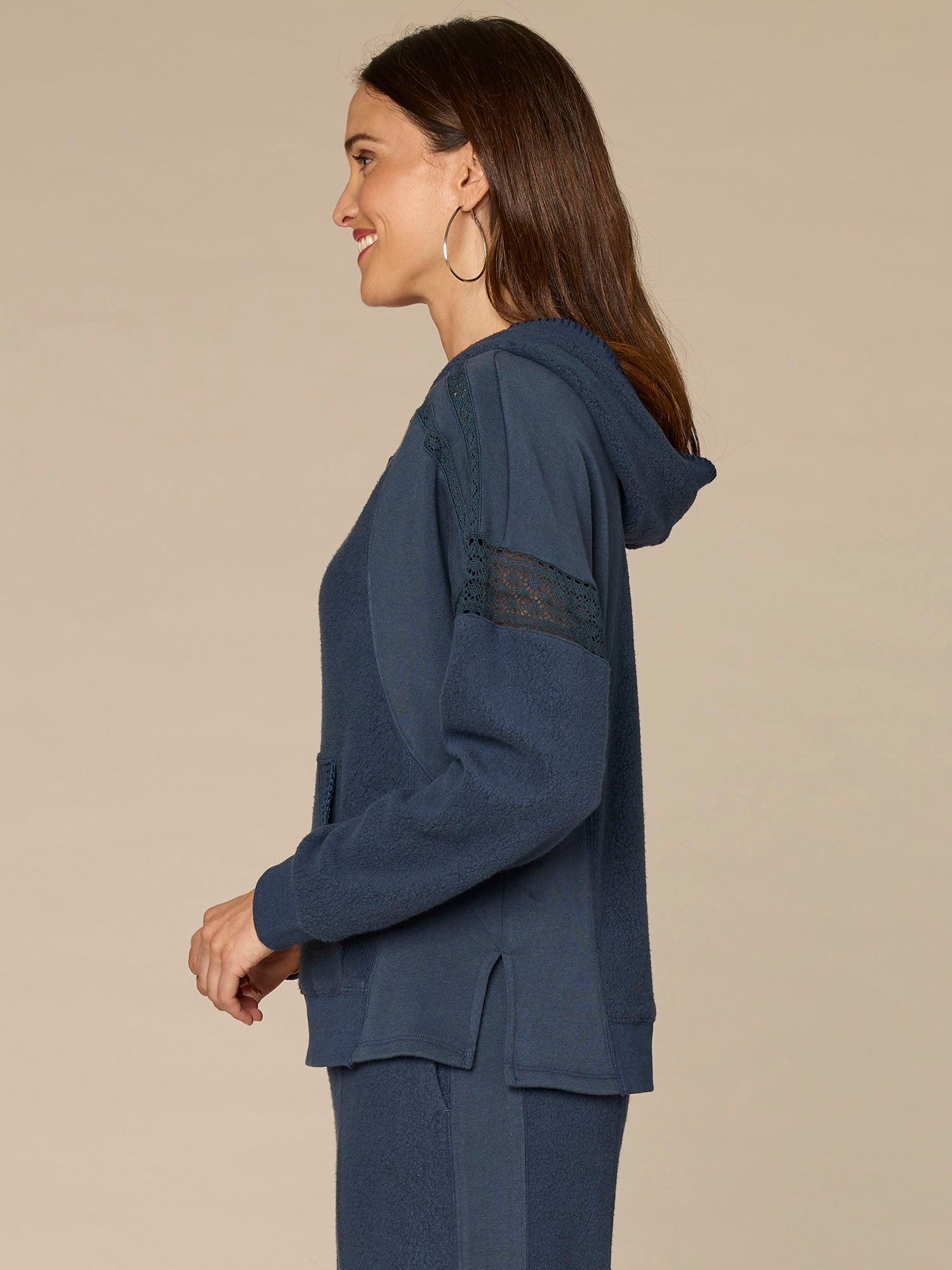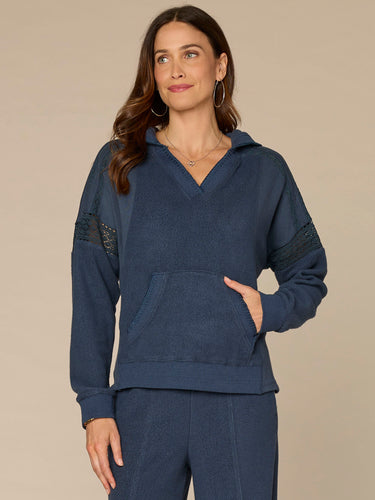 This mixed media knit hoodie is a reimagined way to introduce sweats into your rotation, but with elevated elements that make it a go-to. Features include long banded sleeves, a V-neck with a half placket, blanket stitch detailing, a crochet insert design, and a kangaroo pocket.