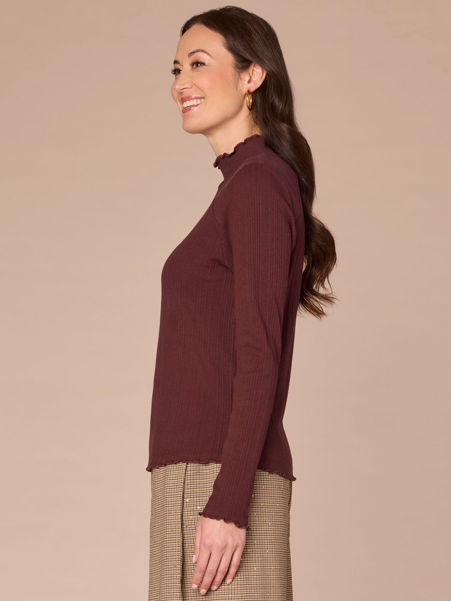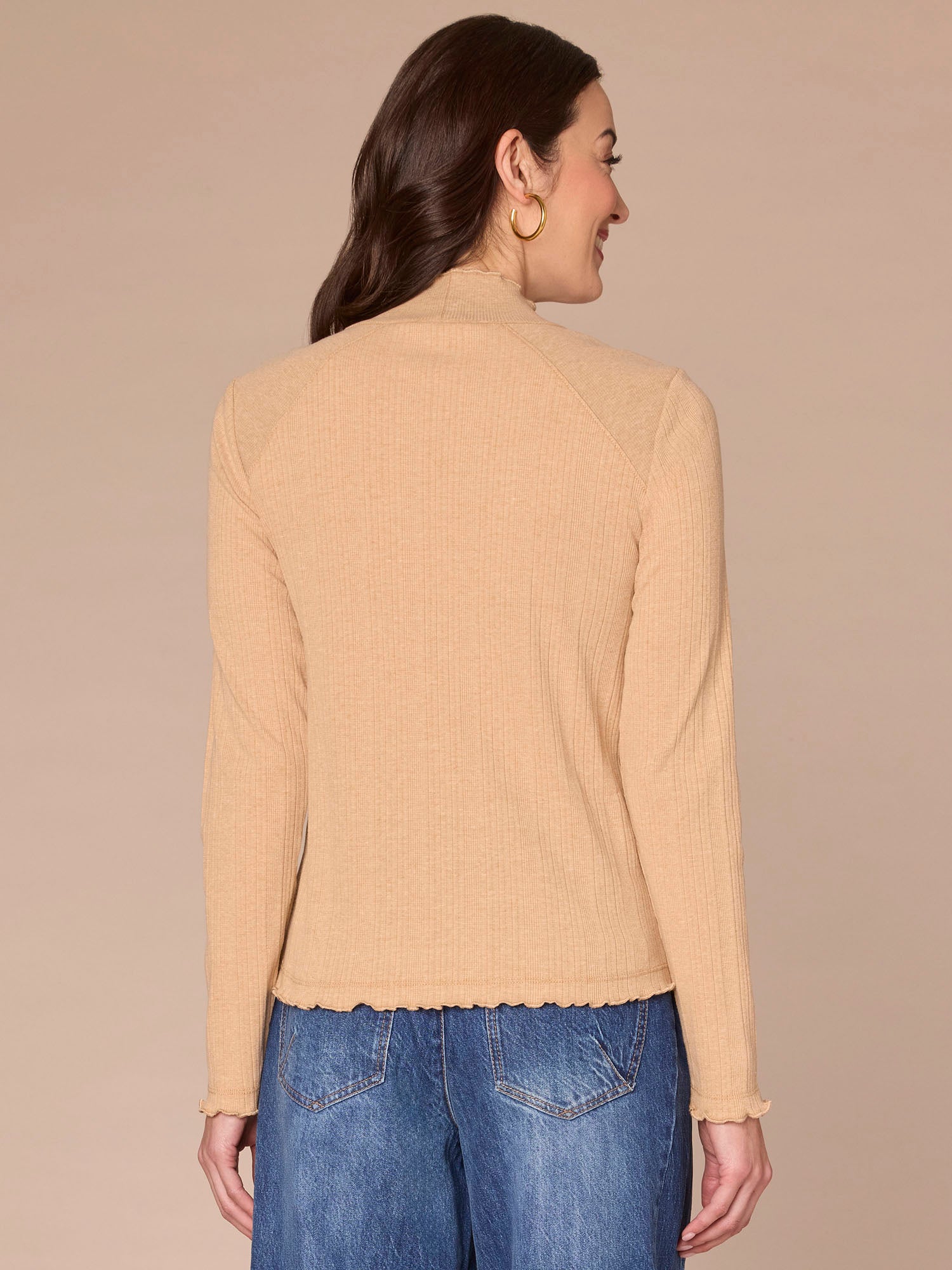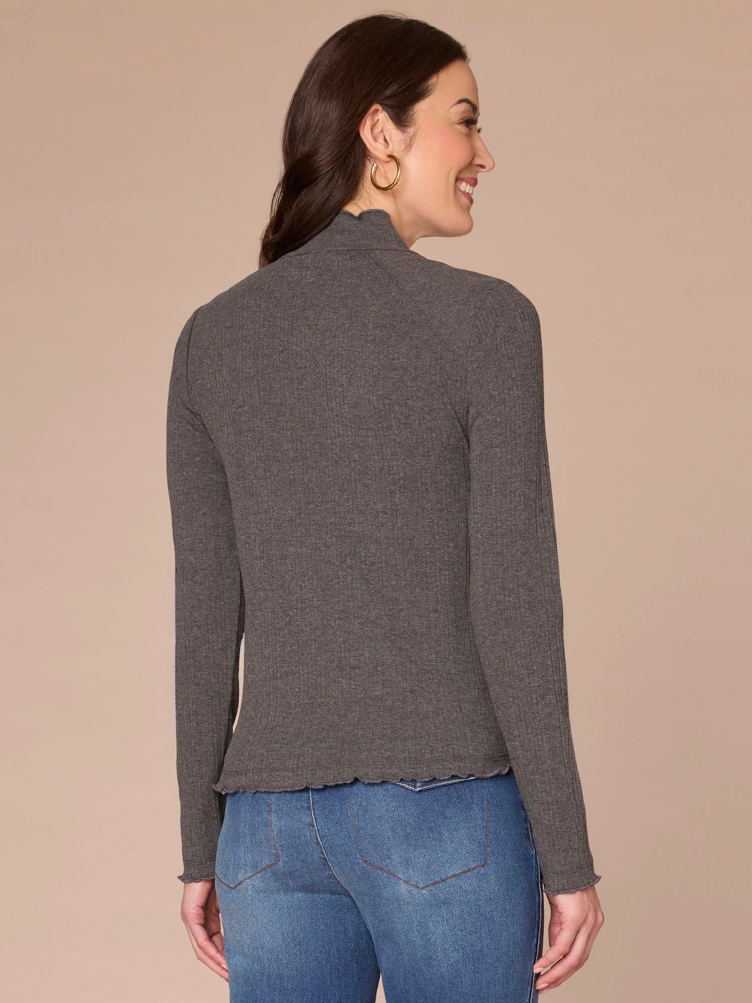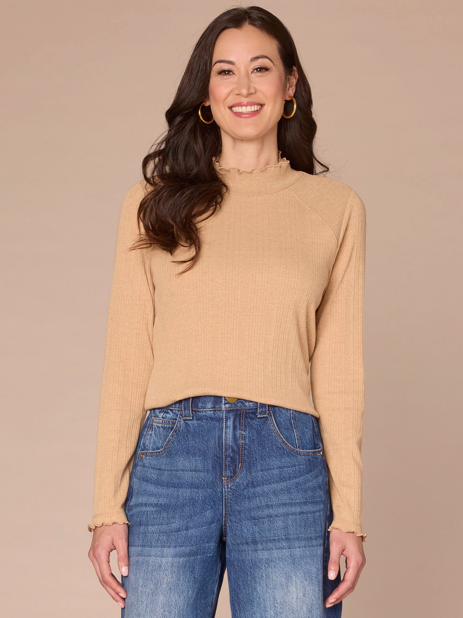 Long Sleeve Mock Neck Mixed Media Knit Petite Top with Lettuce Edge