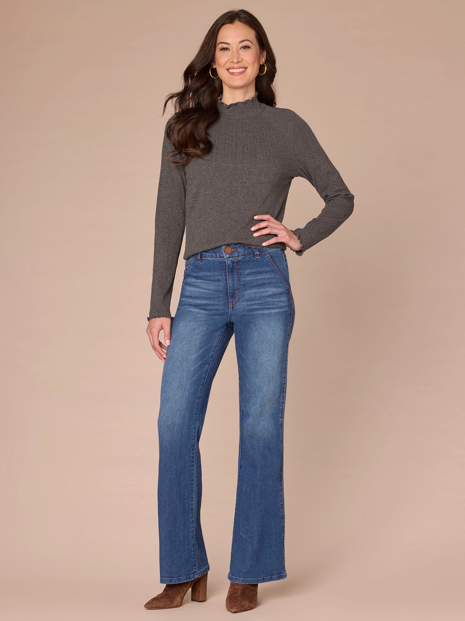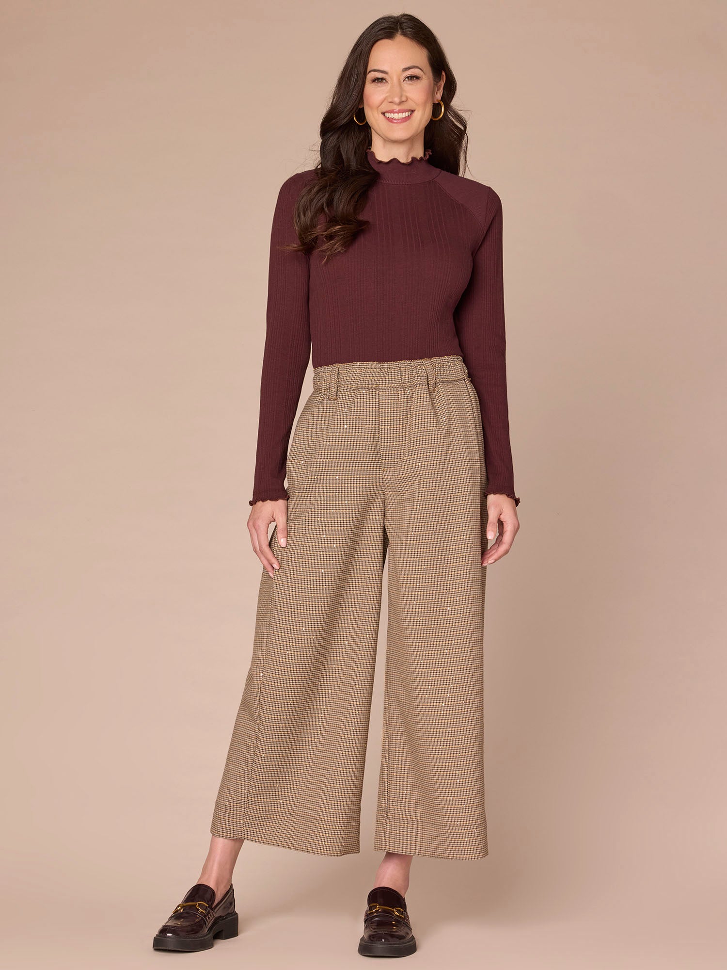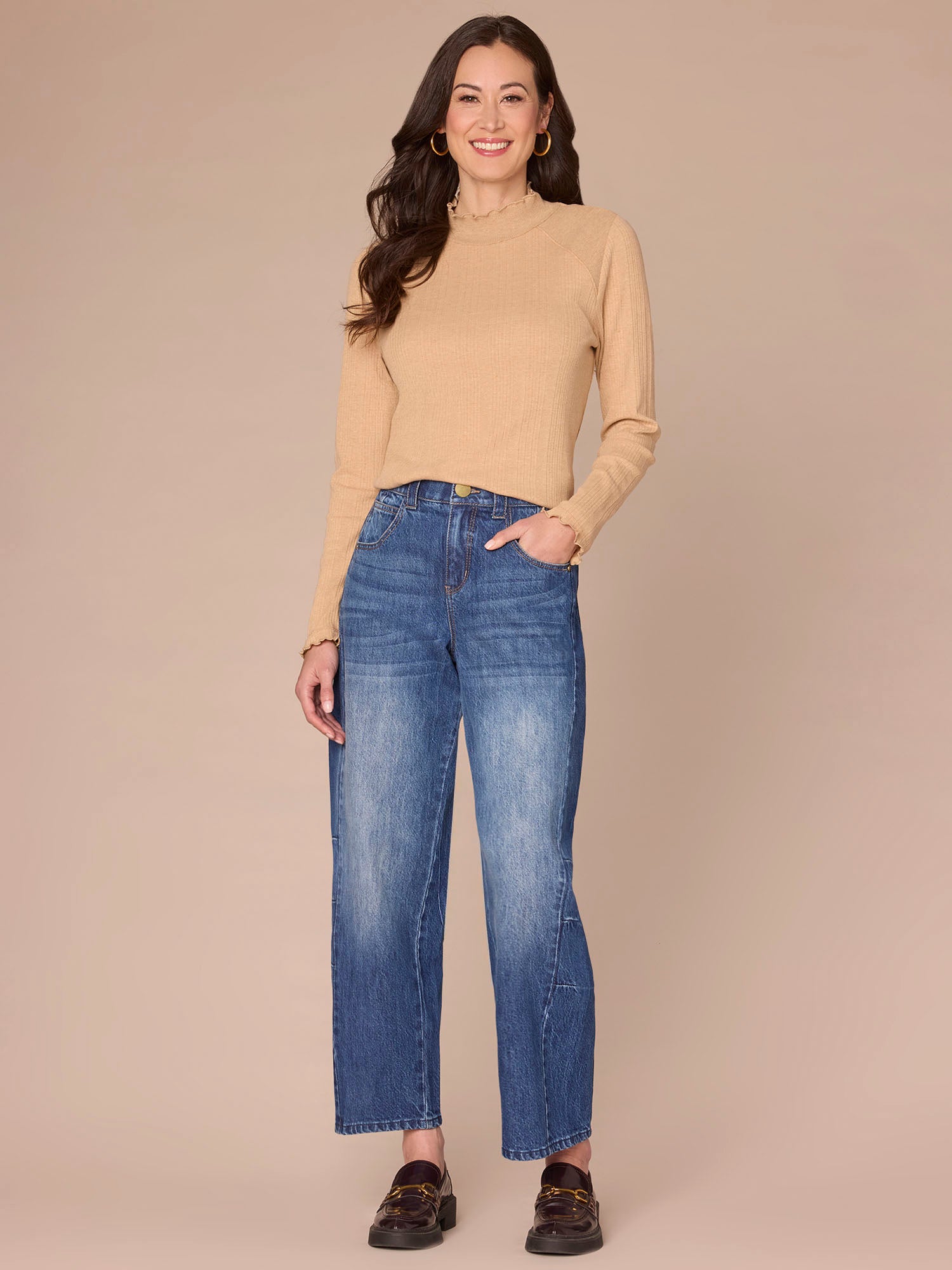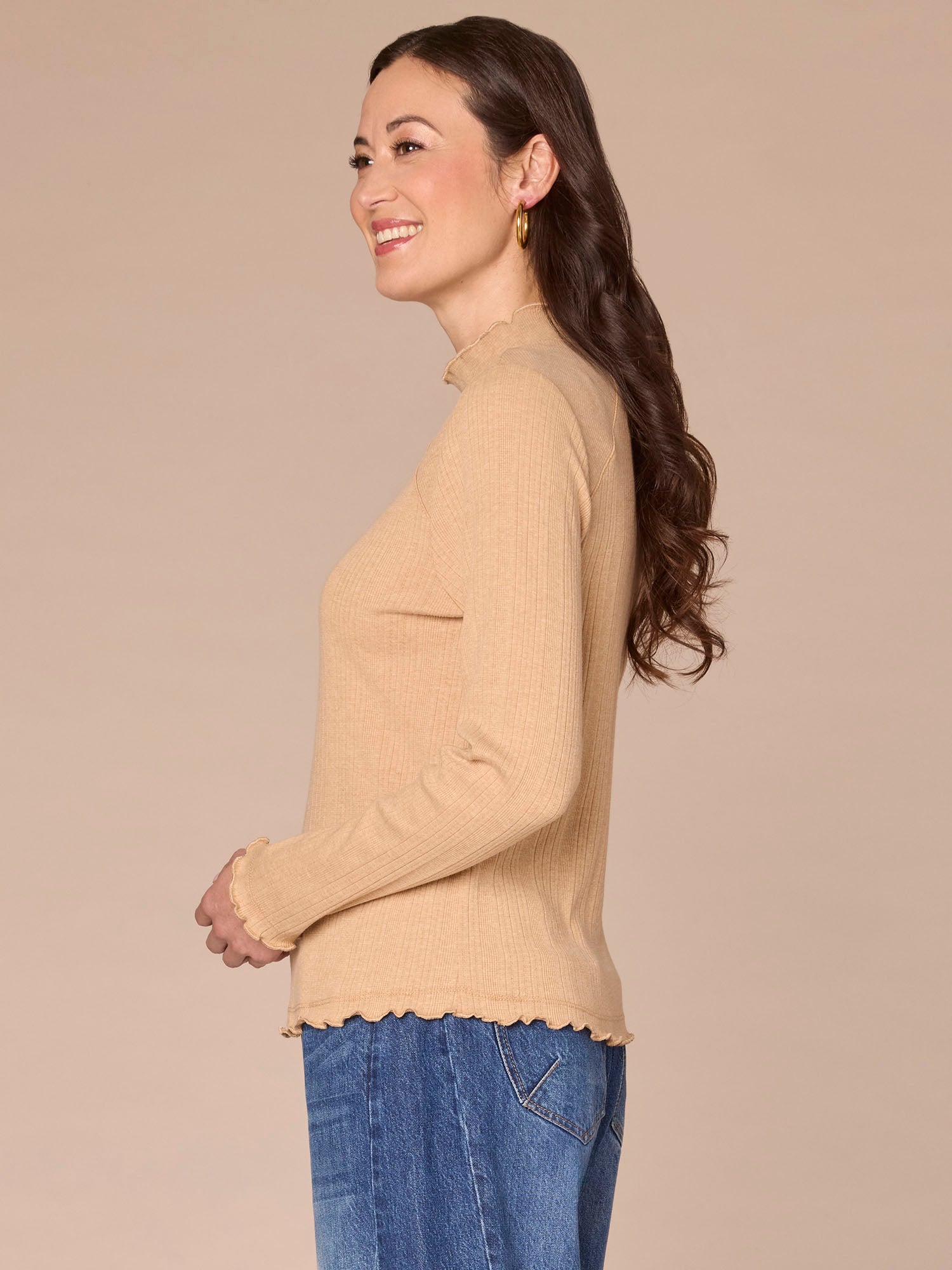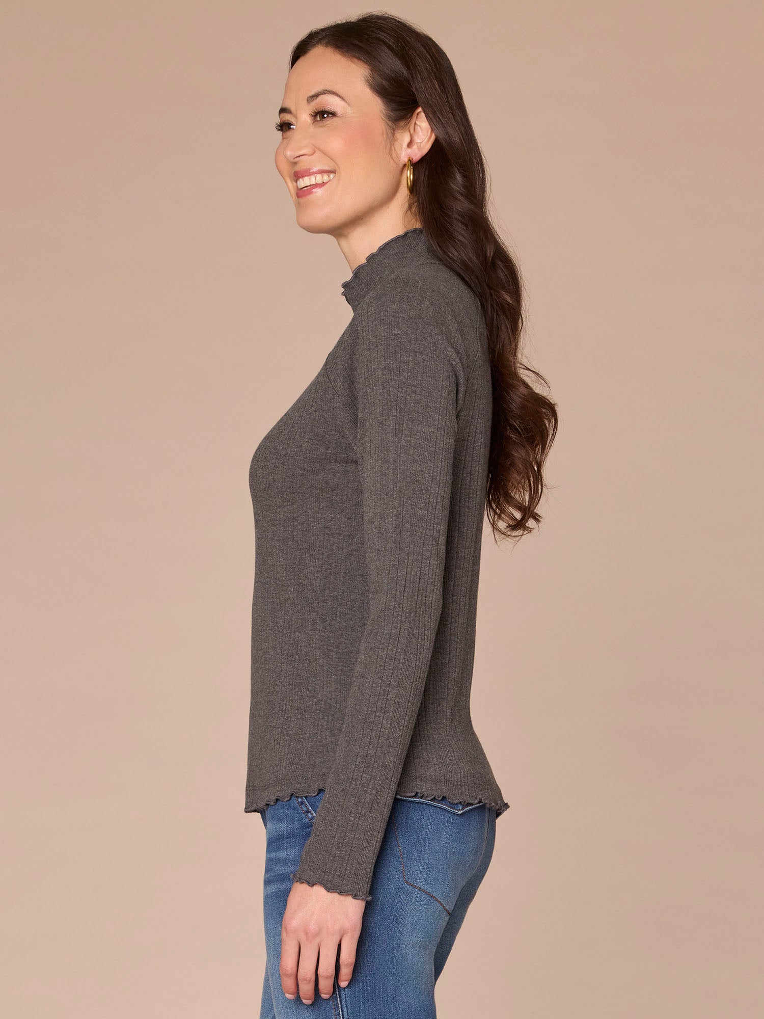 This mixed media knit top in petite sizing is endlessly versatile, with long sleeves, a mock neck, and seaming details. Wear it on its own or style it under a layer with the chic lettuce edge details popping through.