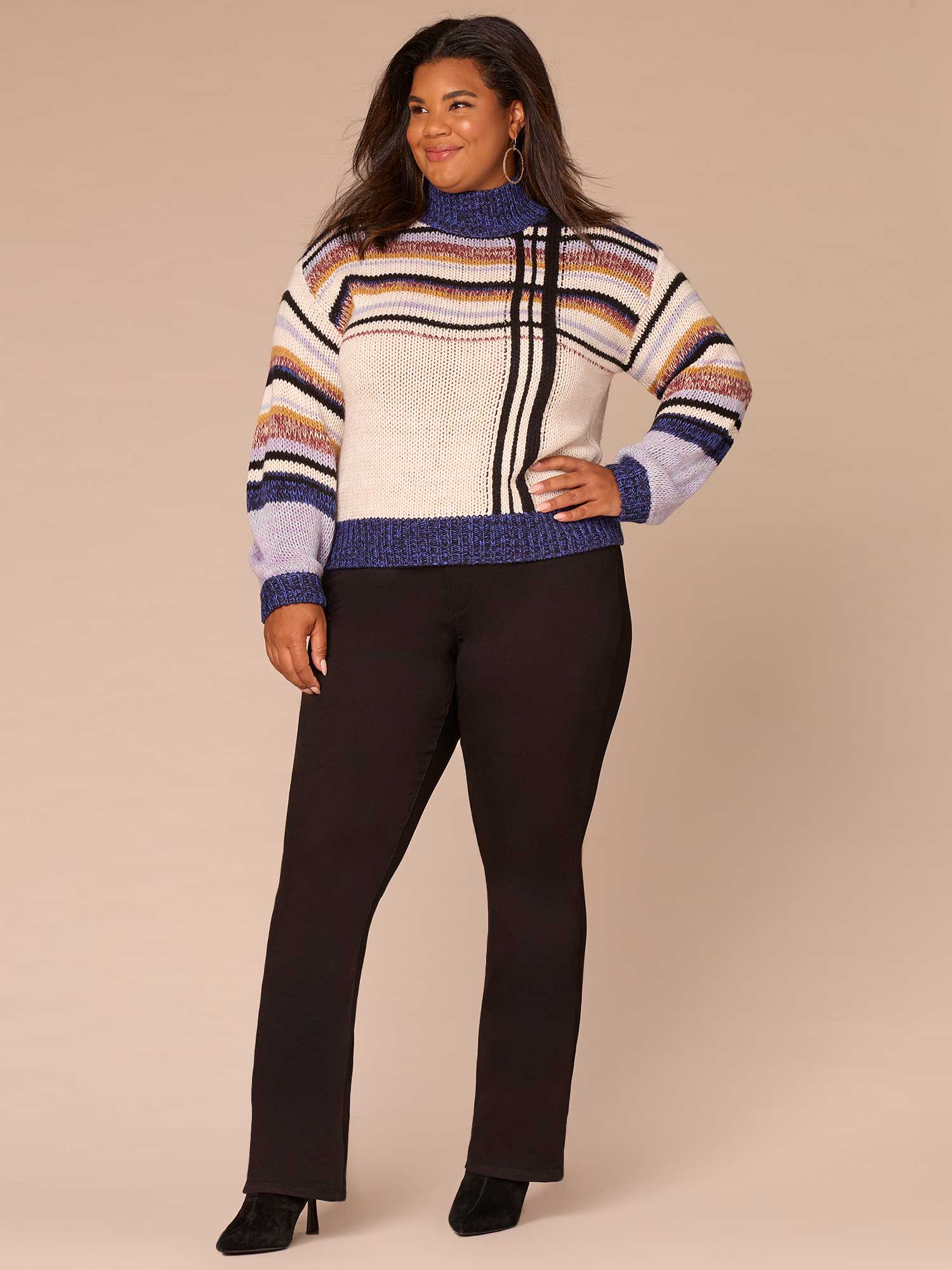 With a mock neck, long cuffed sleeves, and colorful, flattering placement stripes, this sweater in plus sizing is a seasonal staple. It’s perfect for cool evenings out and cozy days in.
