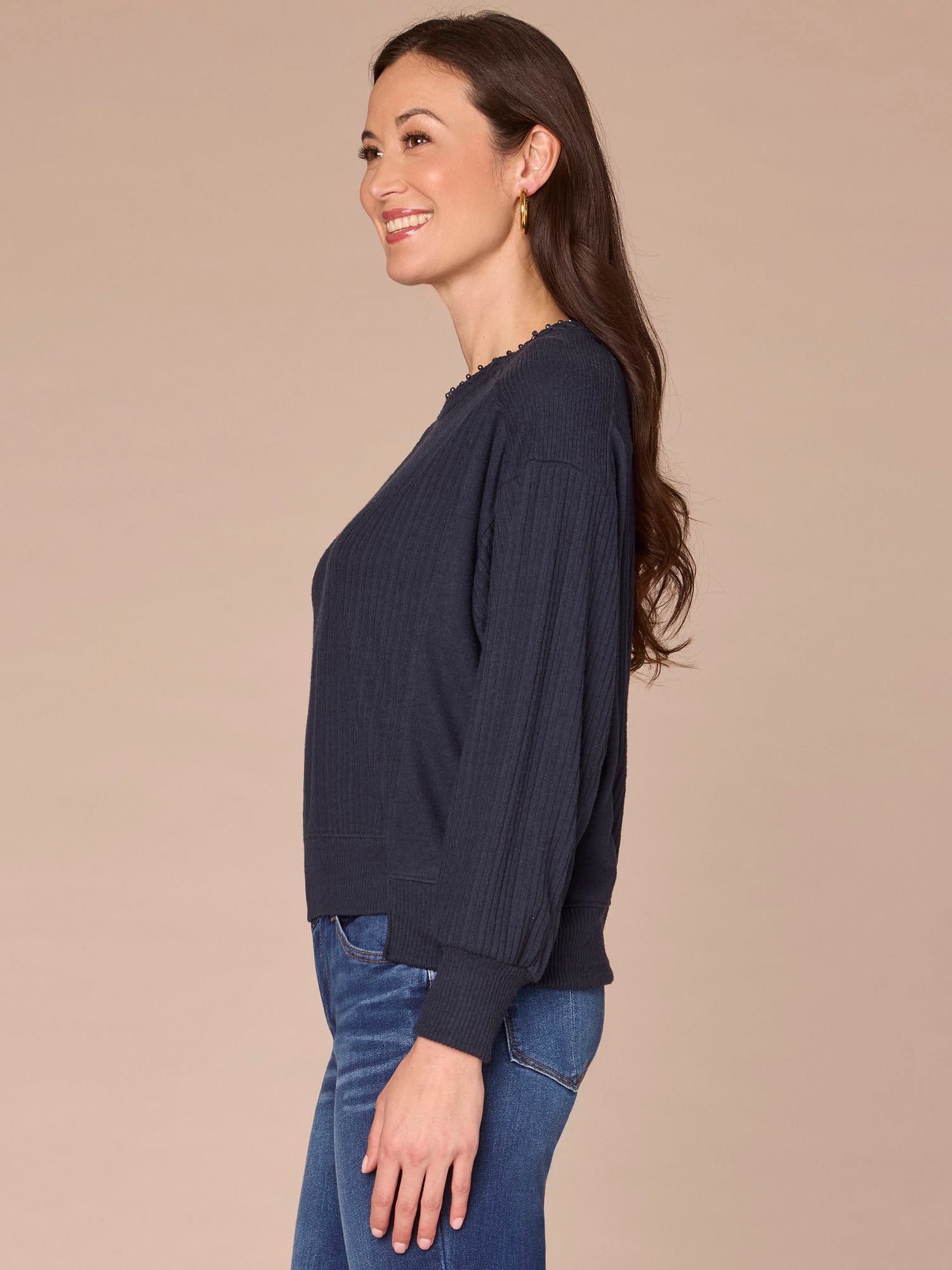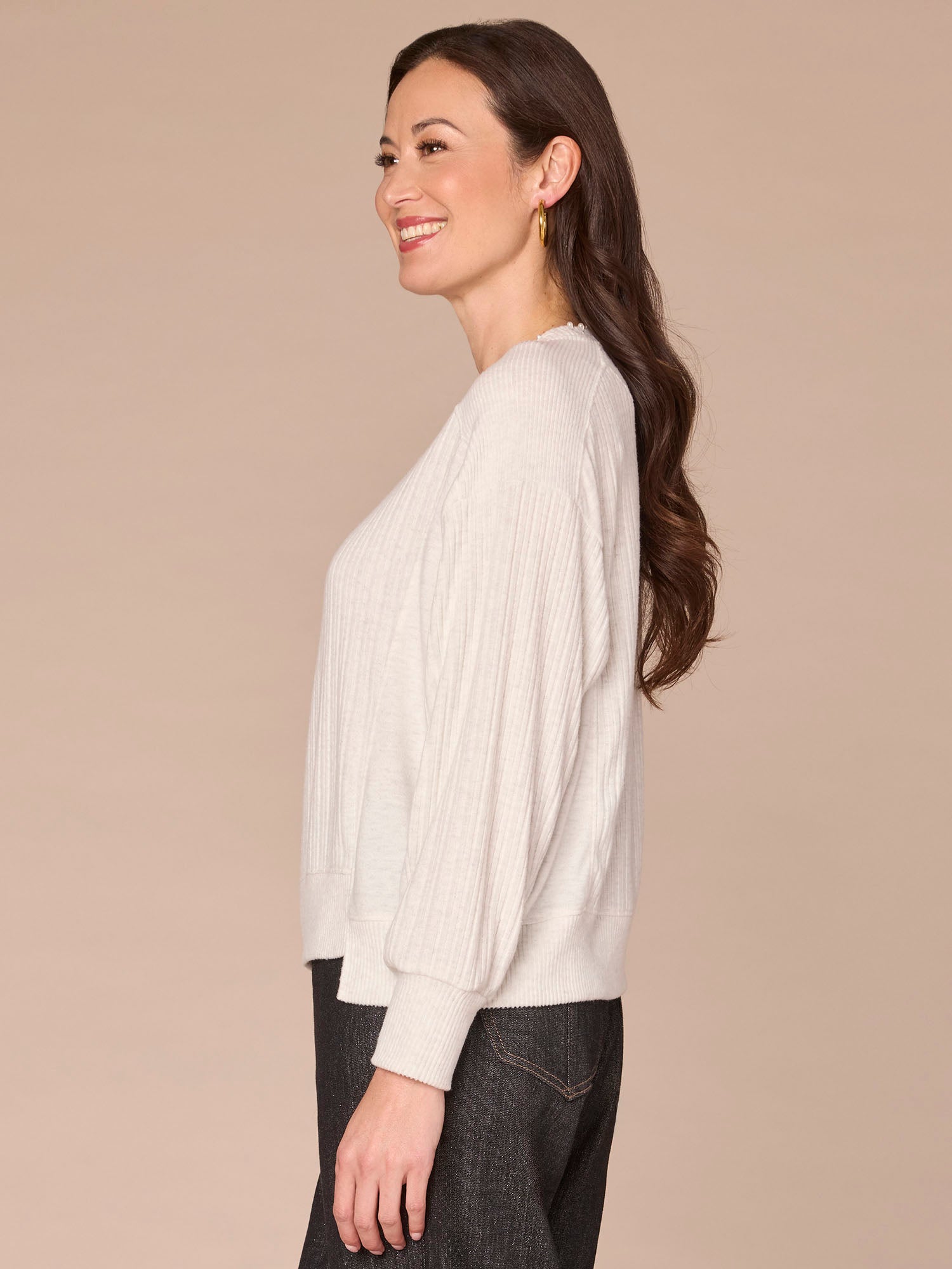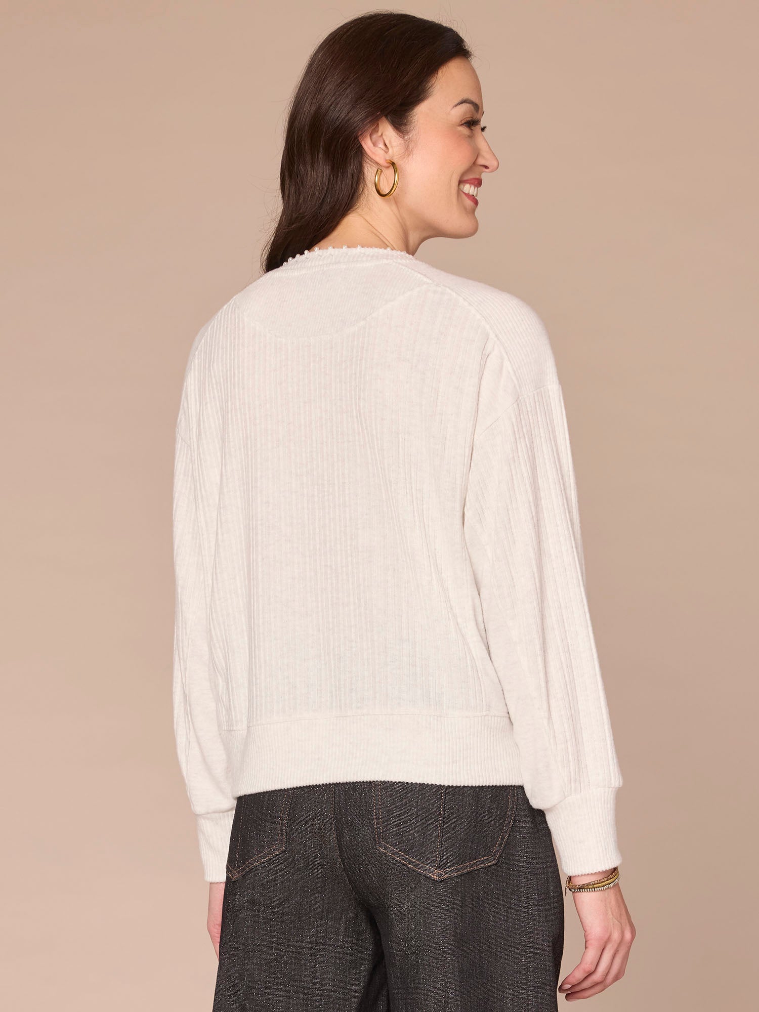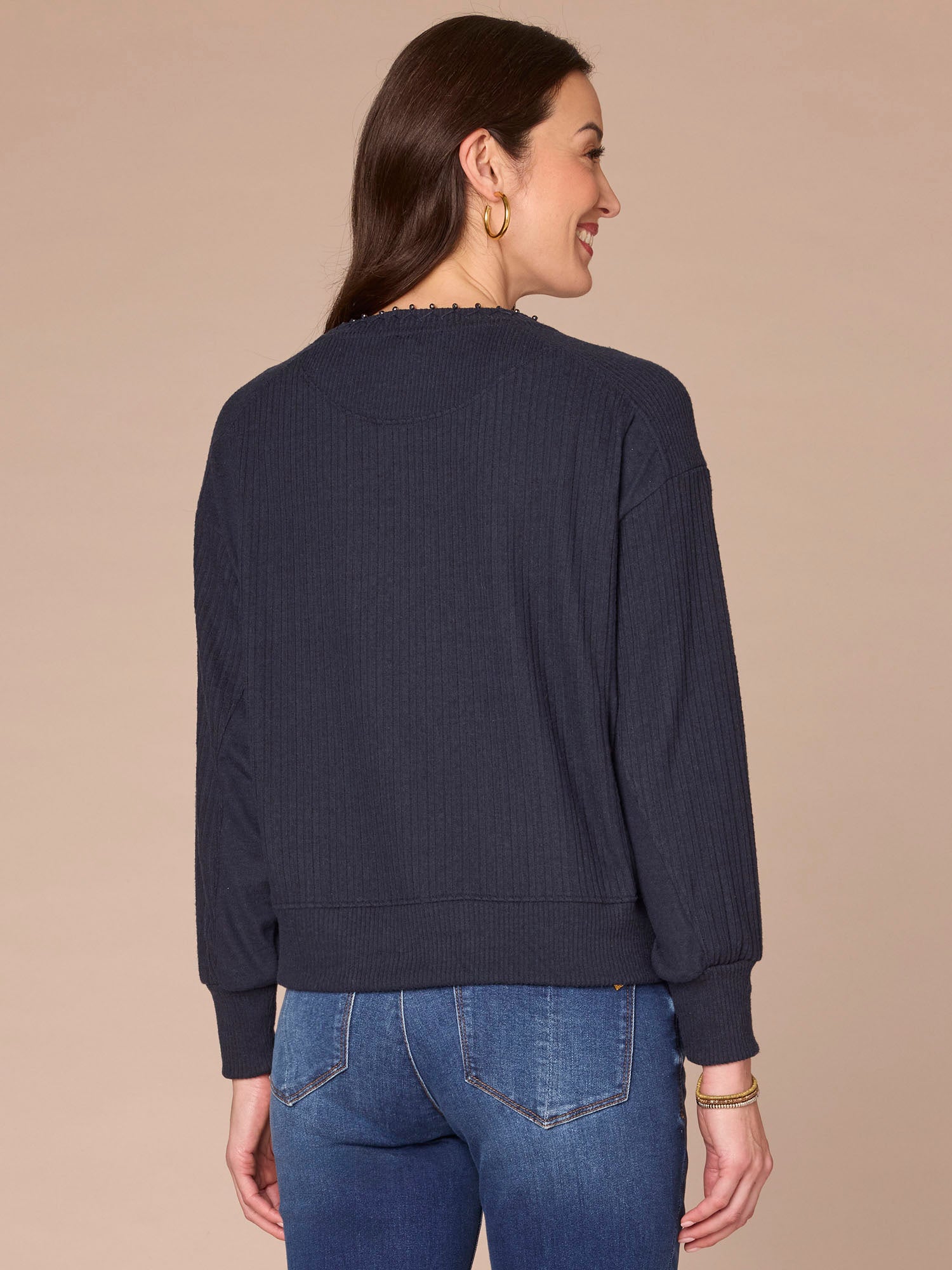 There’s no need to accessorize when you wear this mixed media knit top: the jewelry is built-in! This style has long dolman sleeves, a U-shaped back yoke, and a scoop neck adorned with a chic embroidered pearl detail.