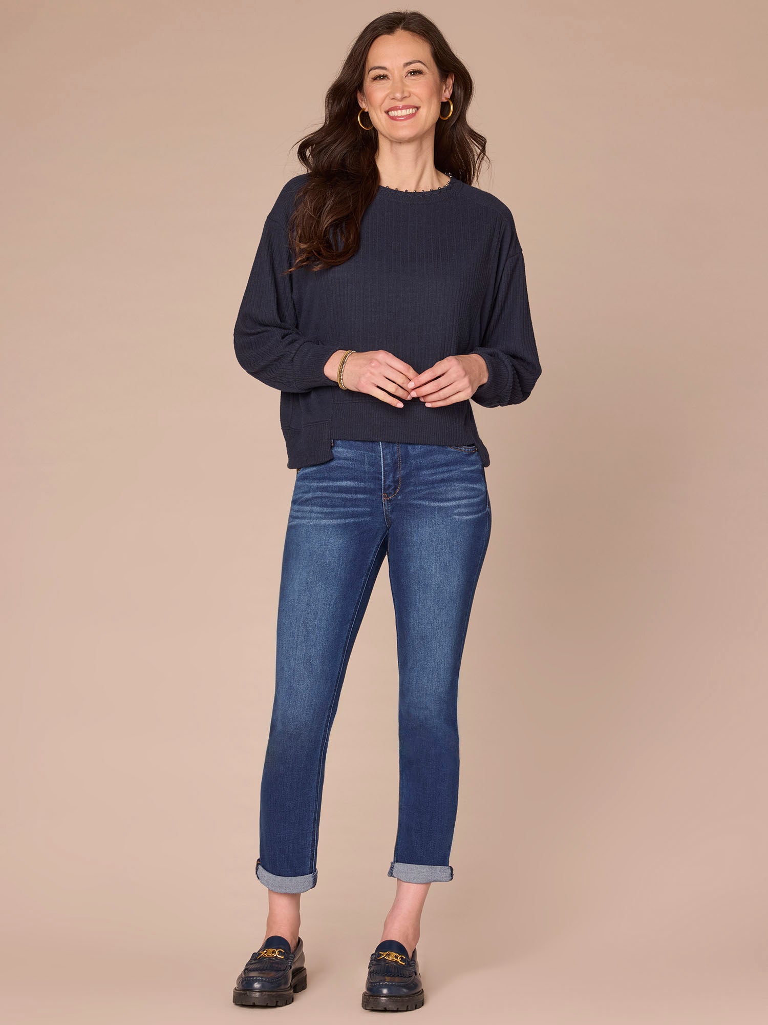 • Long banded dolman blouson sleeve