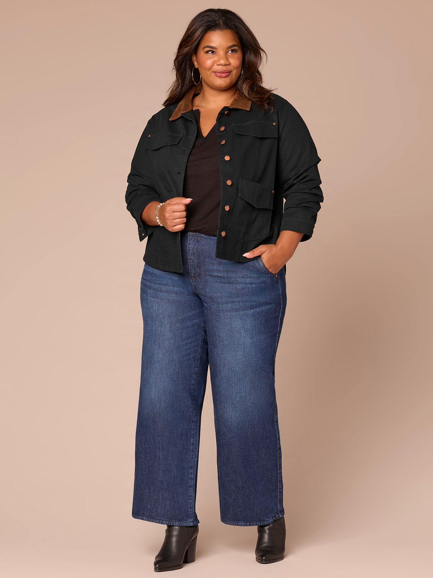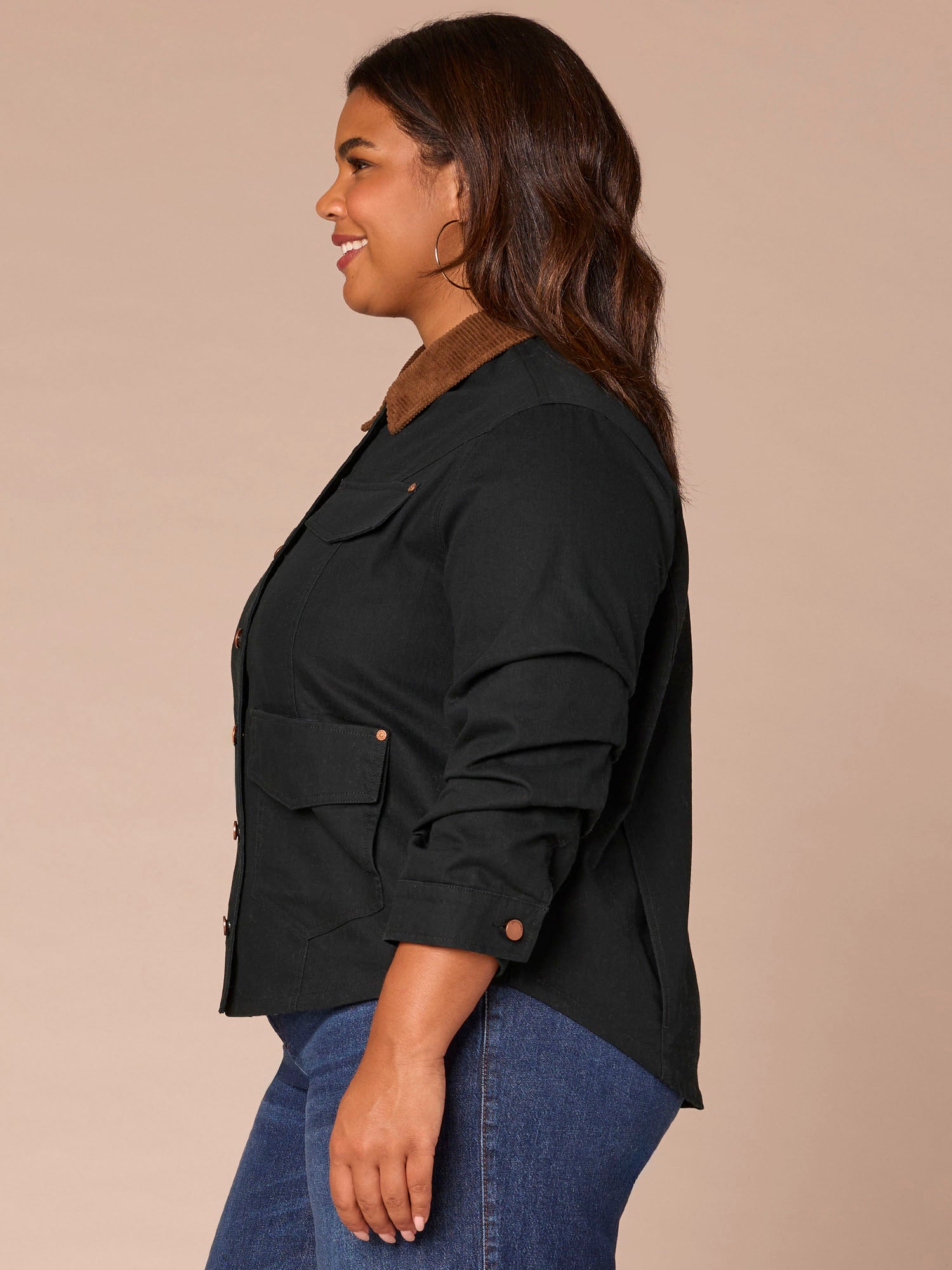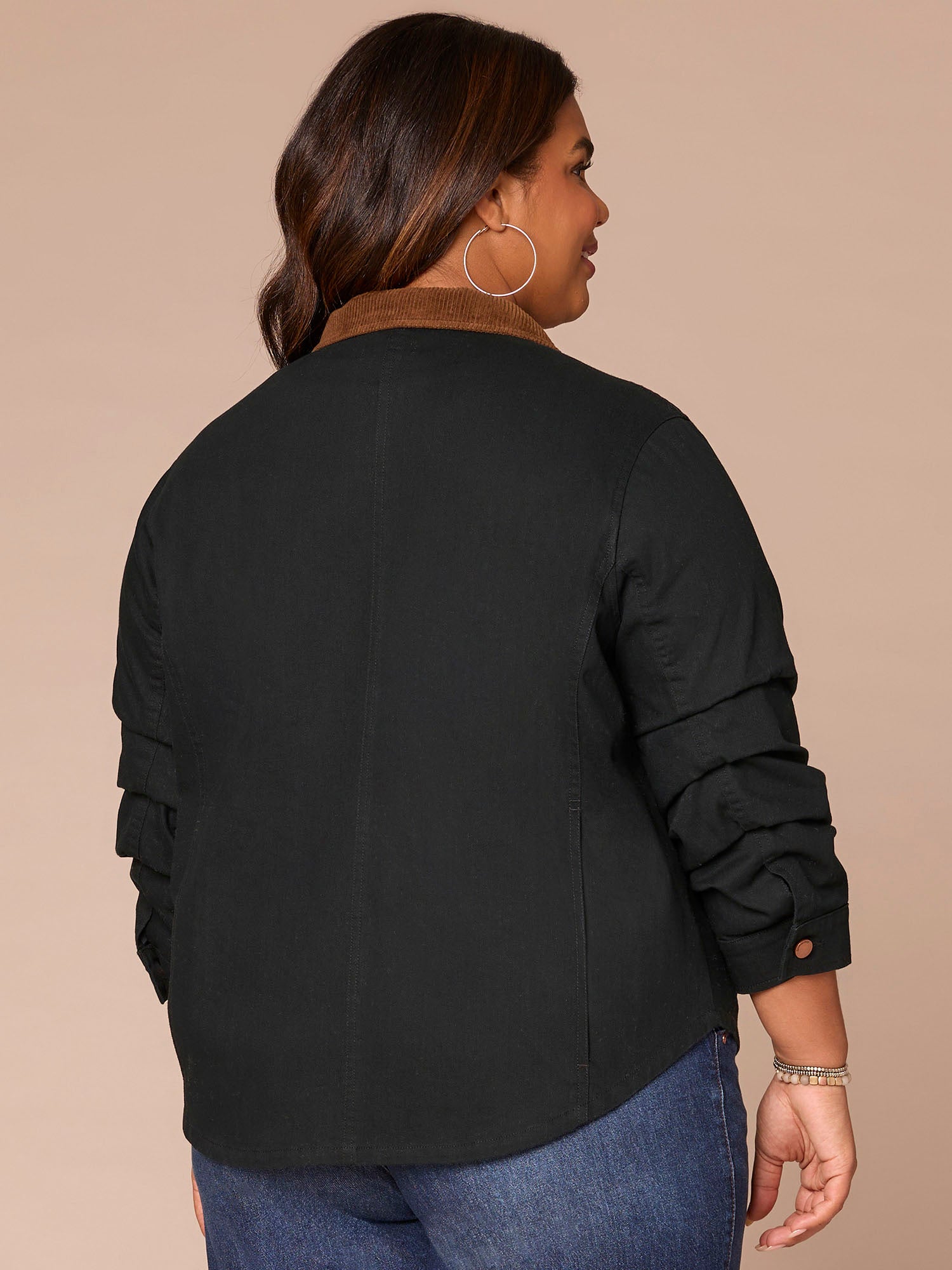 This mixed media barn jacket in plus sizing will be a year-round go-to. It’s designed with three quarter ruched sleeves, an on-trend corduroy contrast collar, drop-in pockets, a hi-low hem, and a green cast under tone, giving the black hue more depth.