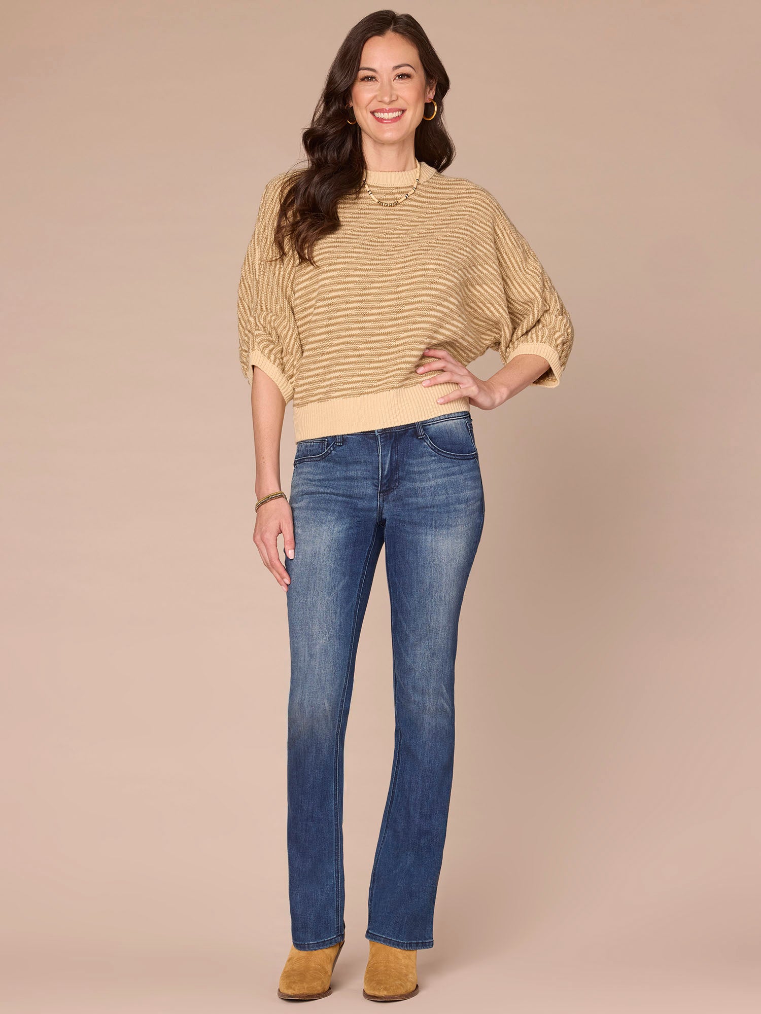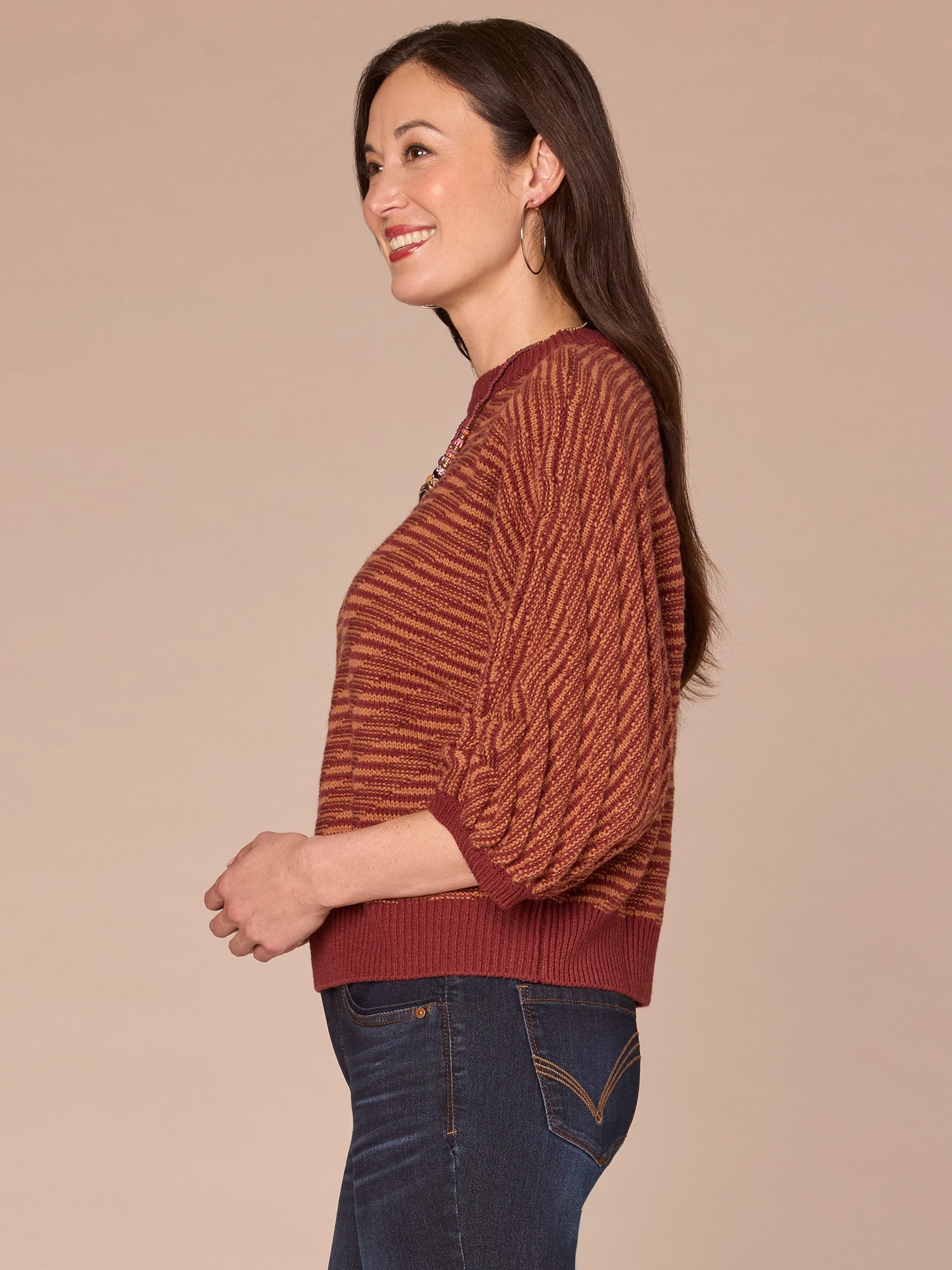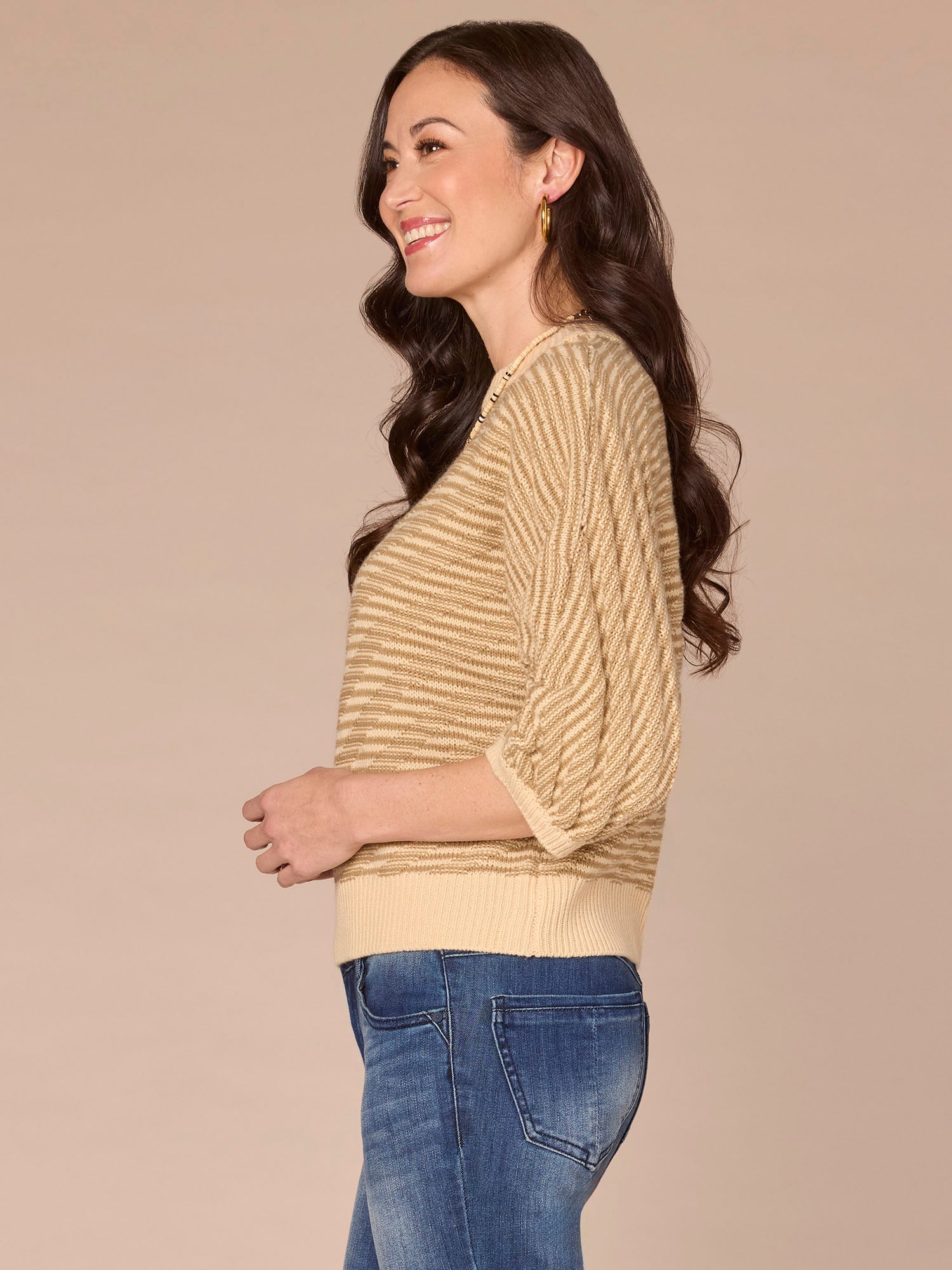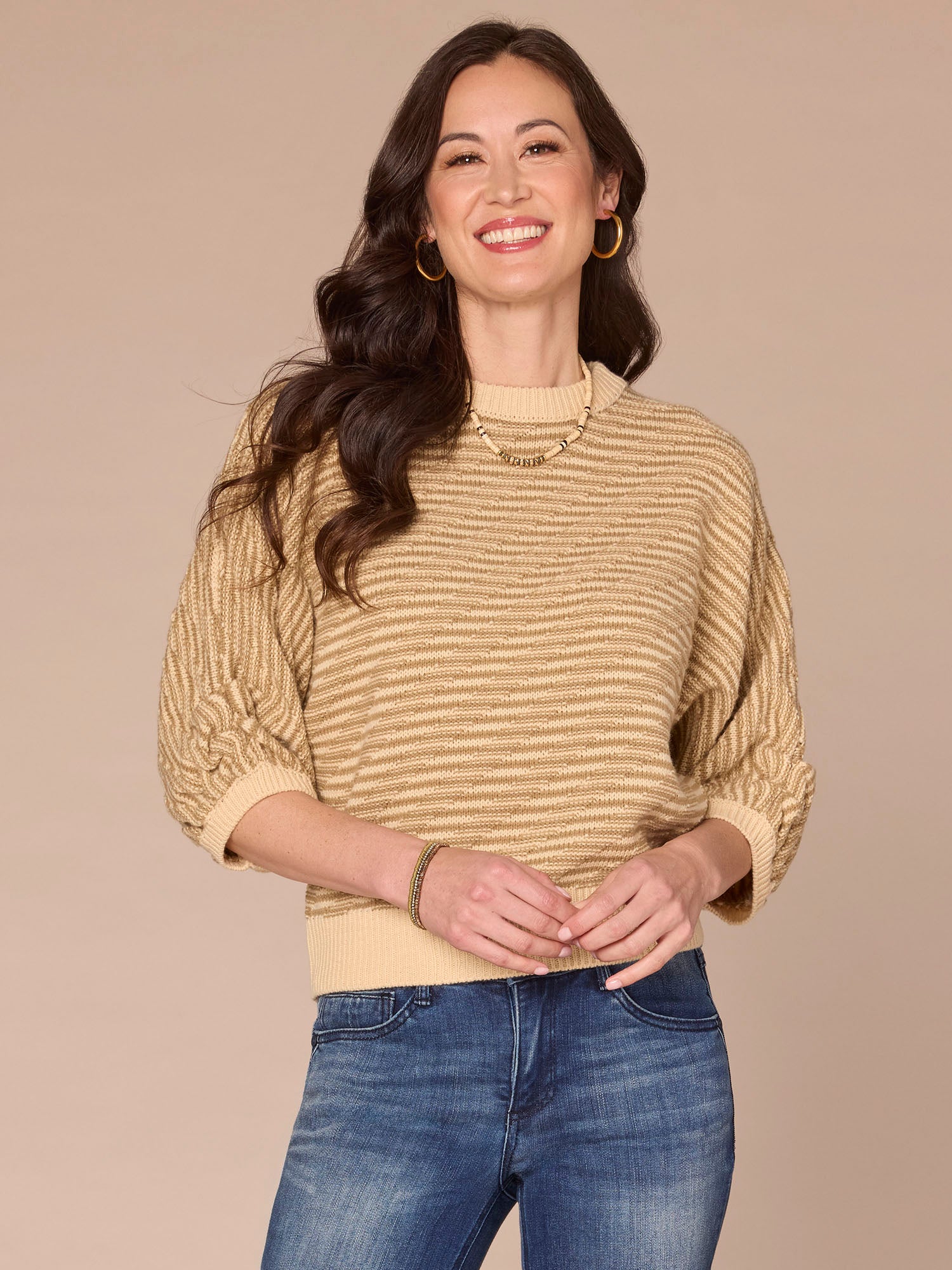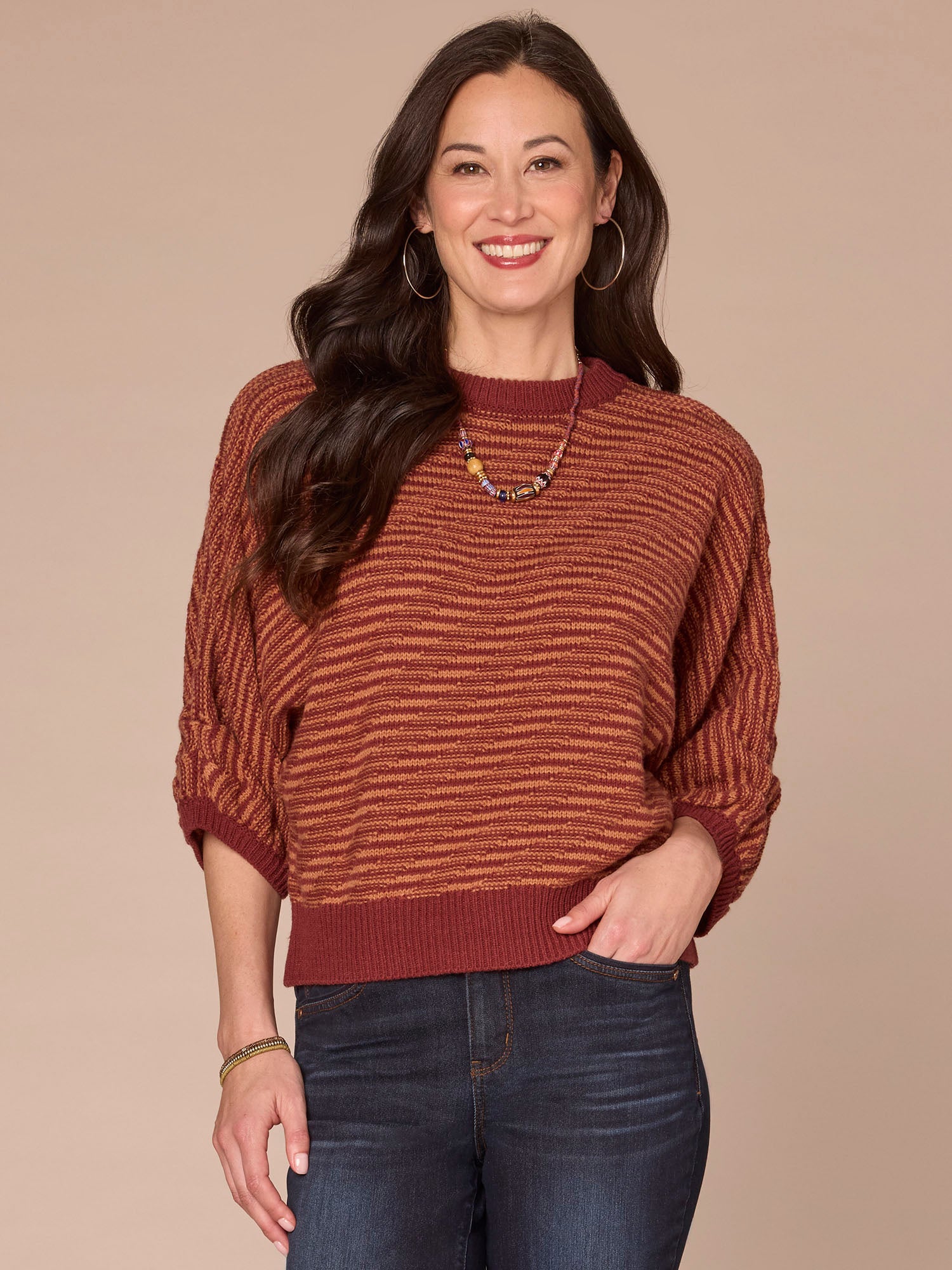 Basic, cozy, and ready for anything. This striped sweater features three quarter dolman blouson sleeves, a round neck, straight banded hem, and a bias stitch design.