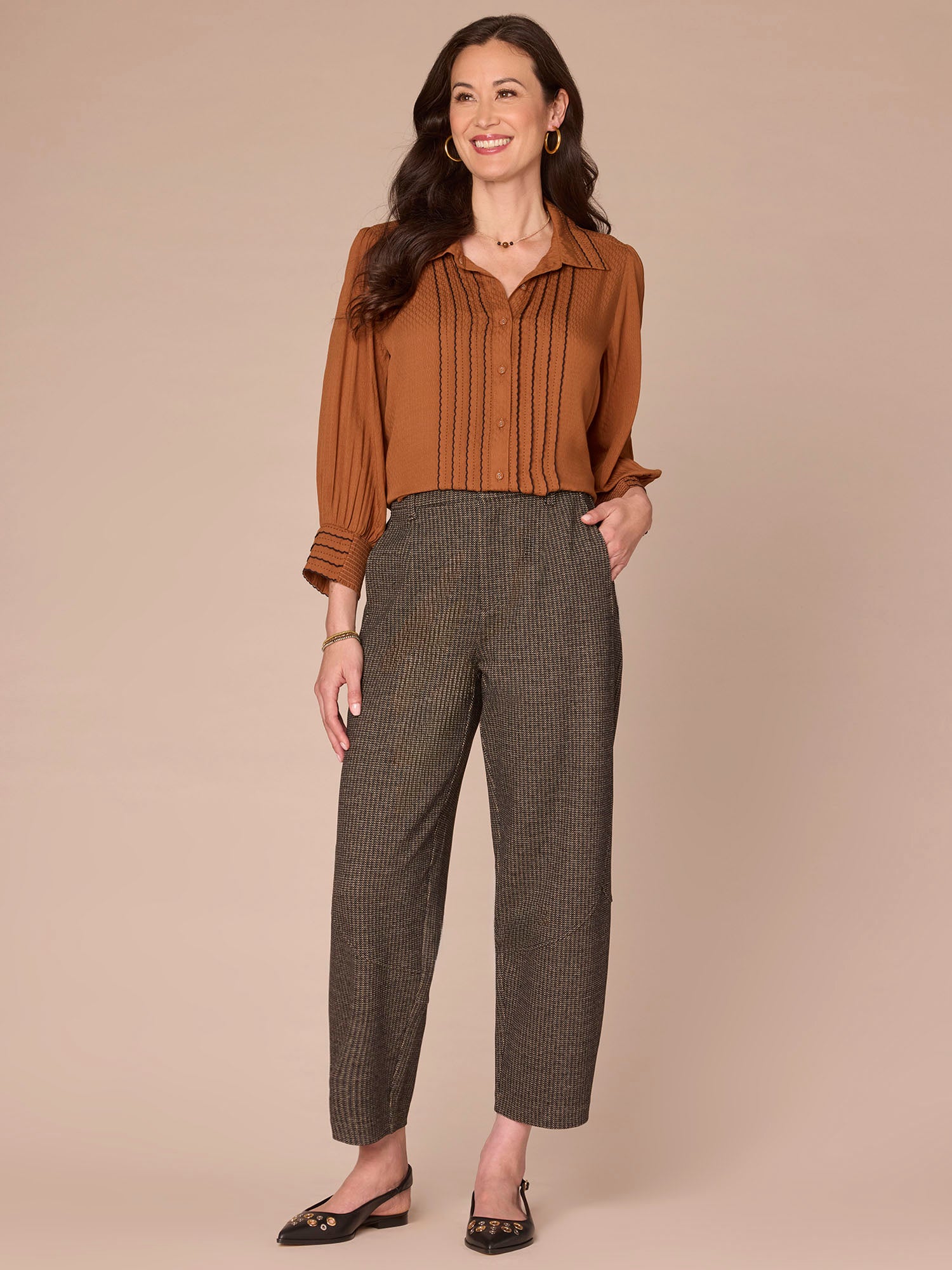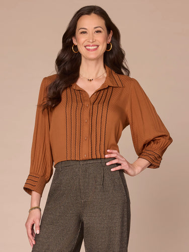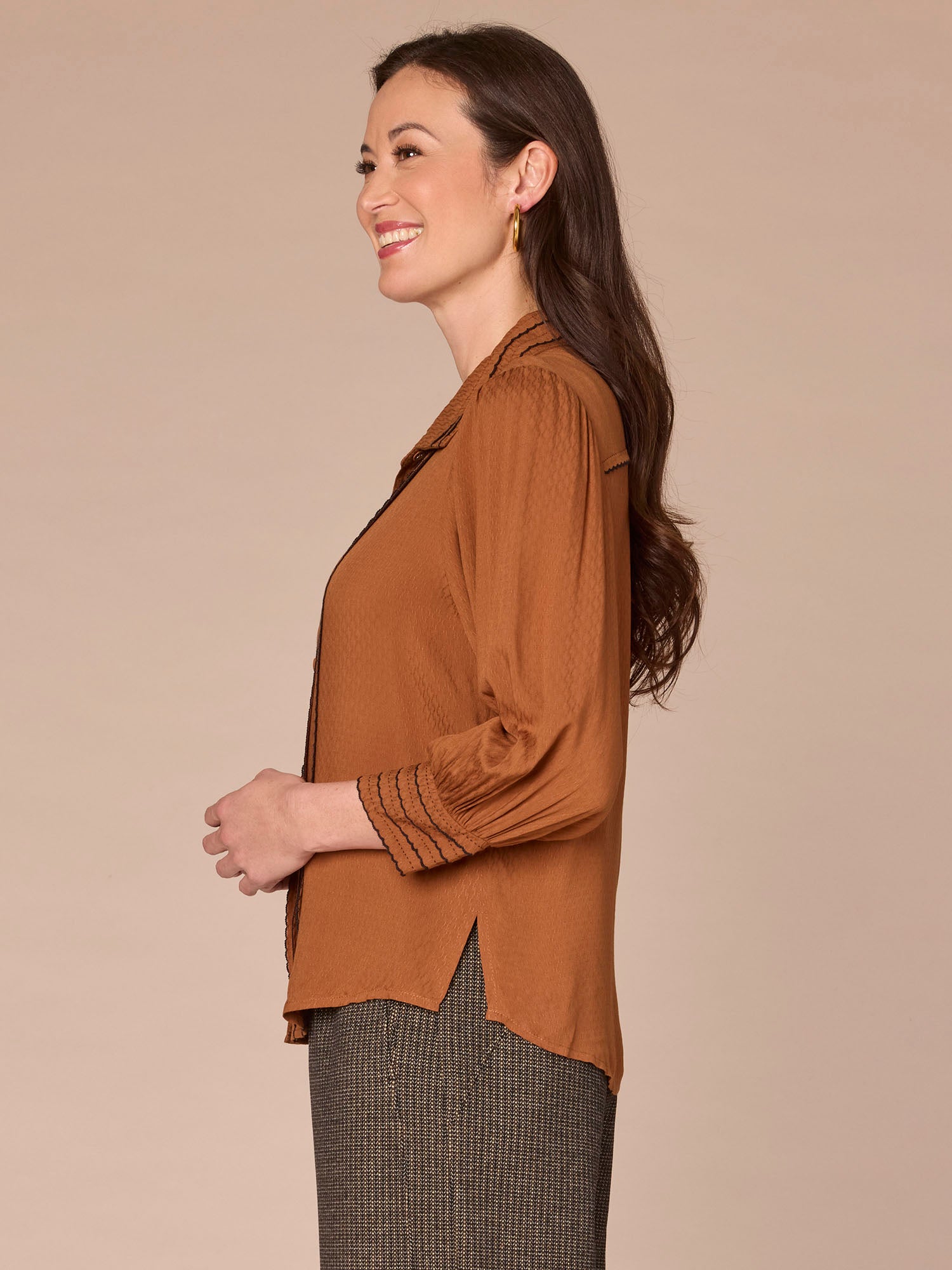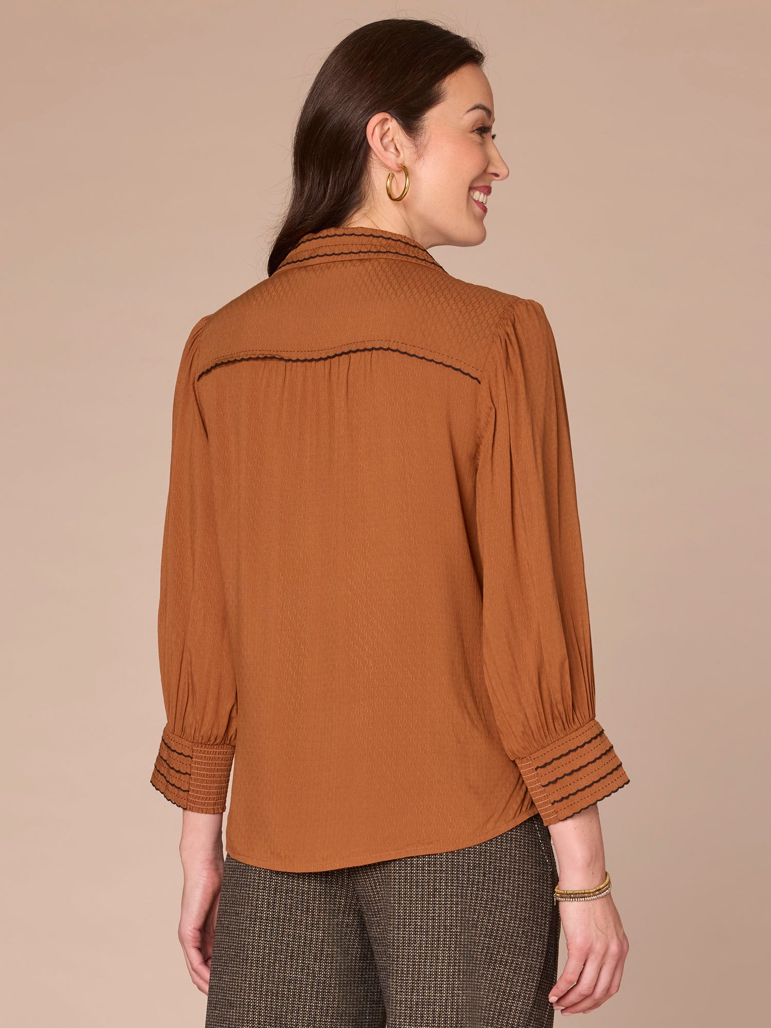 This woven button down shirt is all about the texture. It’s designed with a classic three quarter-length sleeve, collar neck, and a slit shirttail hem, but its scallop edge tipping detail is what takes this style up a notch.