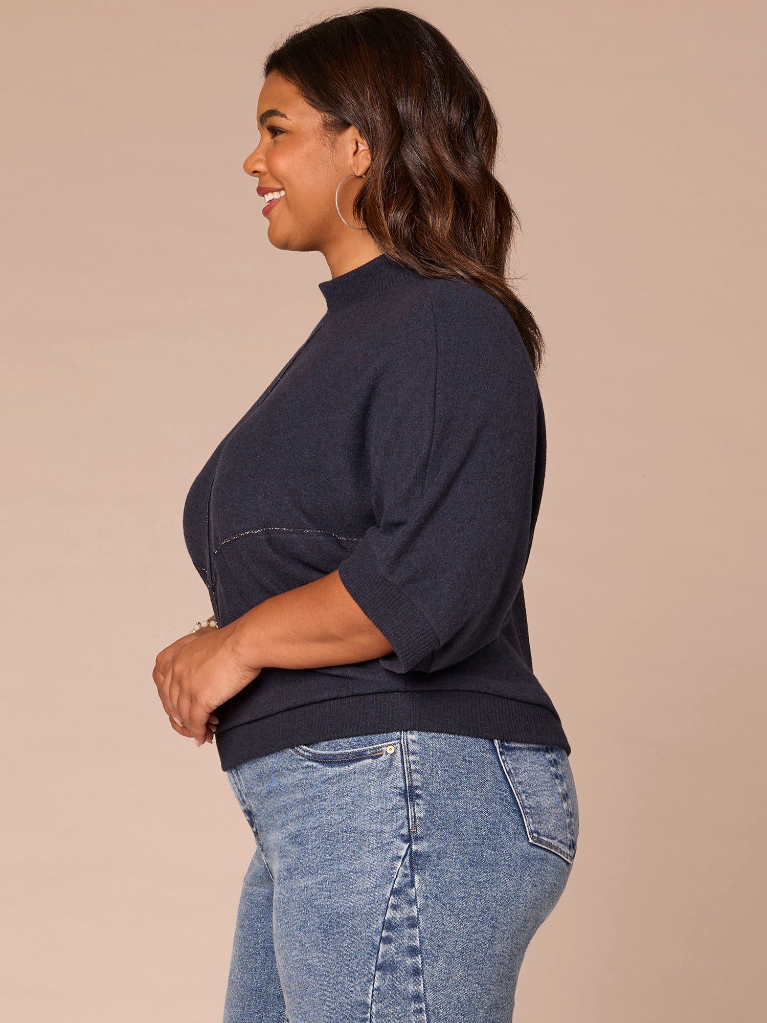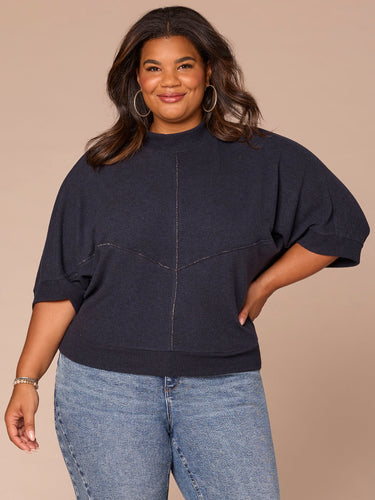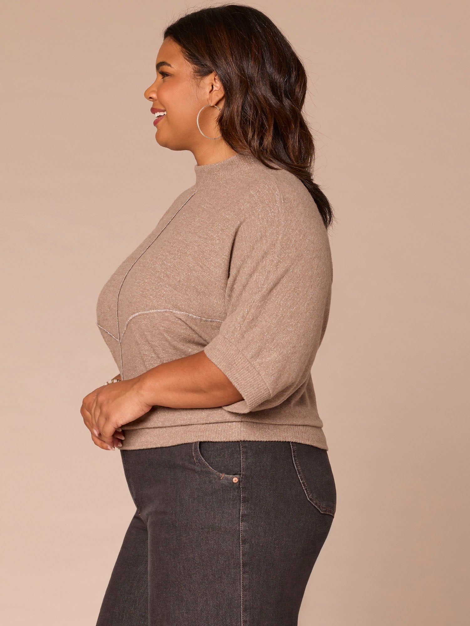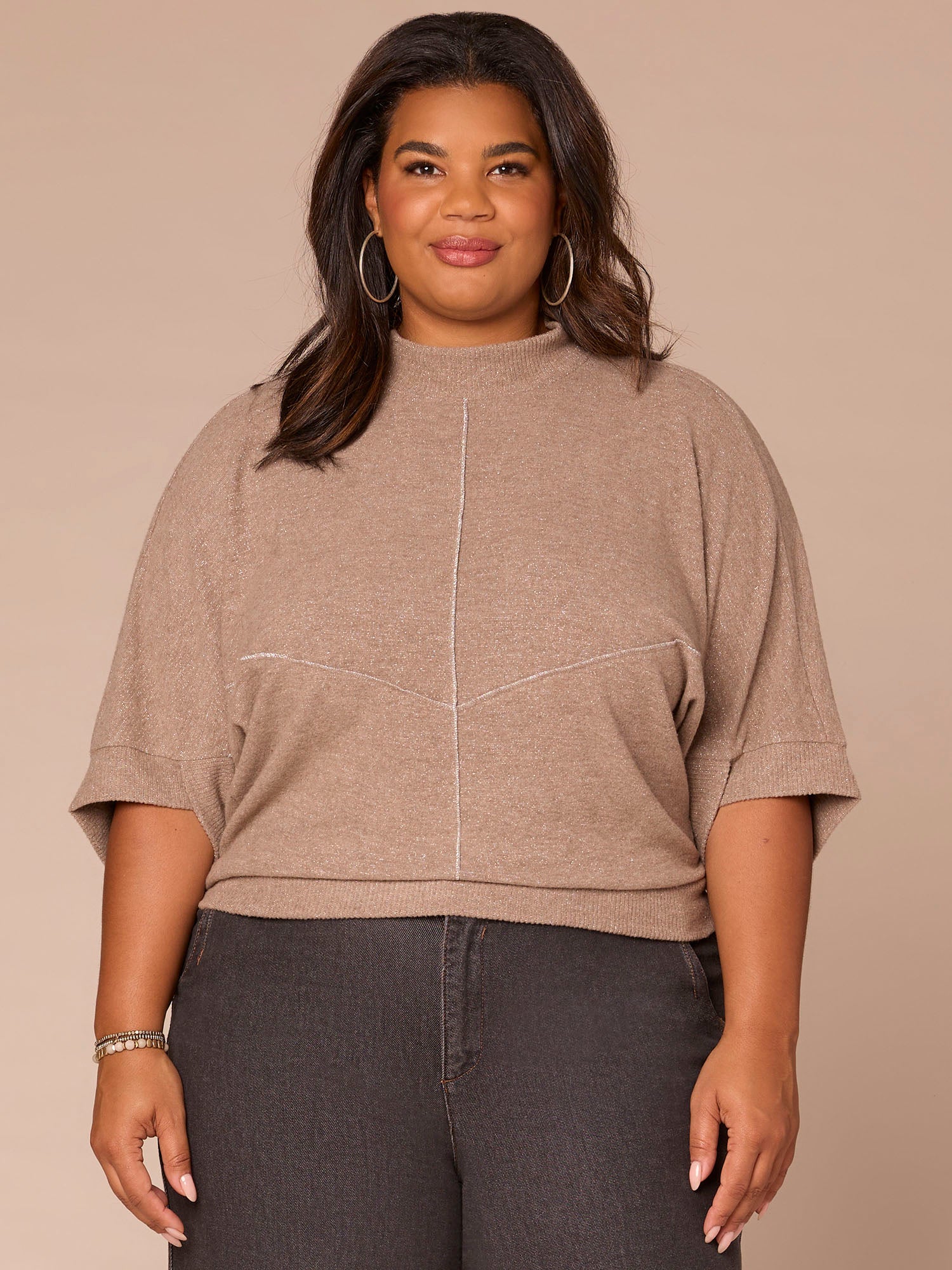 Some days, you need a little extra shine. This knit top in plus sizing has three quarter dolman sleeves, a mock neck, banded hem, and a subtle metallic seaming element.