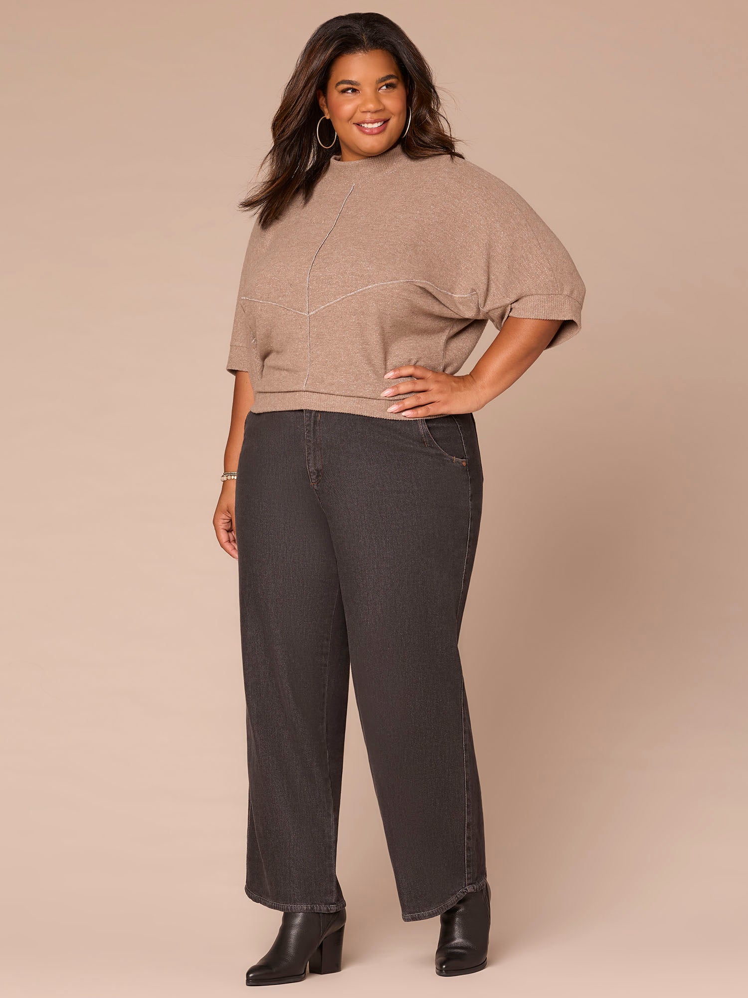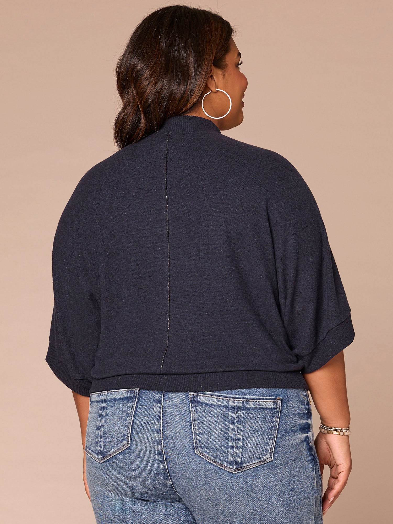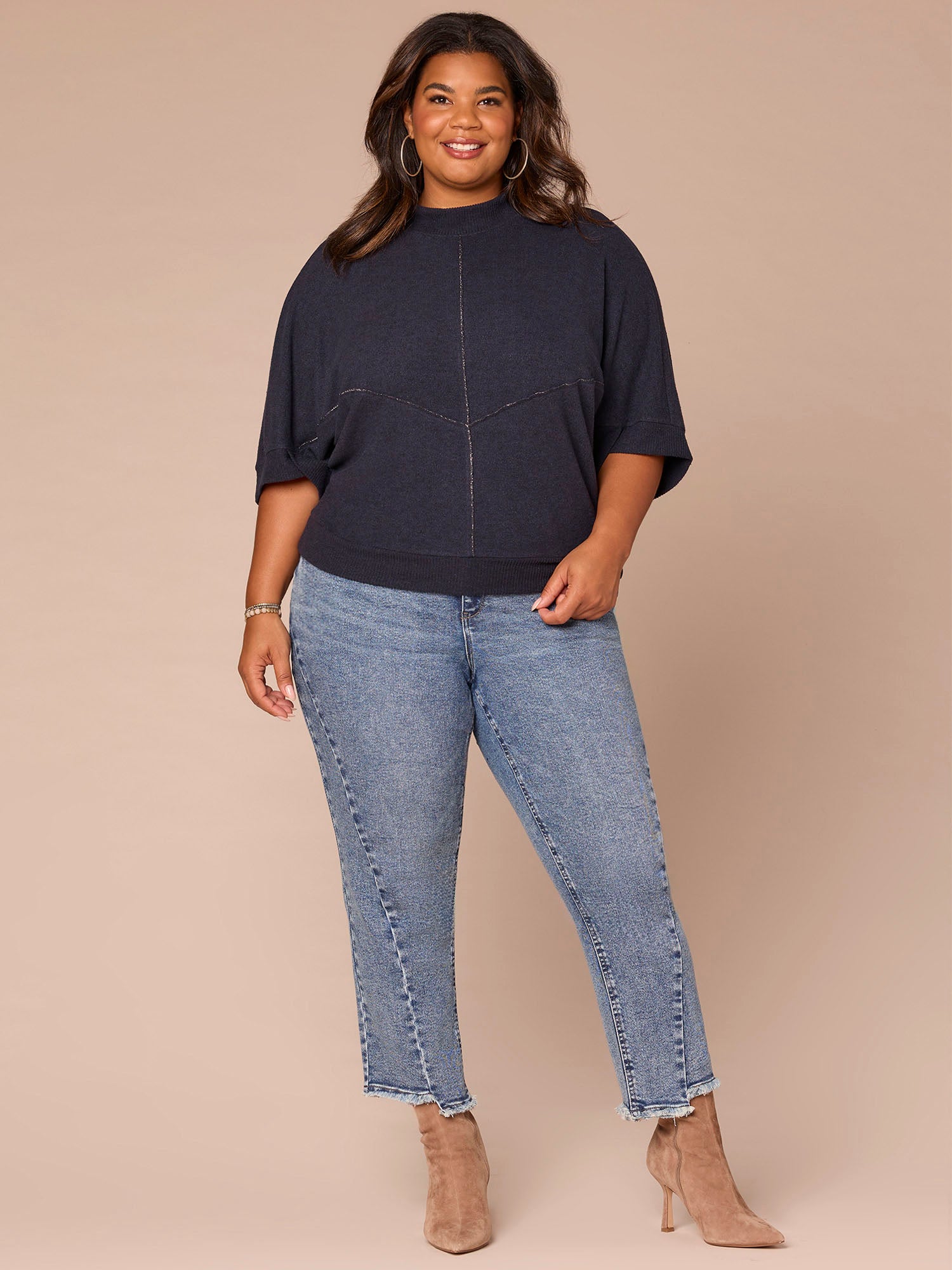 Some days, you need a little extra shine. This knit top in plus sizing has three quarter dolman sleeves, a mock neck, banded hem, and a subtle metallic seaming element.