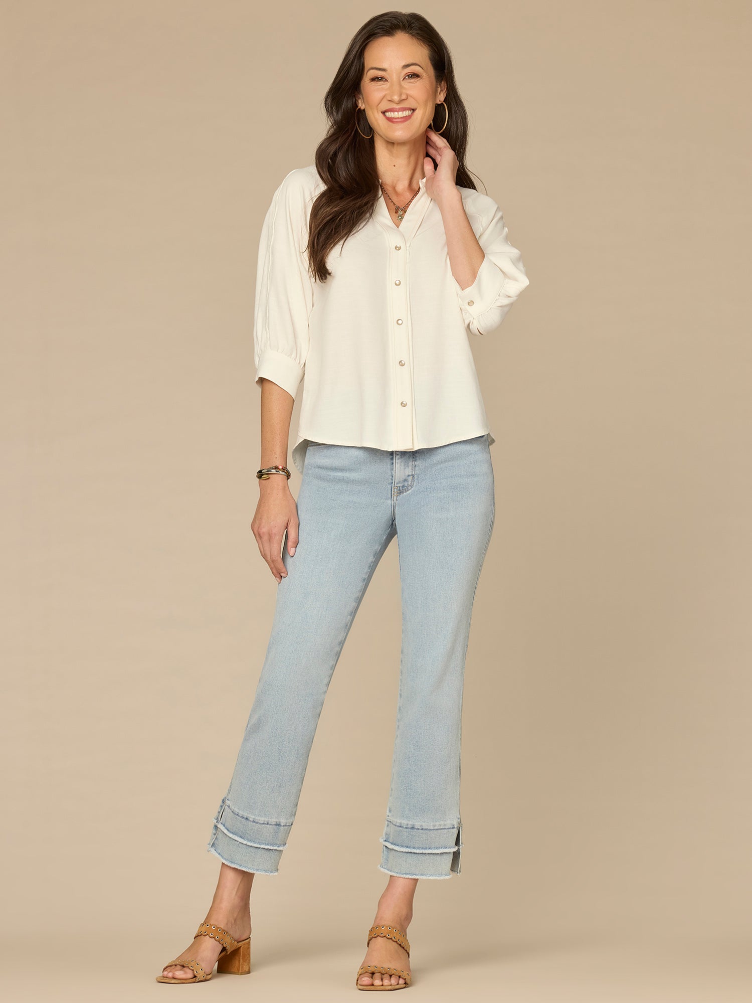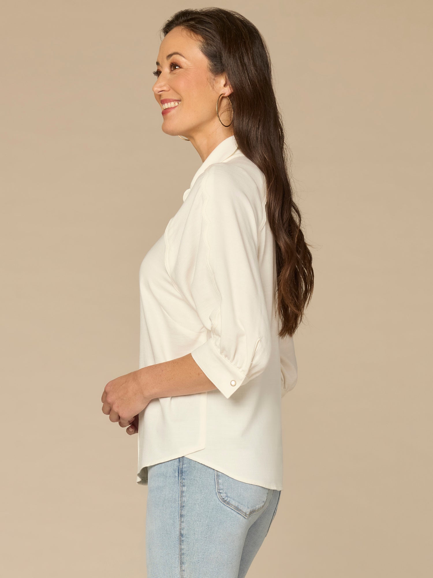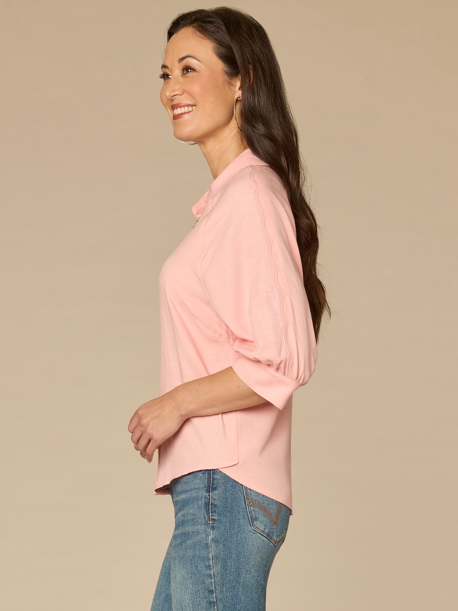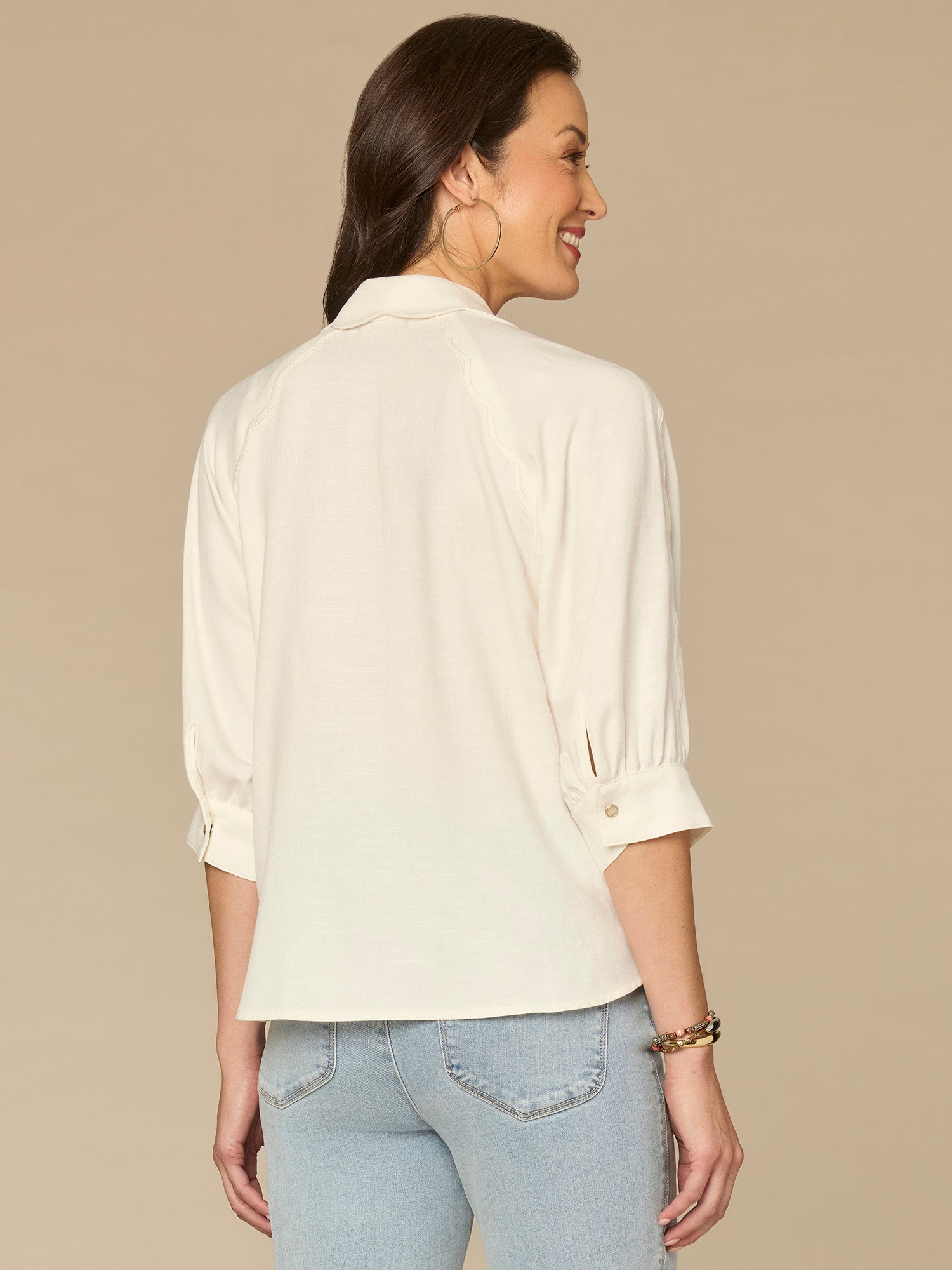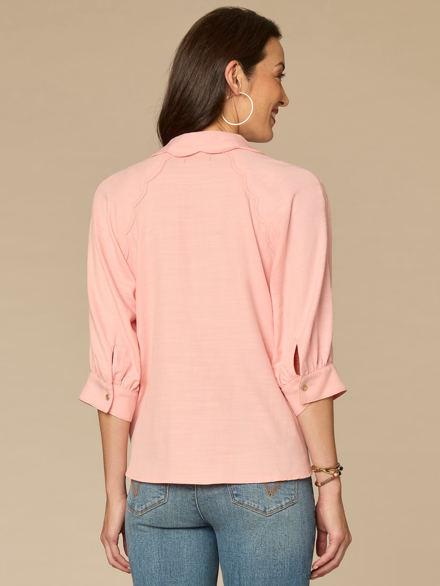 Below Elbow V-Neck Snap Front Woven Shirt with Scallop Edge Detail