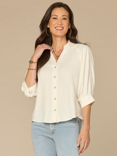 This woven snap button down shirt is a softened classic. It has below elbow sleeves, a collared V-neck, and contrast scallop seaming for a modern touch.