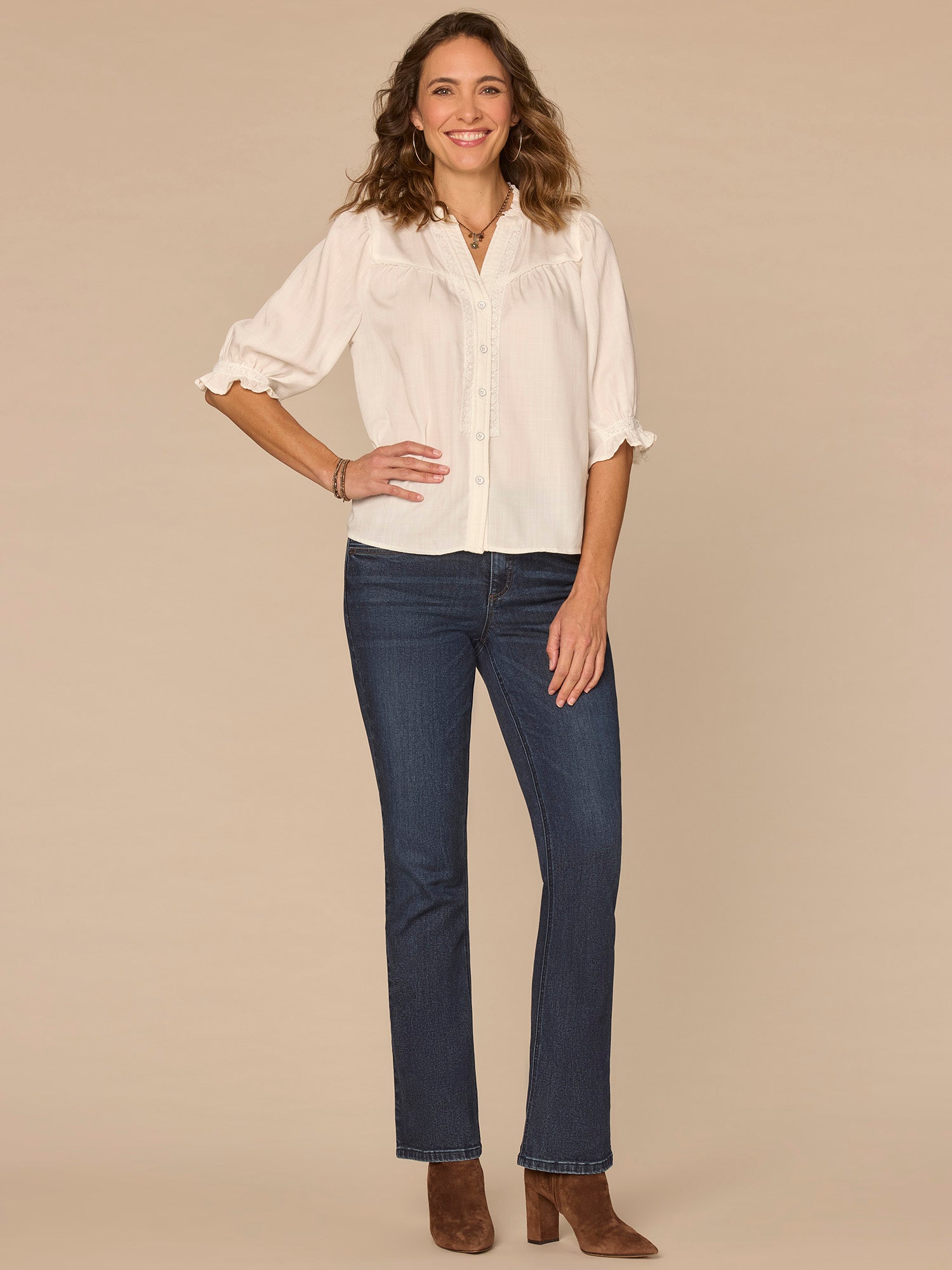 With this feminine woven top in plus sizing and a pair of Bootcut jeans, you’ll be full-on Western chic. This stylish piece has below elbow sleeves, a ruffle edge collar and V-neck, button down front with a crochet inset, and an angled placket.