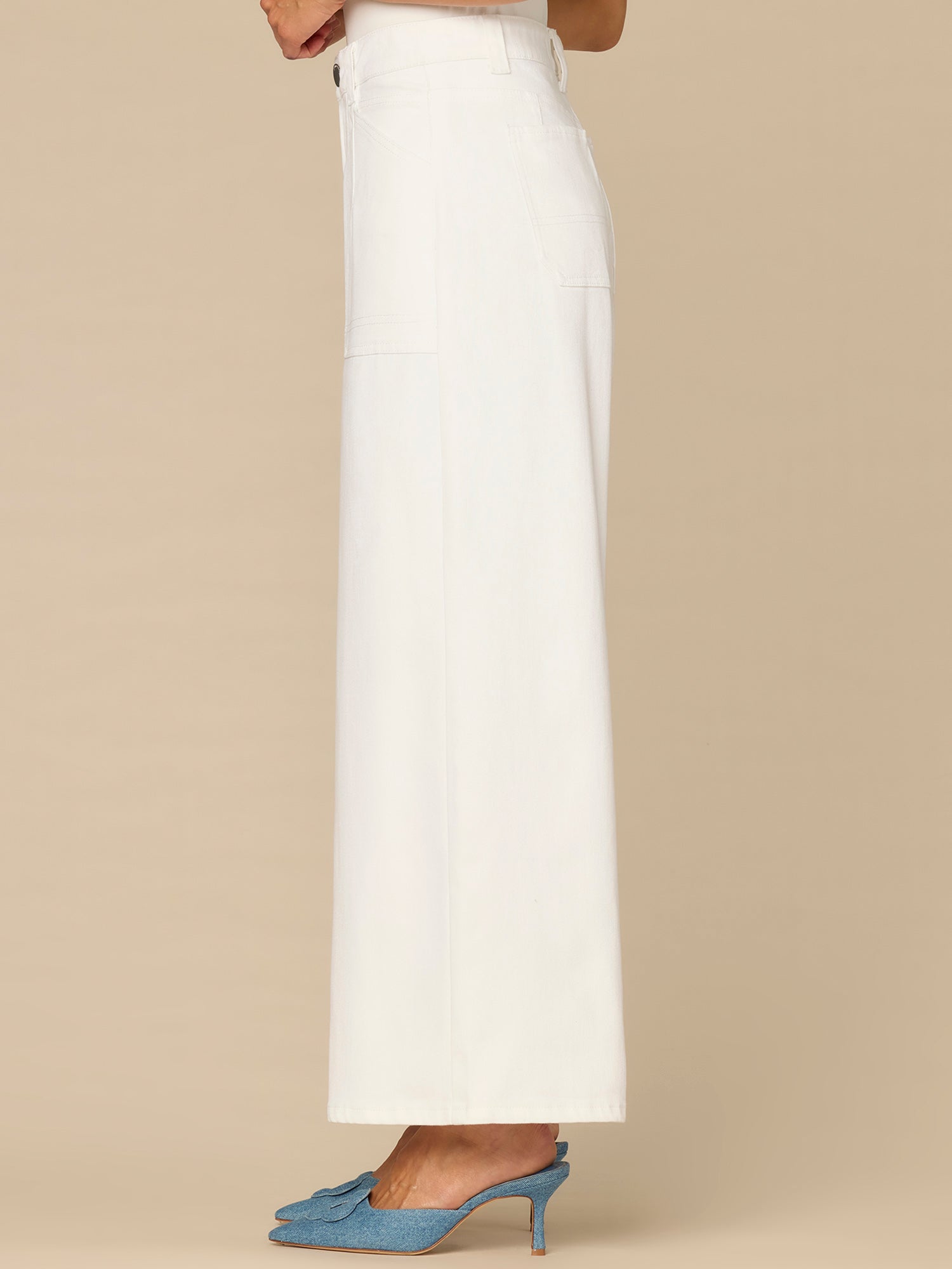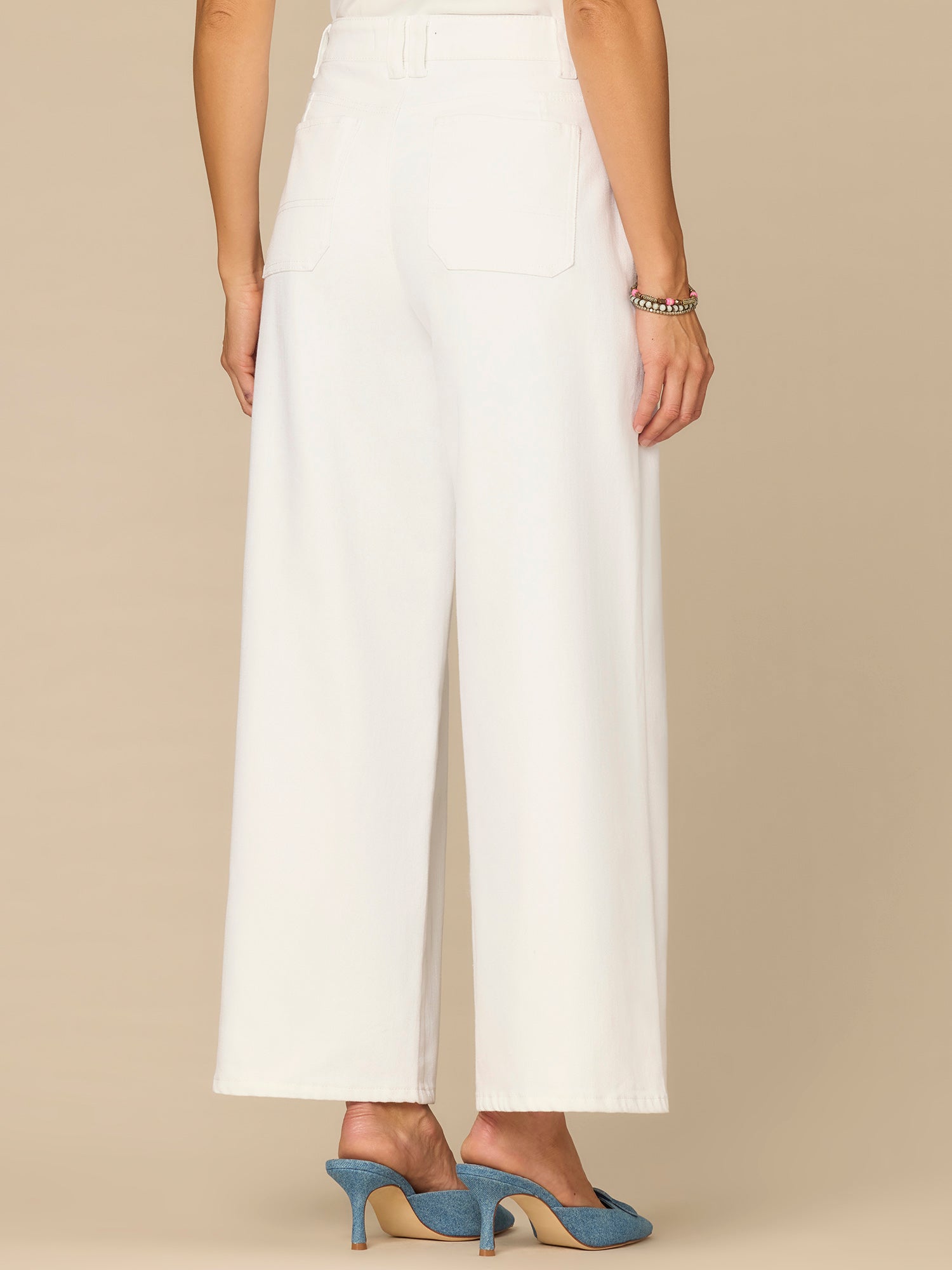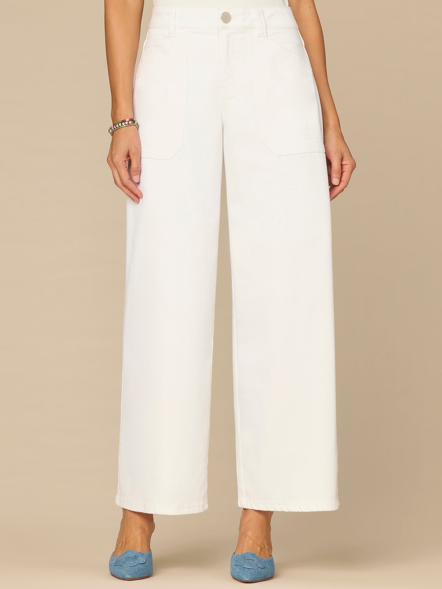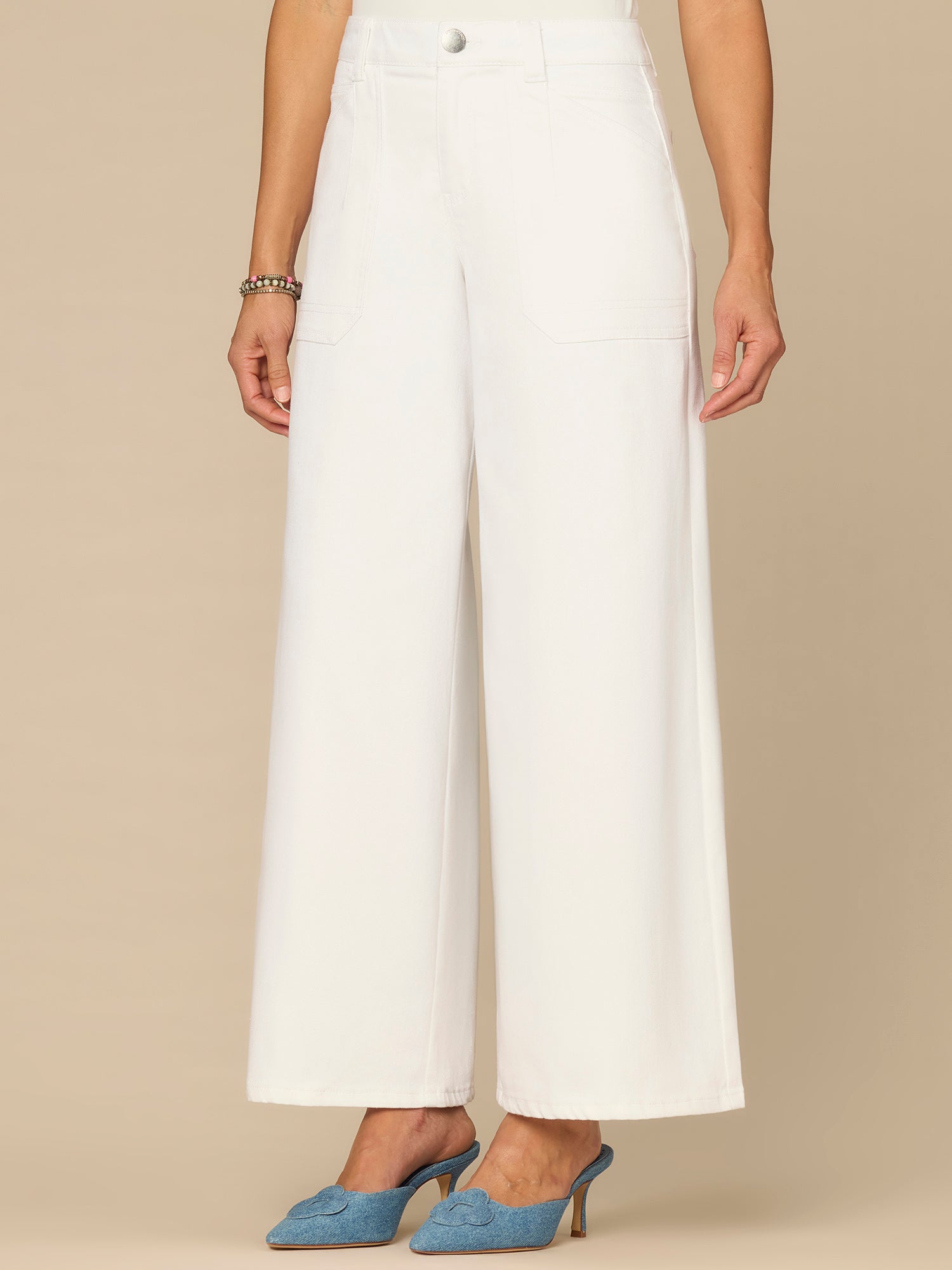 The white Wide Leg jean in petite sizing is fitted through the hips with a relaxed, wide opening through the legs. Engineered with utility pockets and "Ab"solution® fit technology to smooth, support, and enhance your shape—giving you everything from a flatter tummy to a perkier rear view. Made with recycled REPREVE® materials for a greener solution.