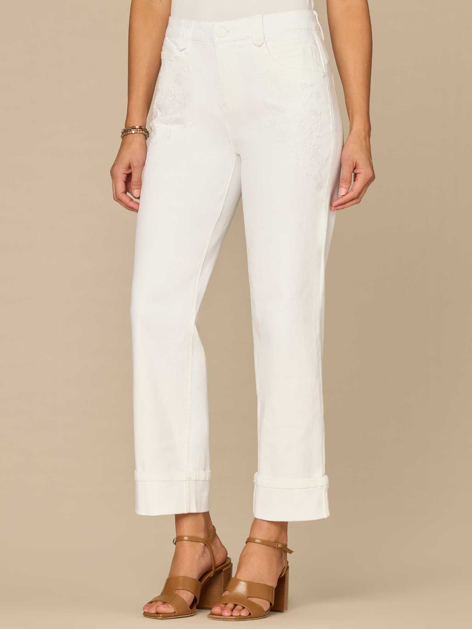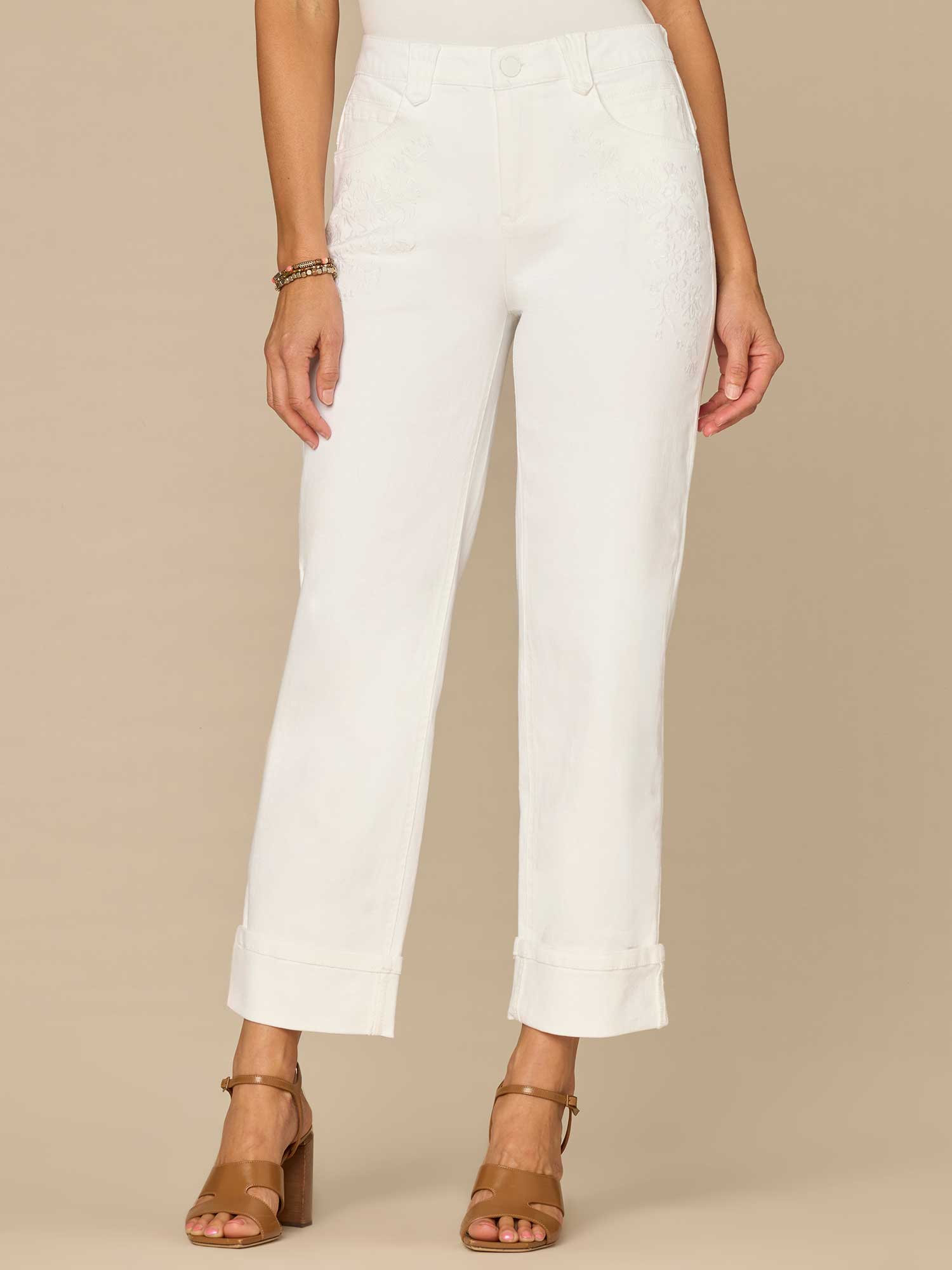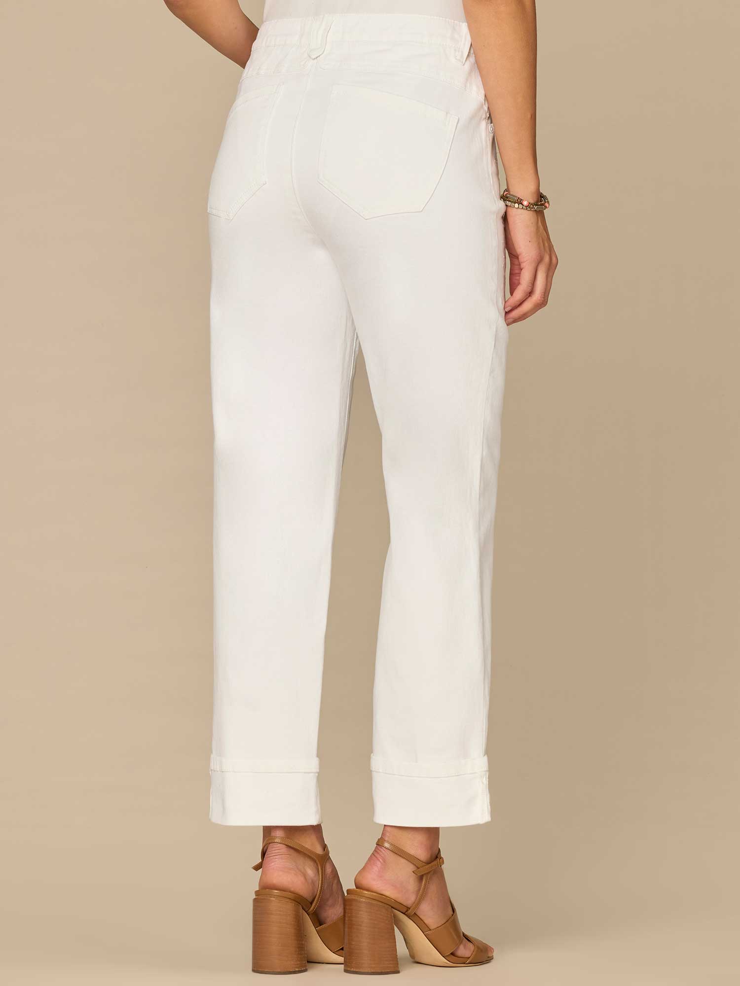 Our Boyfriend pant in optic white is fitted through the hips with a more relaxed (think slightly slouchy) fit from the mid-thigh to the leg opening. Wear them cuffed or unrolled for an even more relaxed look. Engineered with embroidered pockets, a roll cuff, and "Ab"solution® fit technology to smooth, support, and enhance your shape—giving you everything from a flatter tummy to a perkier rear view.